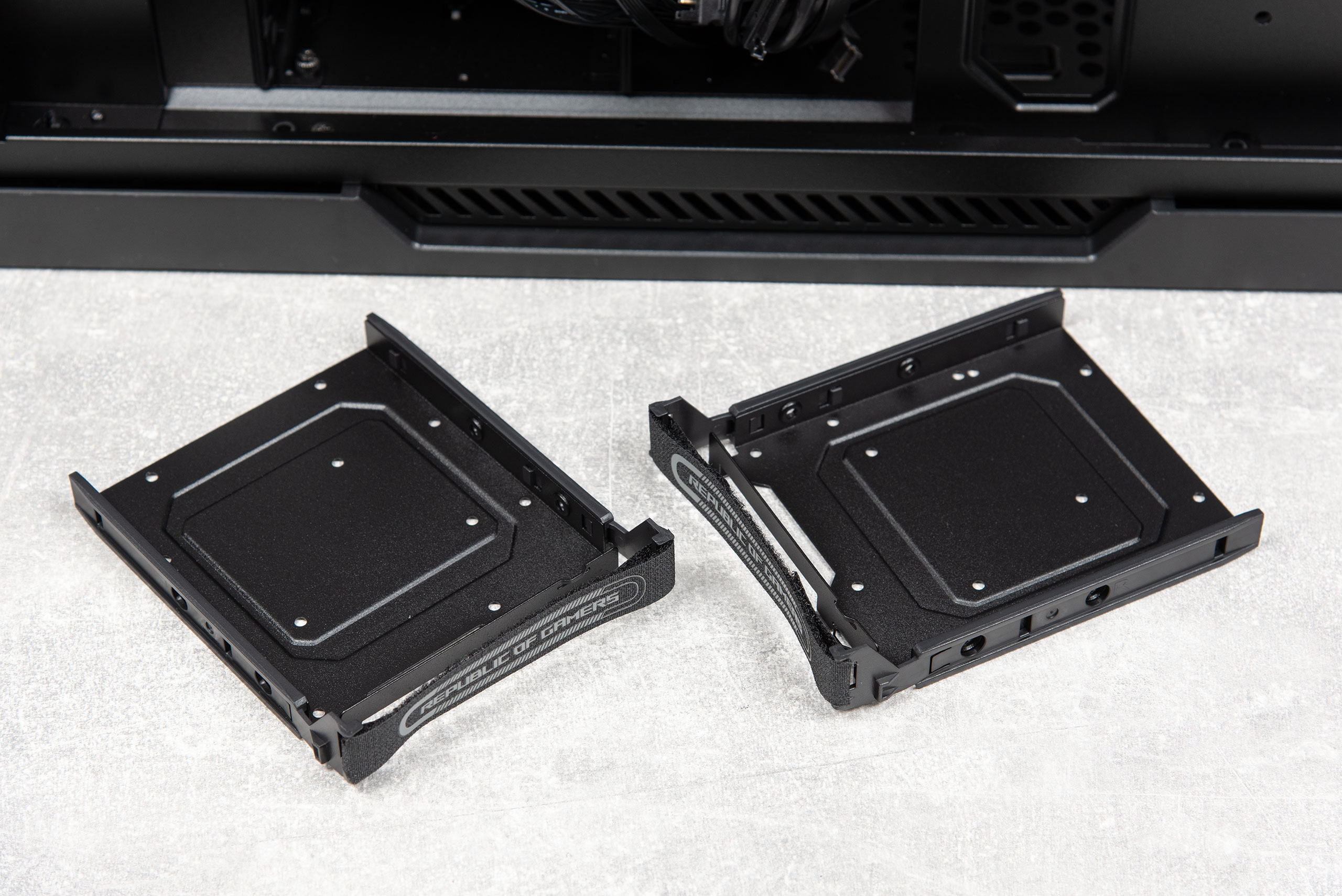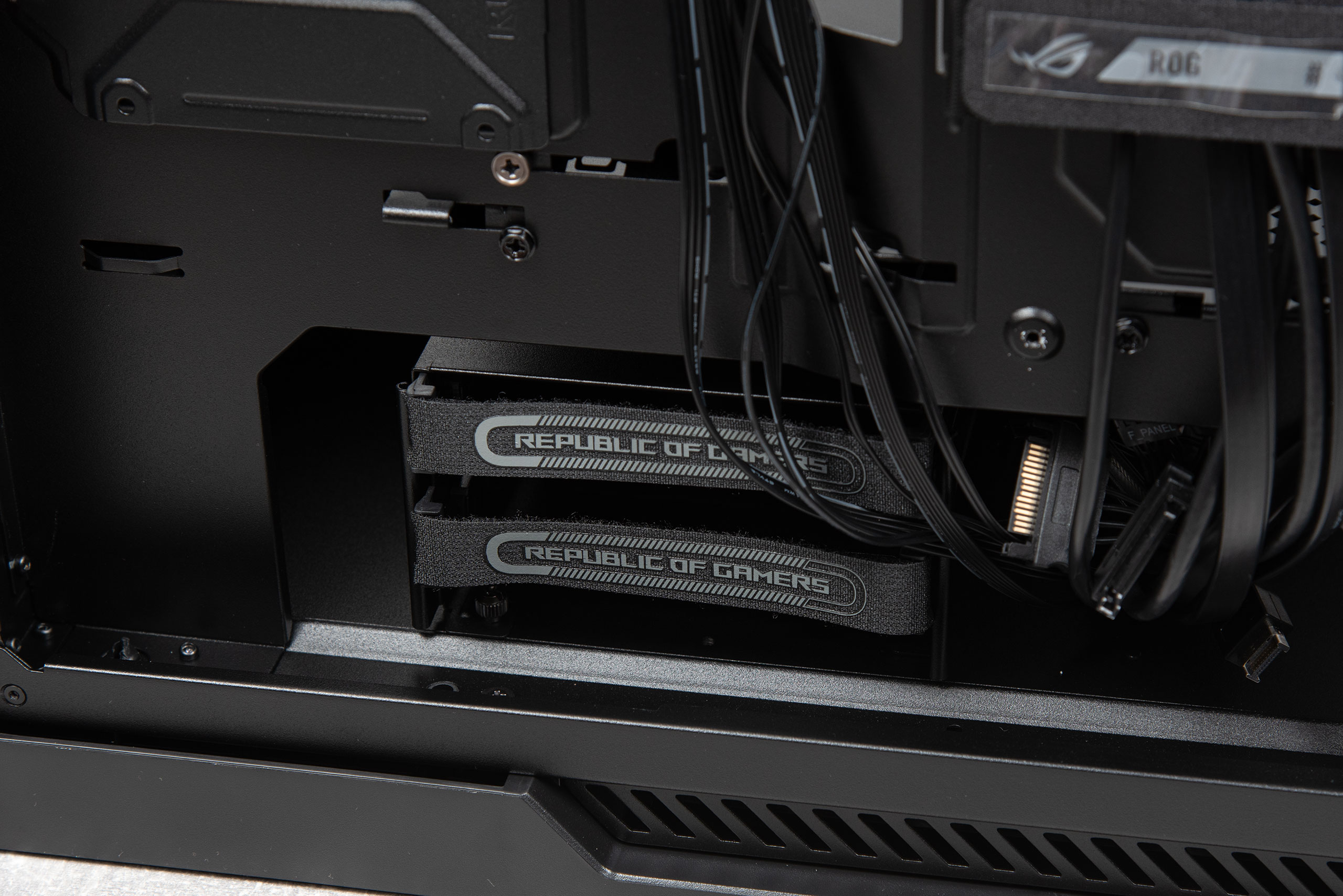 В передней части шасси установлена корзина для двух накопителей 3,5 или 2,5 дюйма. Лотки для них оснащены «ручками» из липучек, которые дополняют общий стиль корпуса, но становятся не очень удобными, когда нужно быстро извлечь накопитель из корзины. Еще четыре лотка для 2,5″ находятся на боковой части шасси. Возле них организован кабель-менеджмент из стяжек-липучек. Пространство в 30 мм между поддоном материнской платы и боковой панелью позволяет аккуратно разместить все кабели и провода.