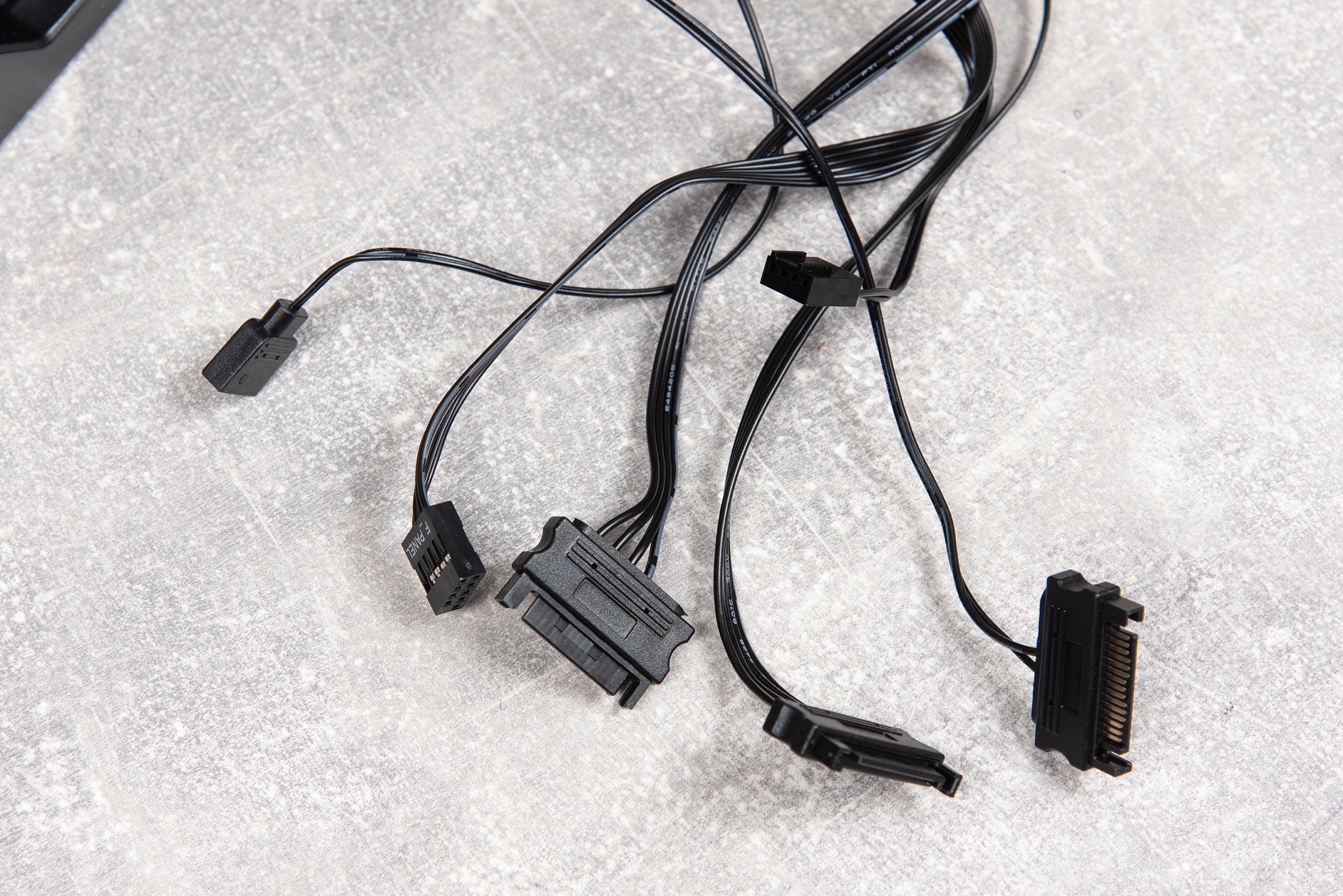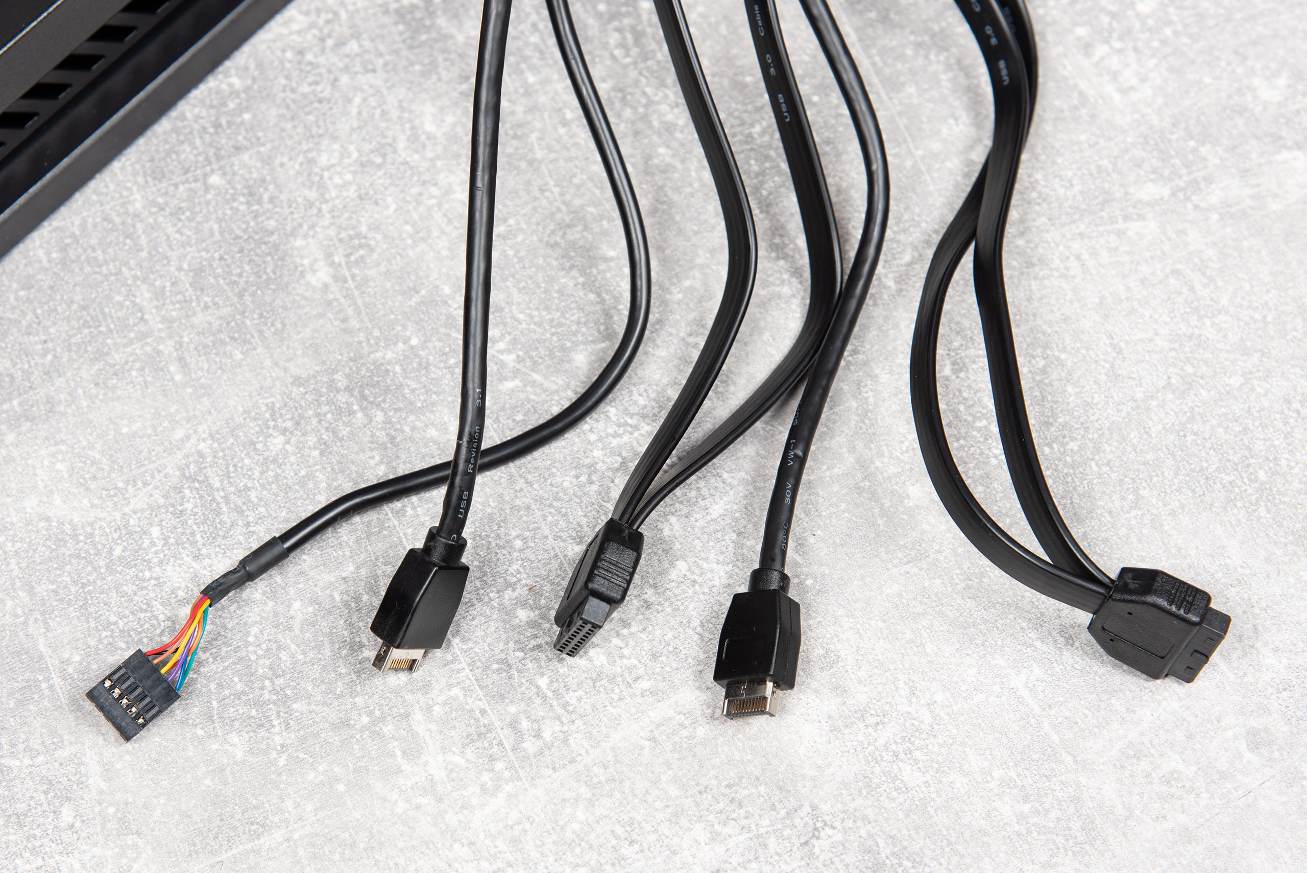 А их даже у самого корпуса здесь превеликое множество: два USB 3.2 Gen1 Type‑A, два USB 3.2 Gen2x2 Type‑C, один аудио-кабель, один общий для кнопок и индикаторов, один для управления вентилятором, один для ARGB-подсветки и три кабеля питания SATA Power.