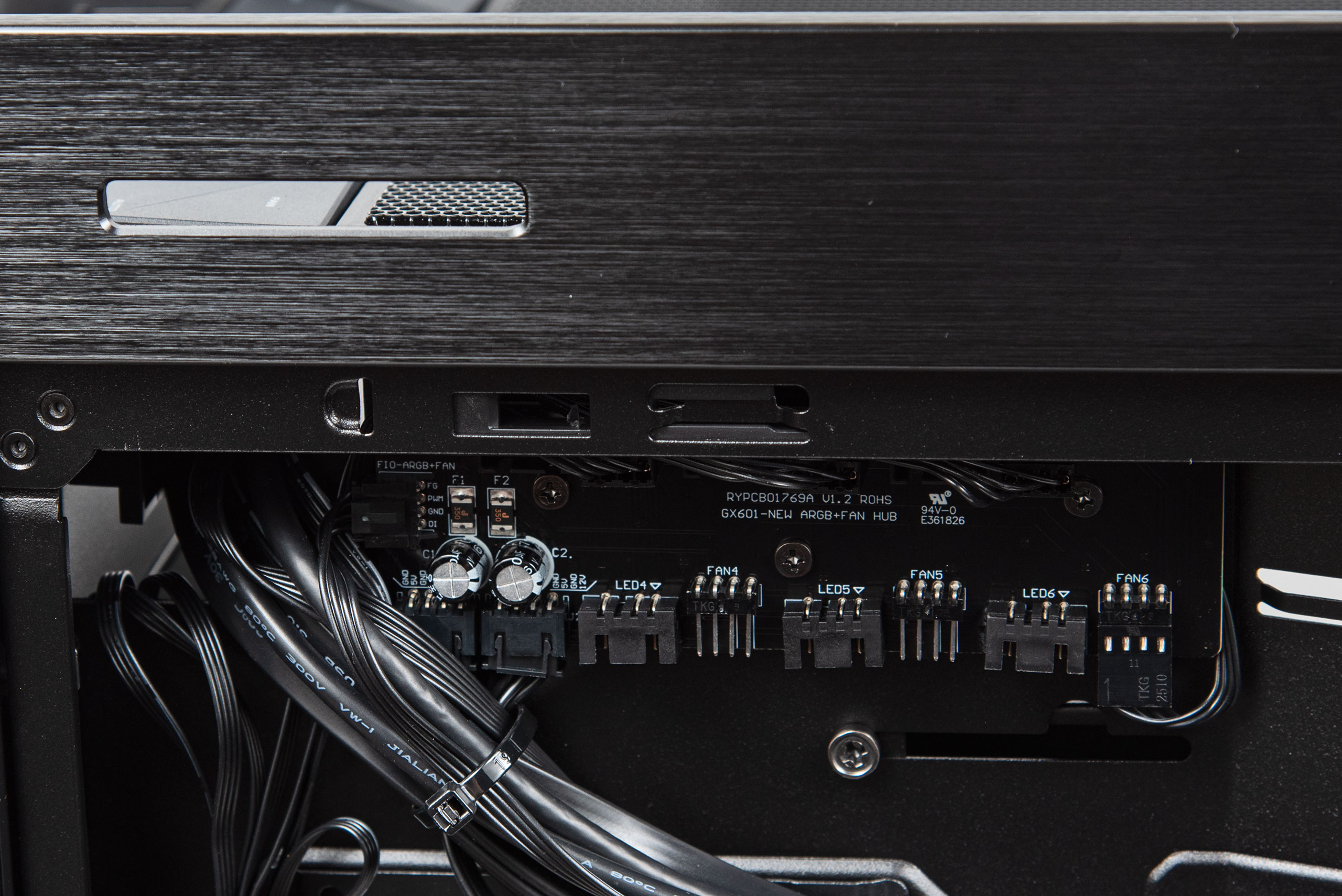 Все вертушки подключены к хабу, который позволяет подключить еще два вентилятора с ШИМ-управлением и RGB-подсветкой, в итоге шесть штук в общей сложности. У нас вентиляторы без подсветки, поэтому соответствующие разъемы не задействованы.