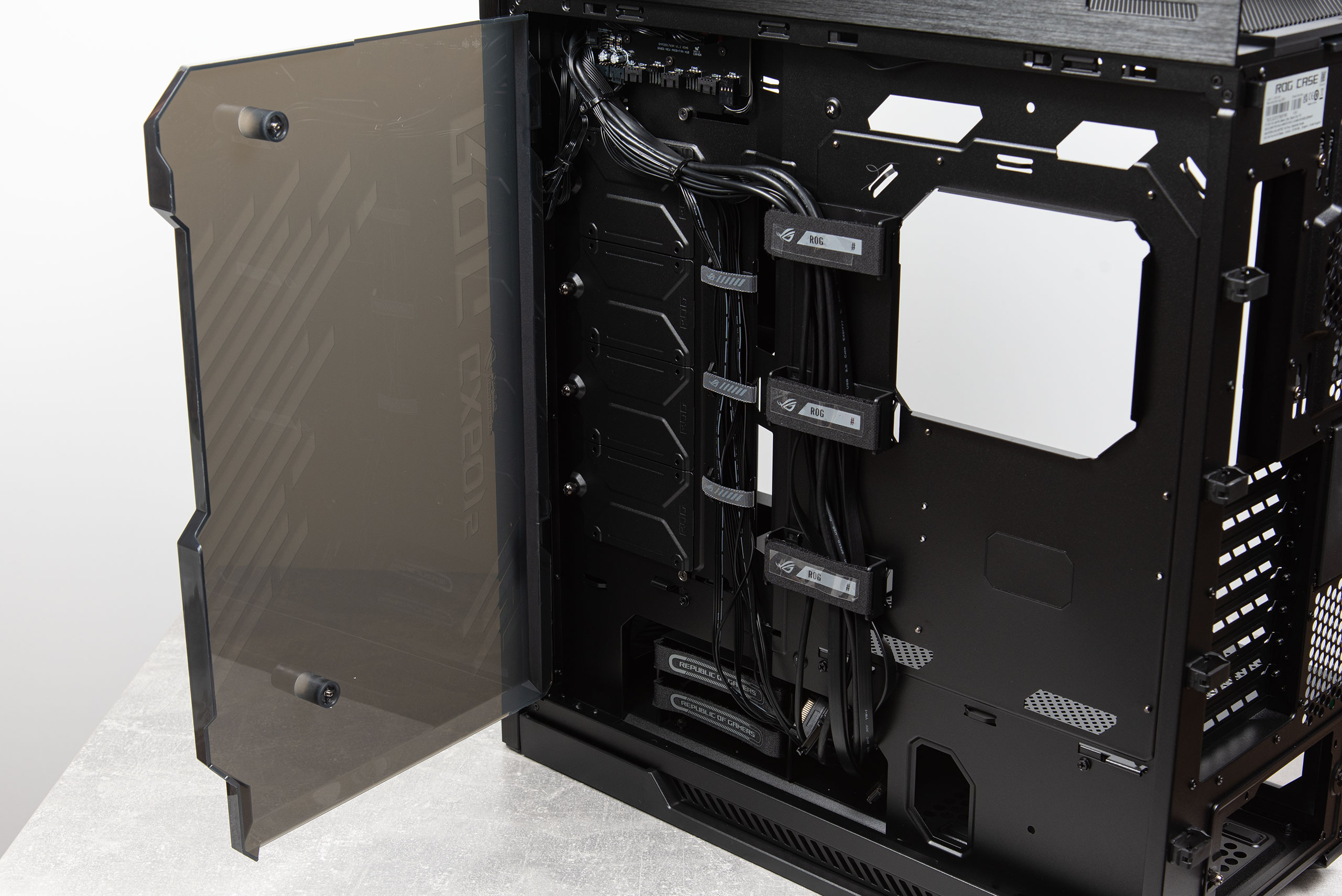Но чтобы добраться до хаба и кабелей — нужно распахнуть пластиковую полупрозрачную накладку, которая накрывает большую часть боковой стороны корпуса. Она фиксируется на двух винтах, а при необходимости ее можно снять с петель, потянув вверх в открытом состоянии. Аналогичная крышка была и в прошлом ROG Strix Helios.