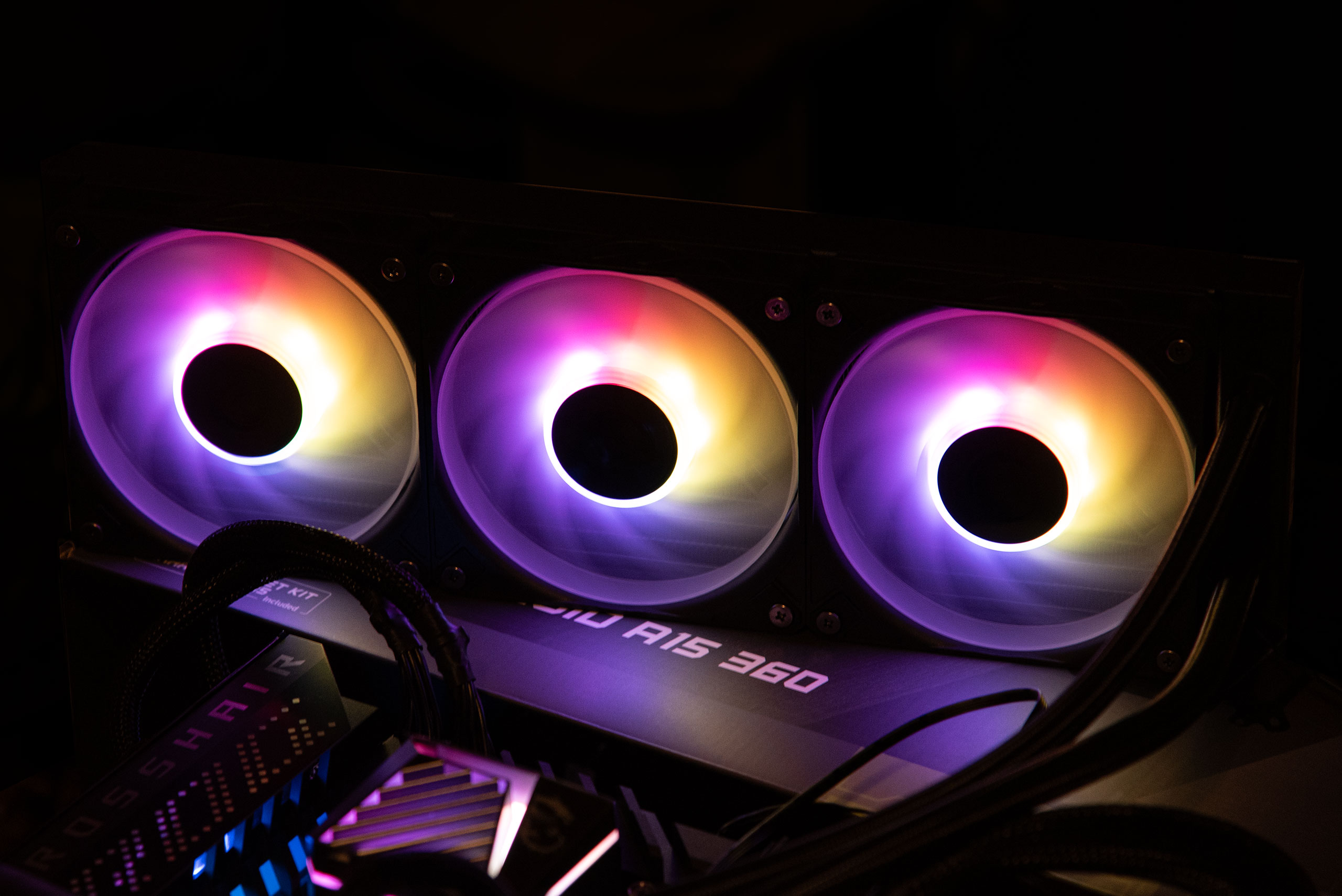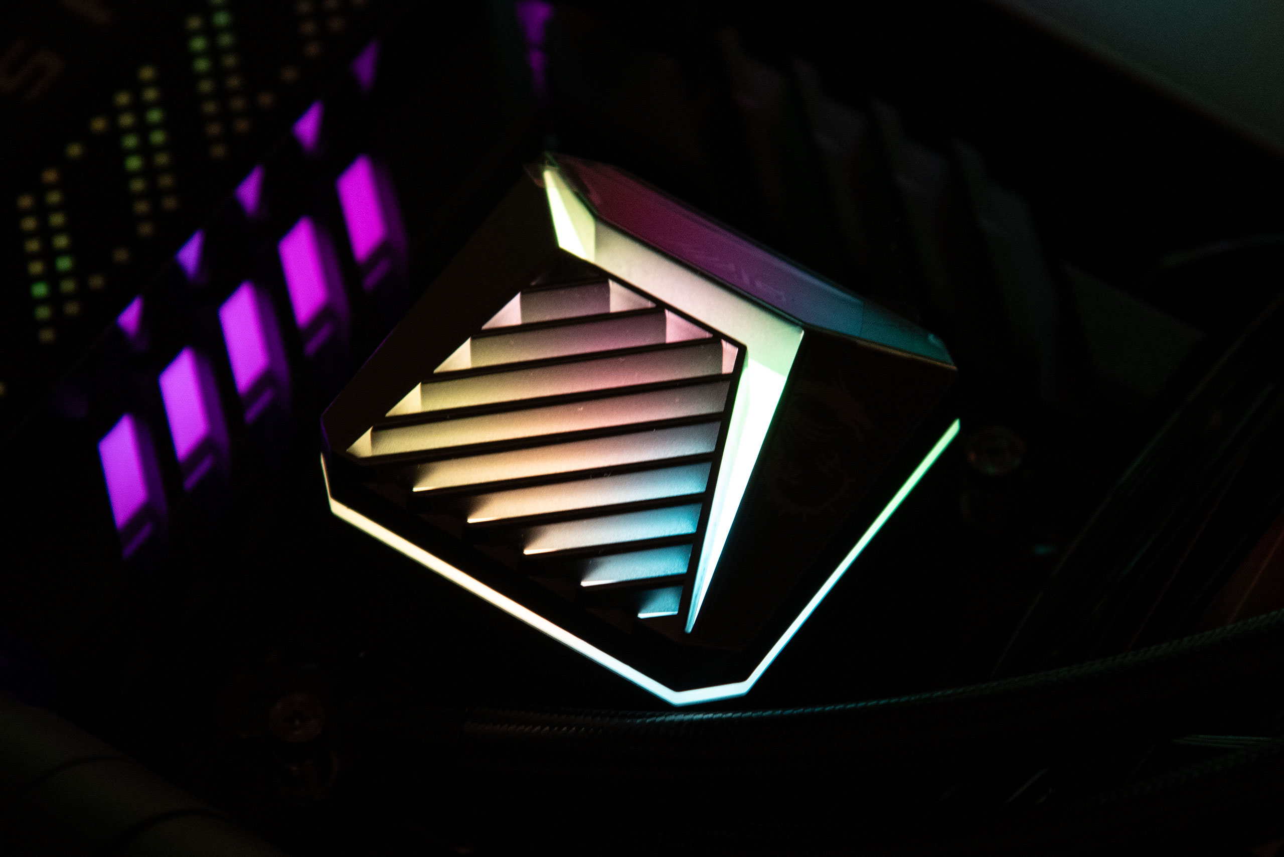 При подключении соответствующих проводов к материнской плате получаем RGB-подсветку каждого элемента: крышки водоблока и вентиляторов.