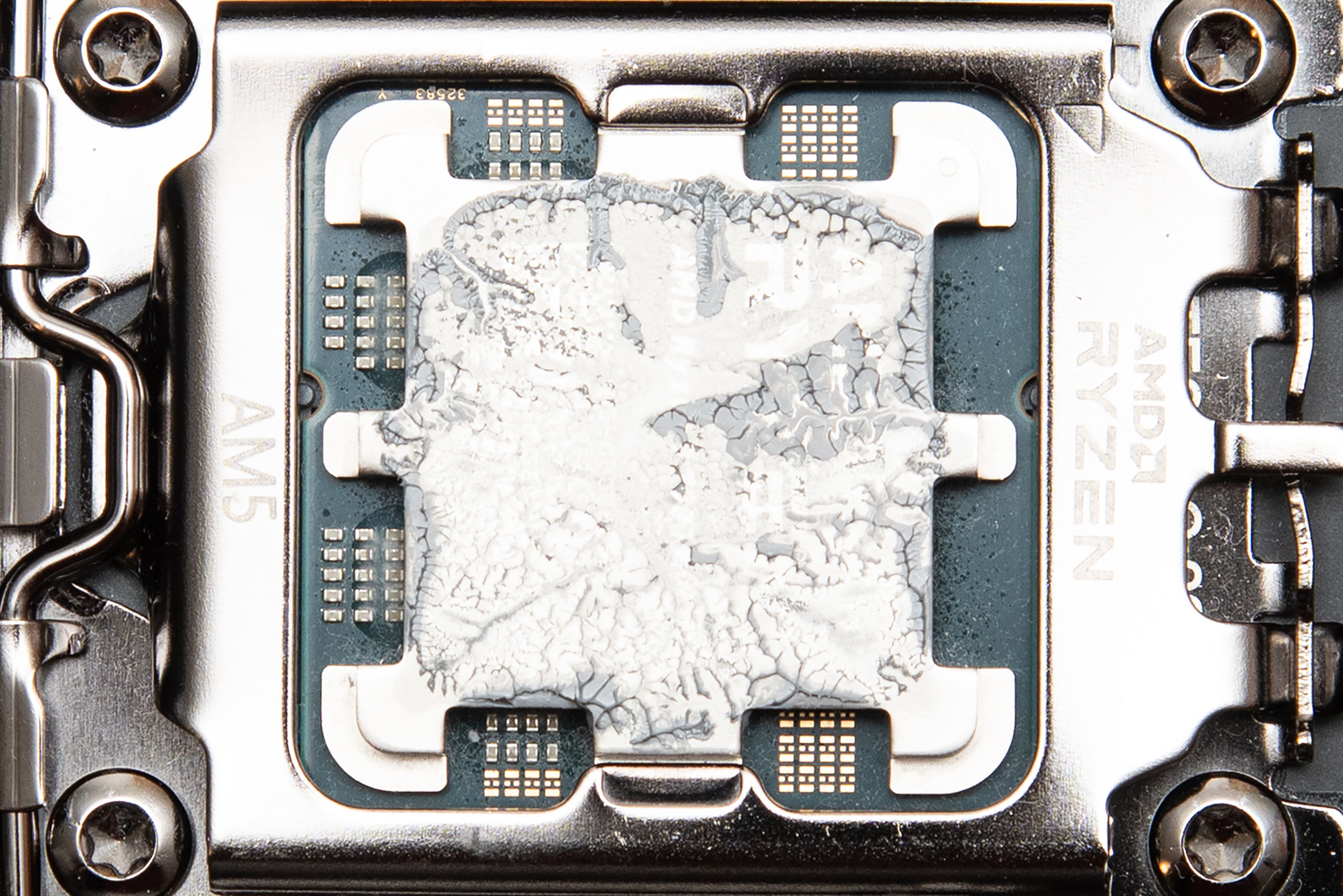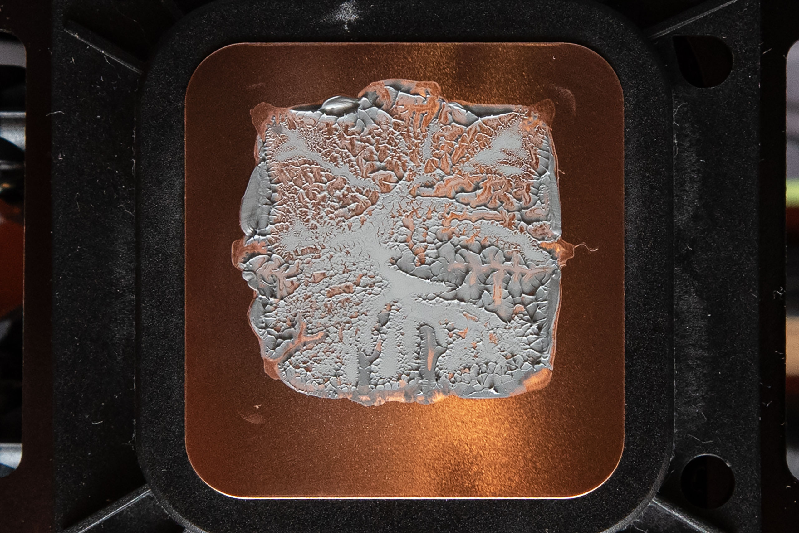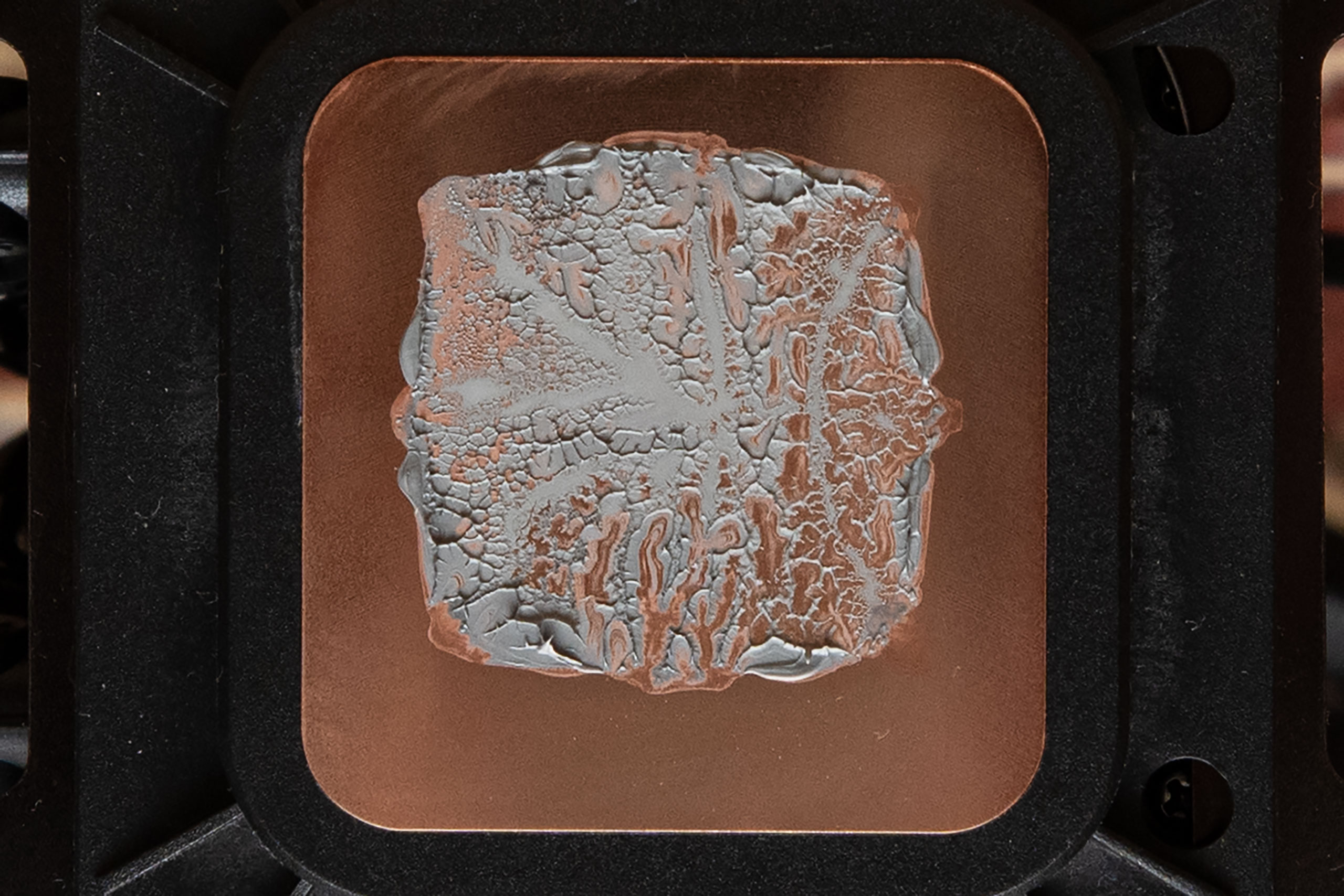 Подошва в старшей модели была волнистой по бокам, из-за чего отпечаток пасты по краям выходил не очень хорошим. Кроме того, экономить термоинтерфейс не получилось, иначе процессор нагревался на несколько градусов больше, чем с толстым слоем пасты.