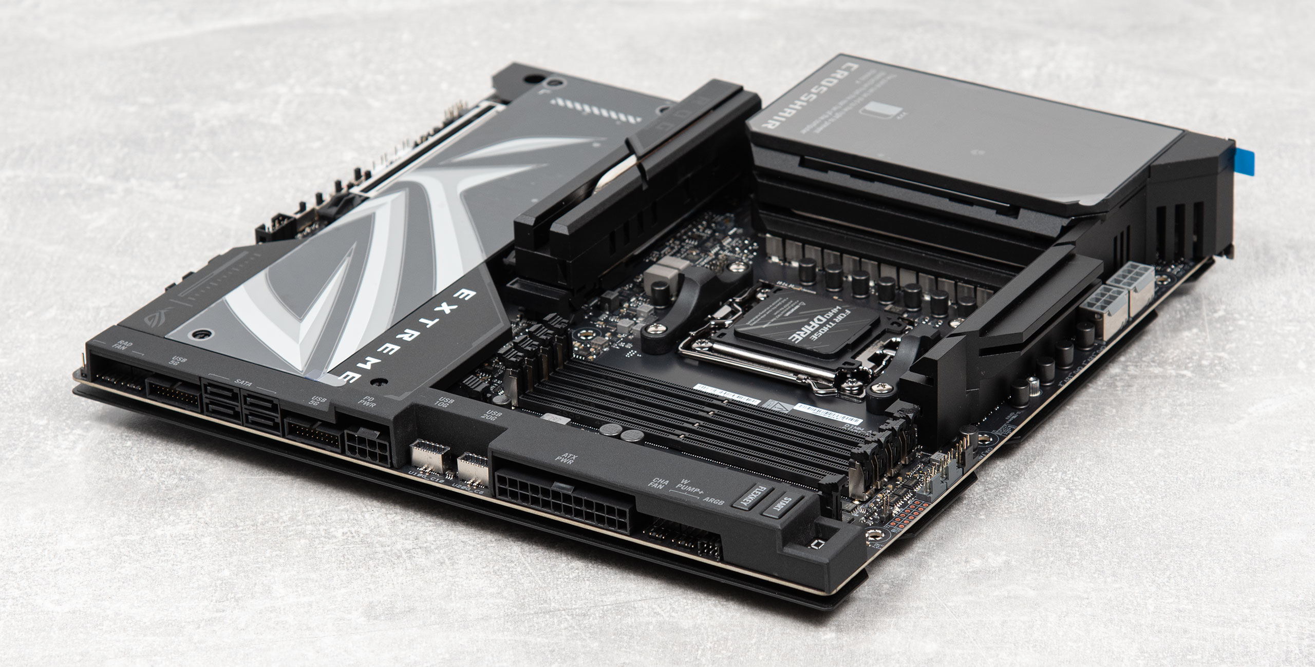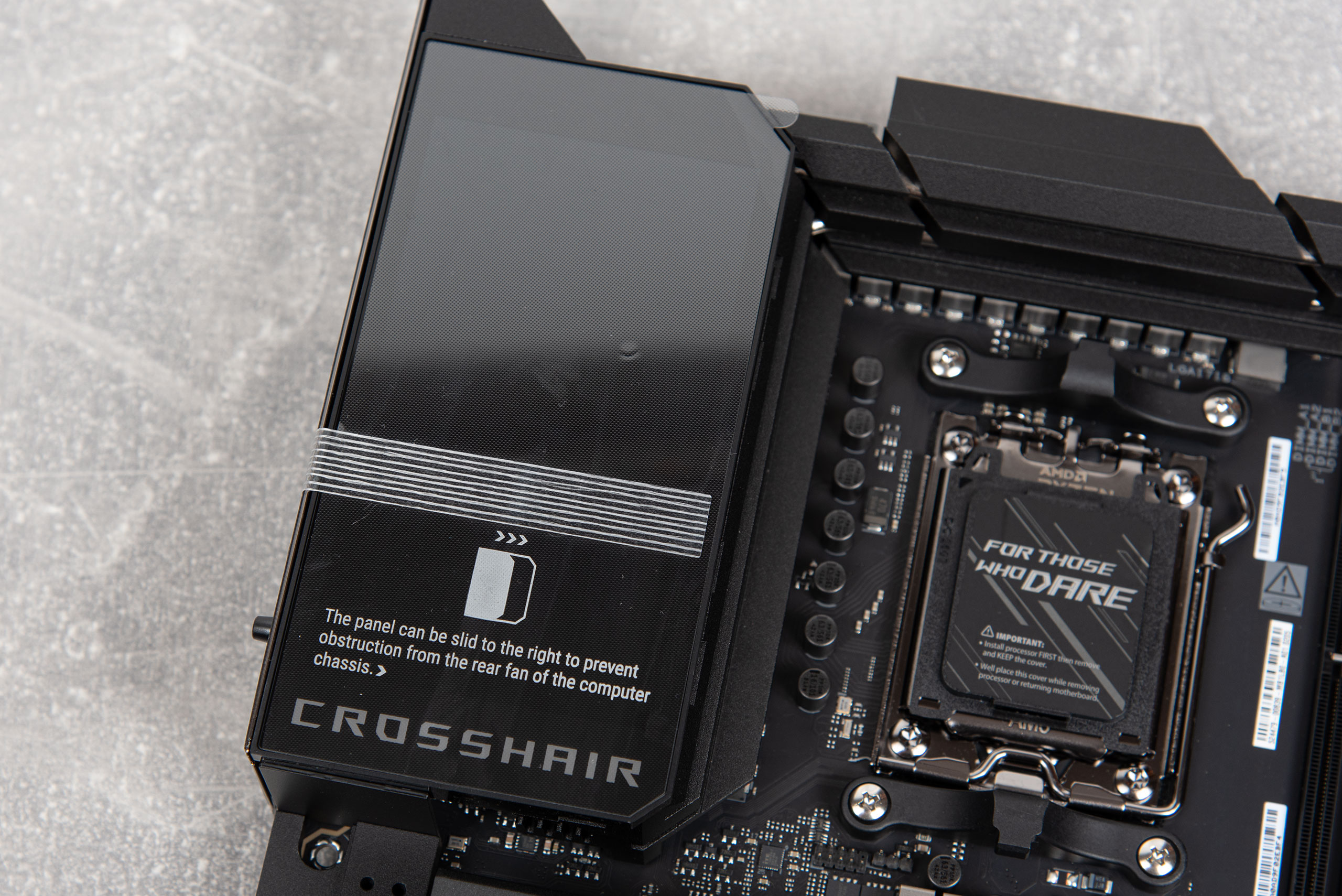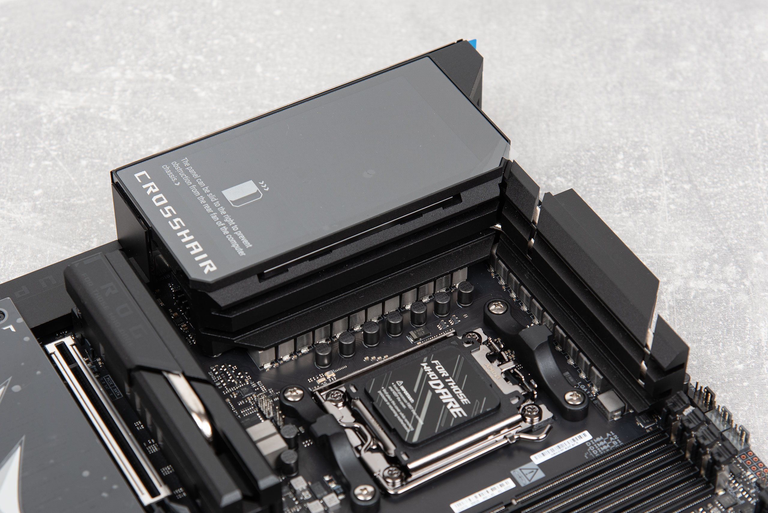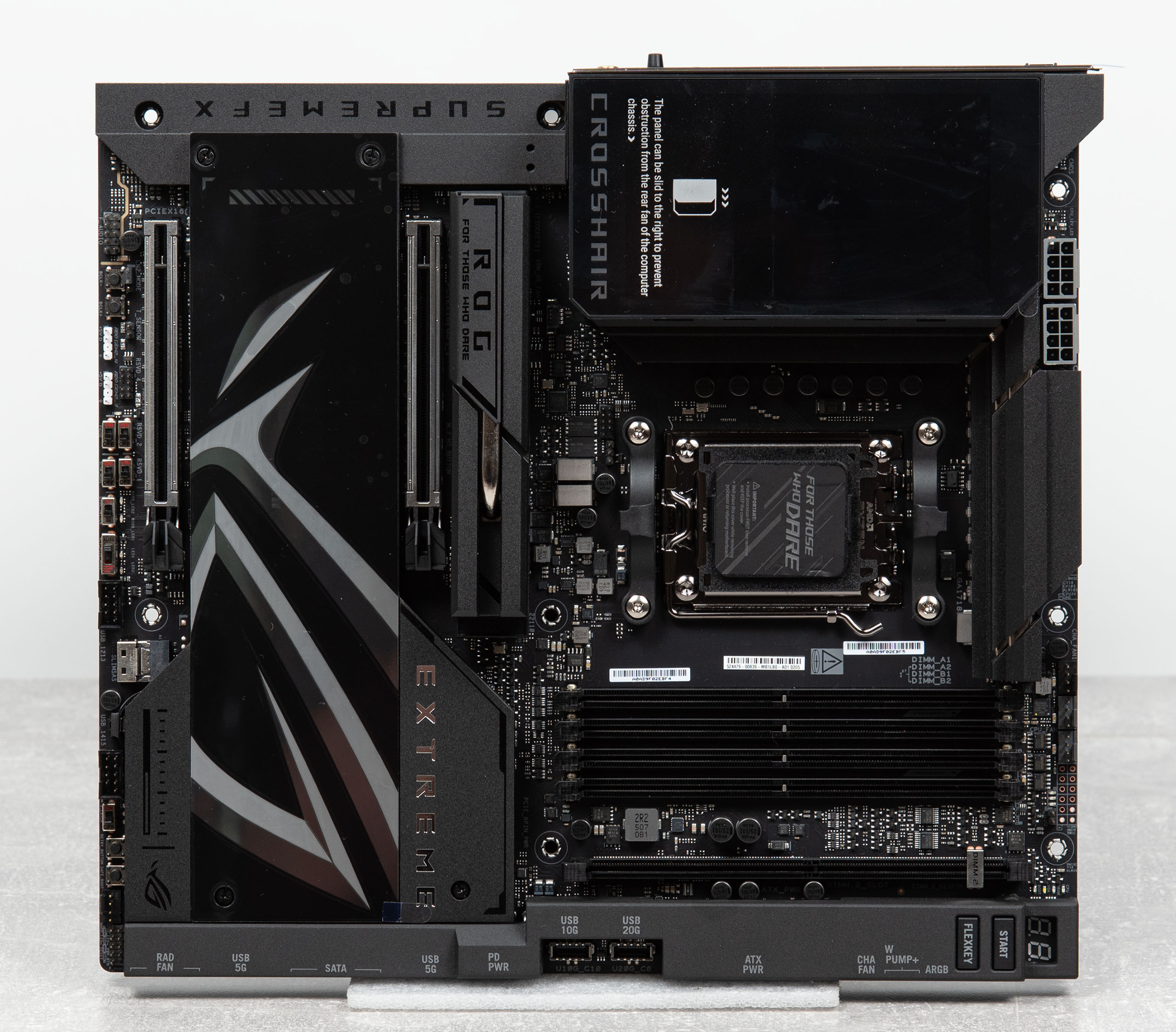 Материнская плата выглядит эпично, а ее, так сказать, «стратегический обвес» напугает любого неподготовленного пользователя ассортиментом разнообразных кнопок, переключателей, скрытых интерфейсов и огромных радиаторов. Доминирует темная цветовая гамма. Собственной RGB-подсветки у платы нет (пользователь может развернуть собственную через коннекторы Addressable Gen 2), ее заменяет 5‑дюймовый LCD дисплей, о котором чуть позже.