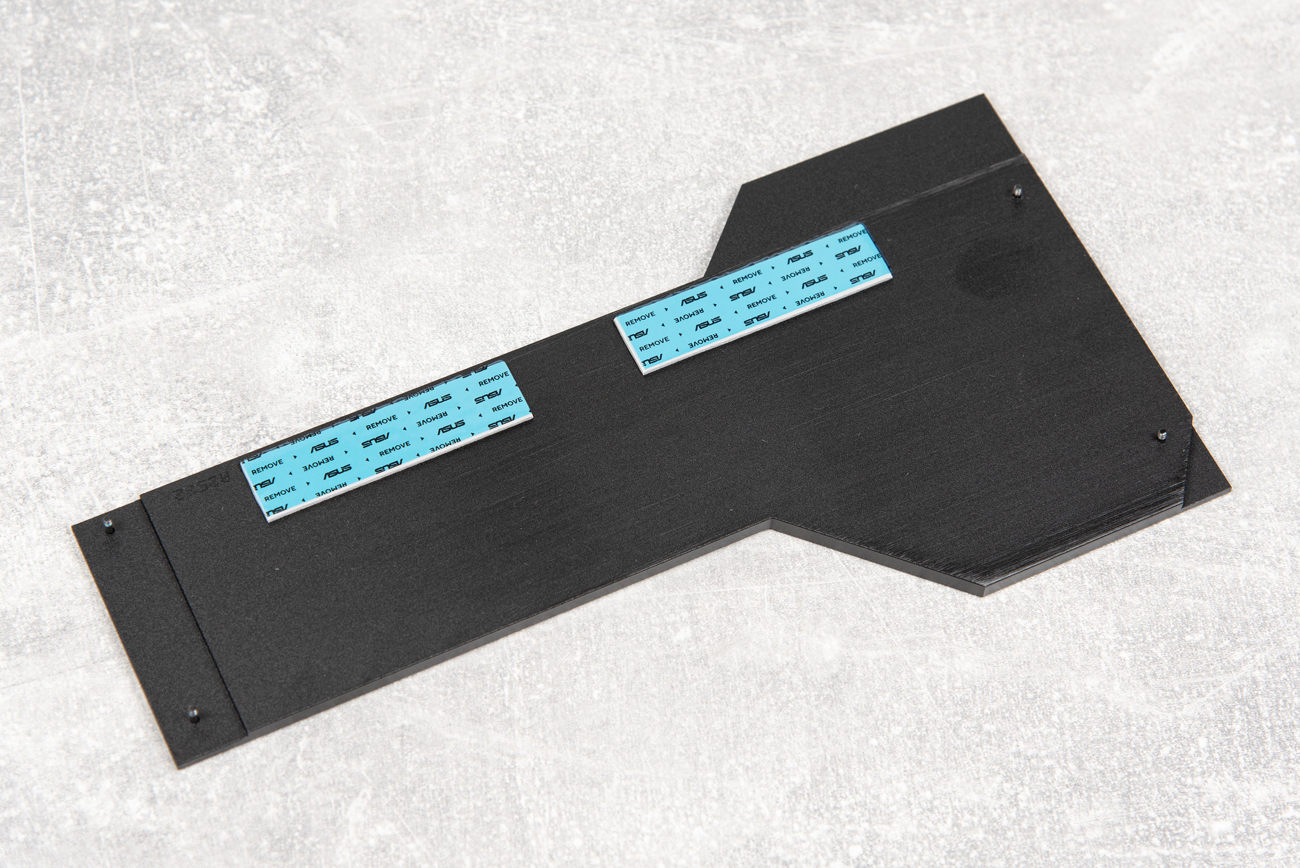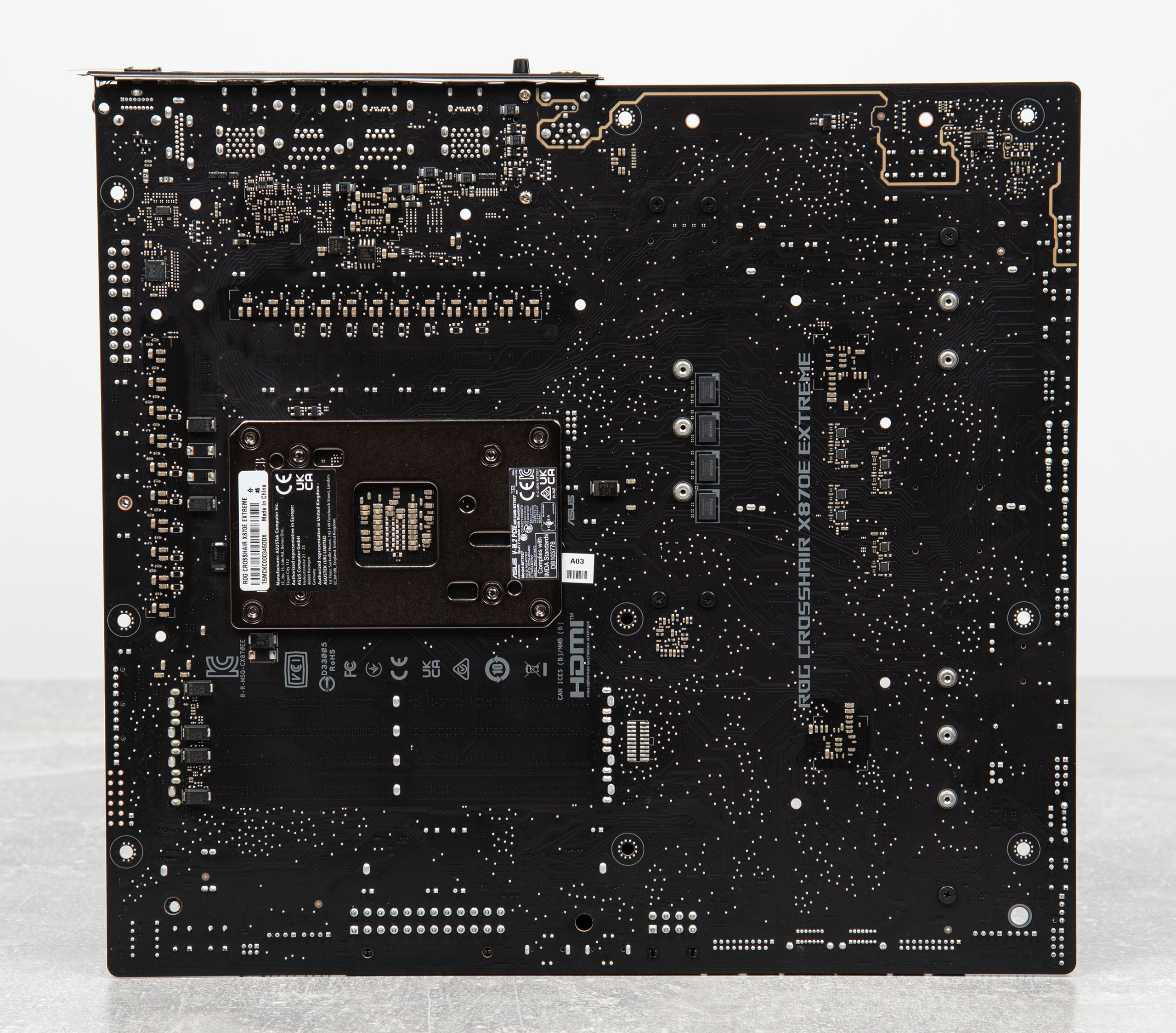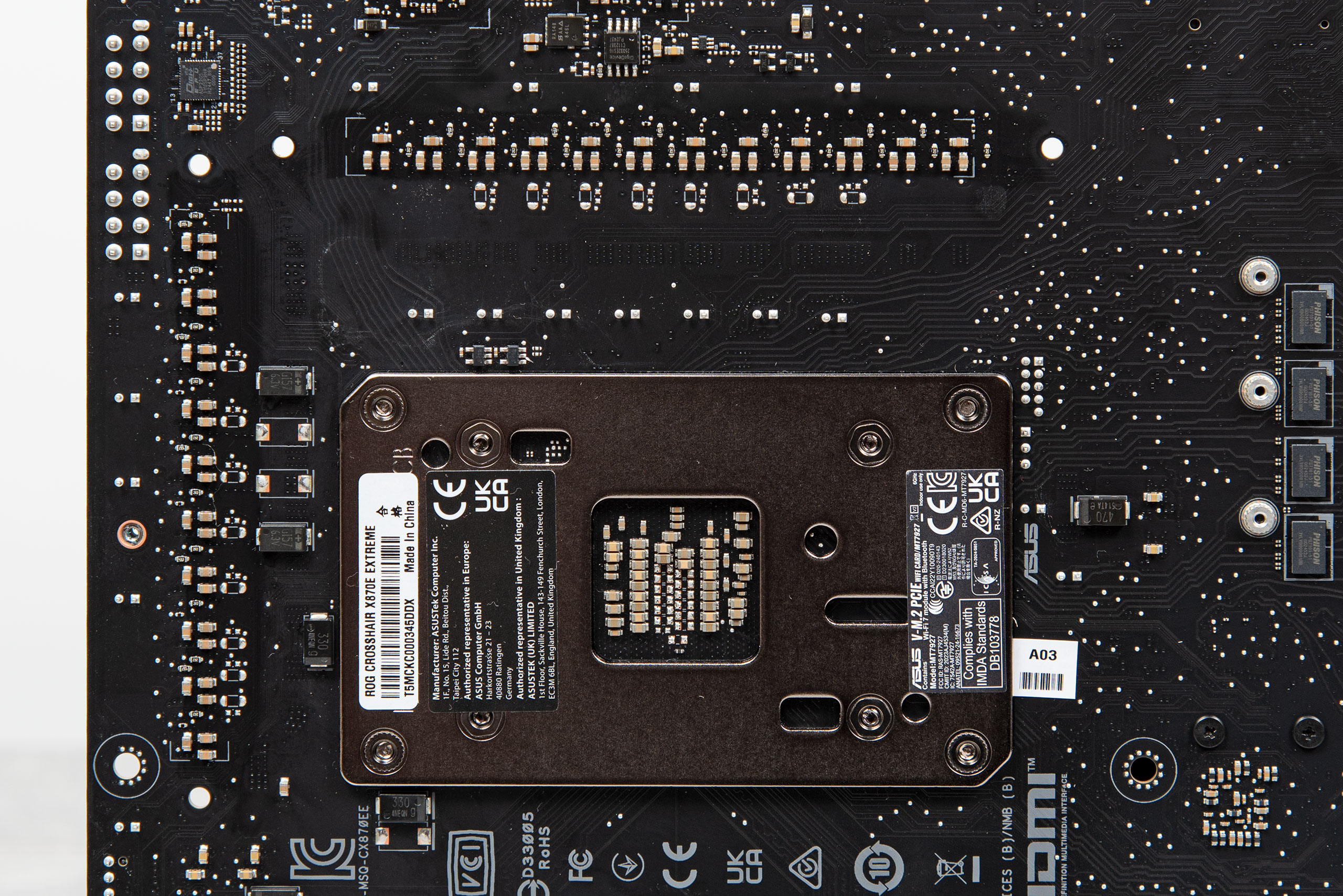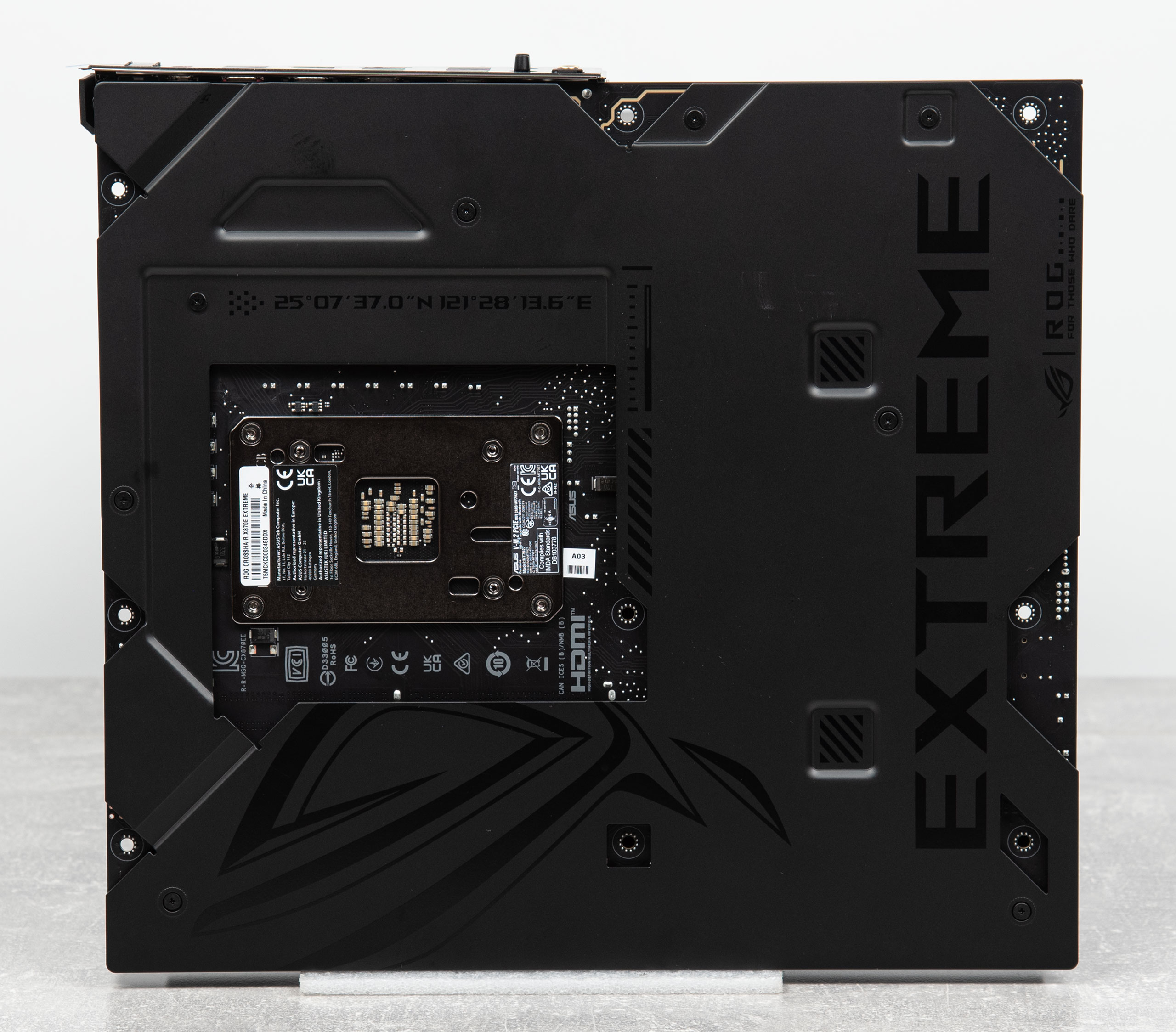 Форм-фактор и насыщенность разнообразными элементами требуют увеличенной жёсткости конструкции, которую успешно обеспечивает бэкплейт на всю площадь текстолита. Более того, он не просто охлаждает обратную сторону силовой подсистемы питания, он также отводит тепло от зон обоих чипсетов, сетевой карты 10G Ethernet, а также контроллера USB4.