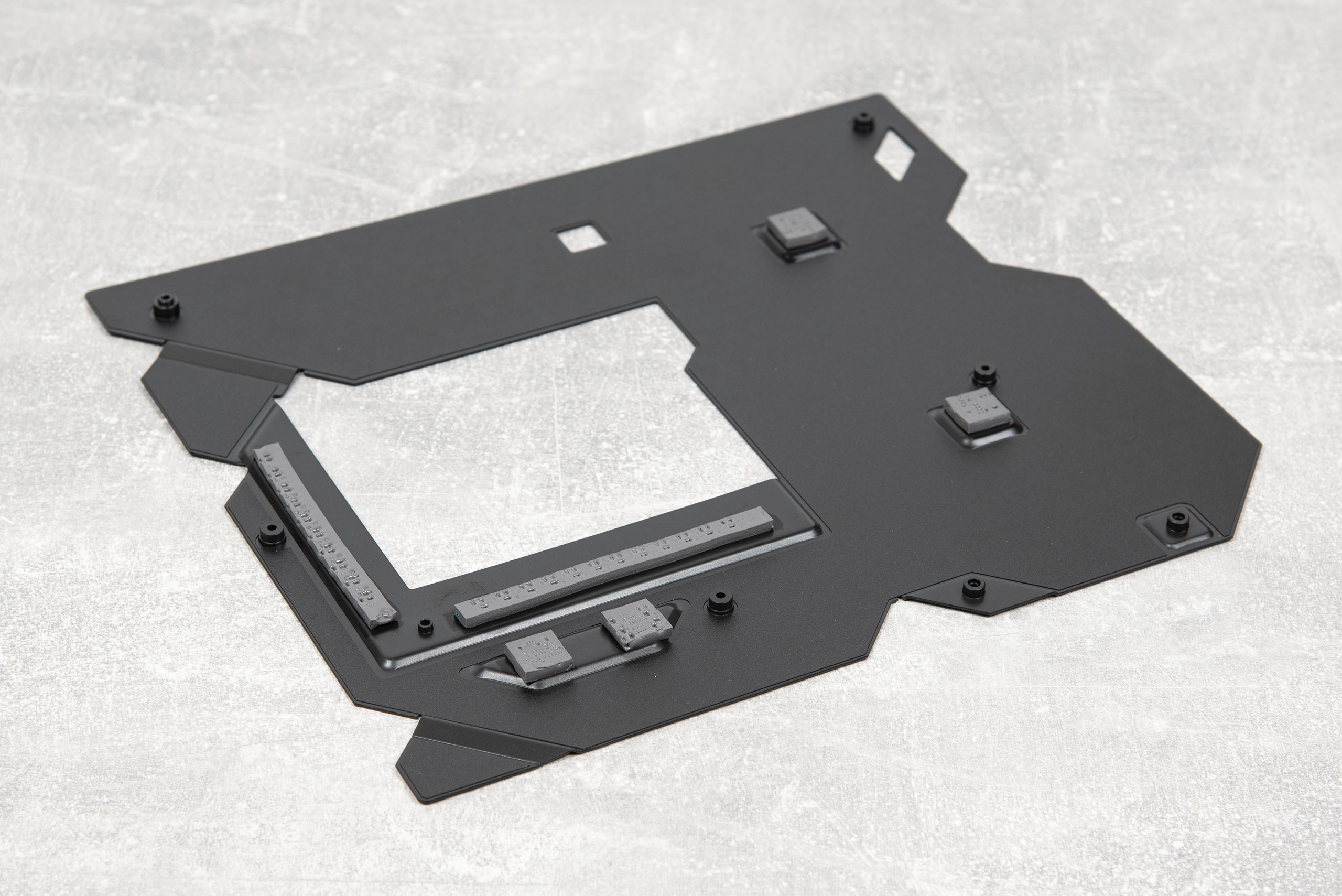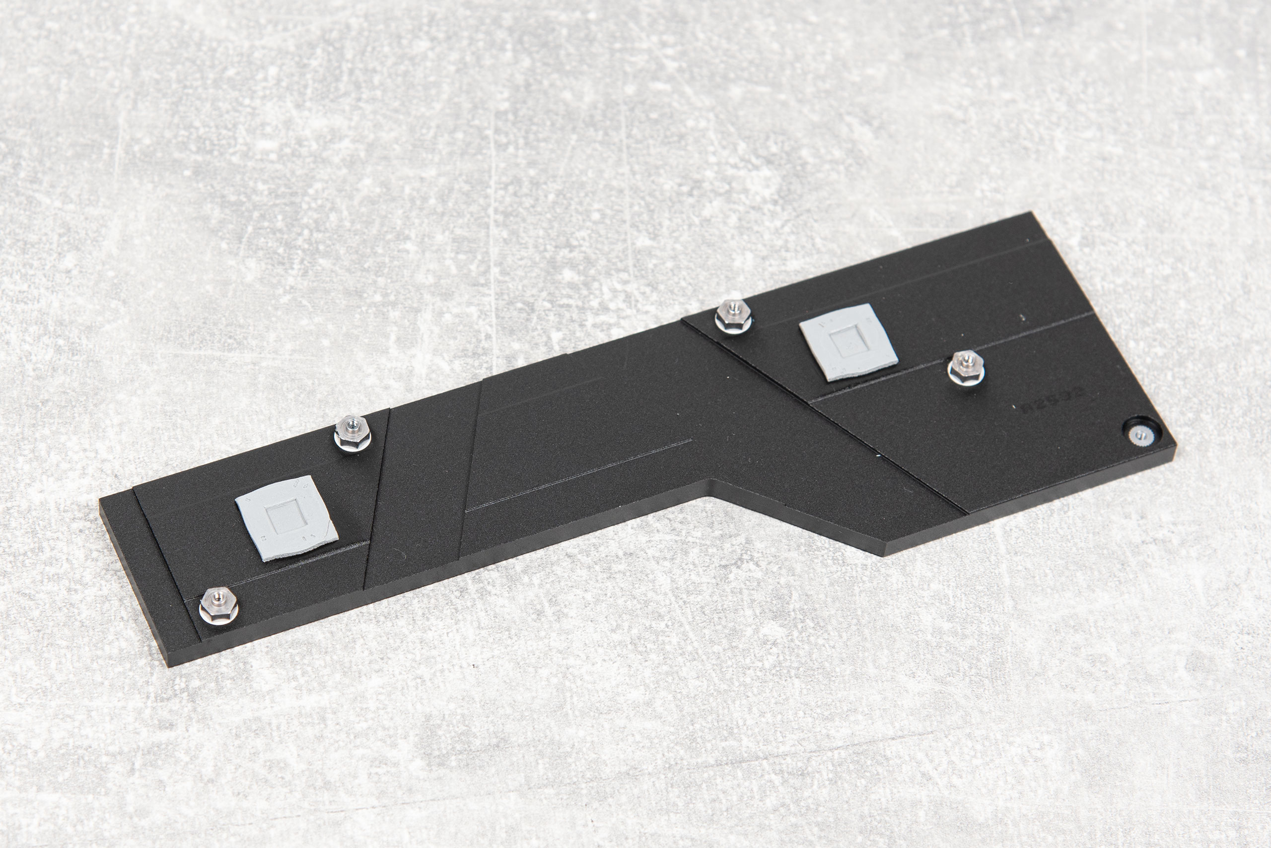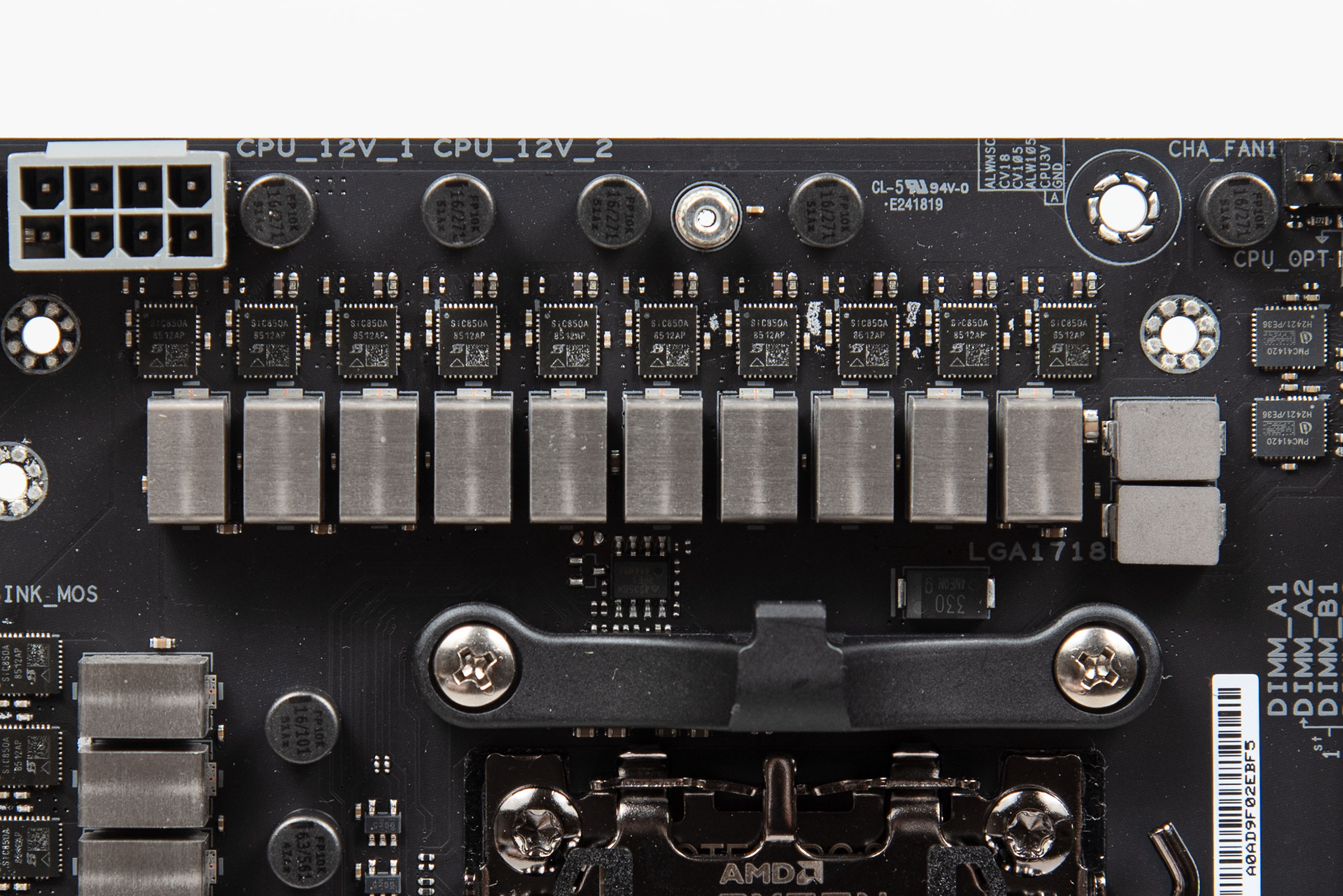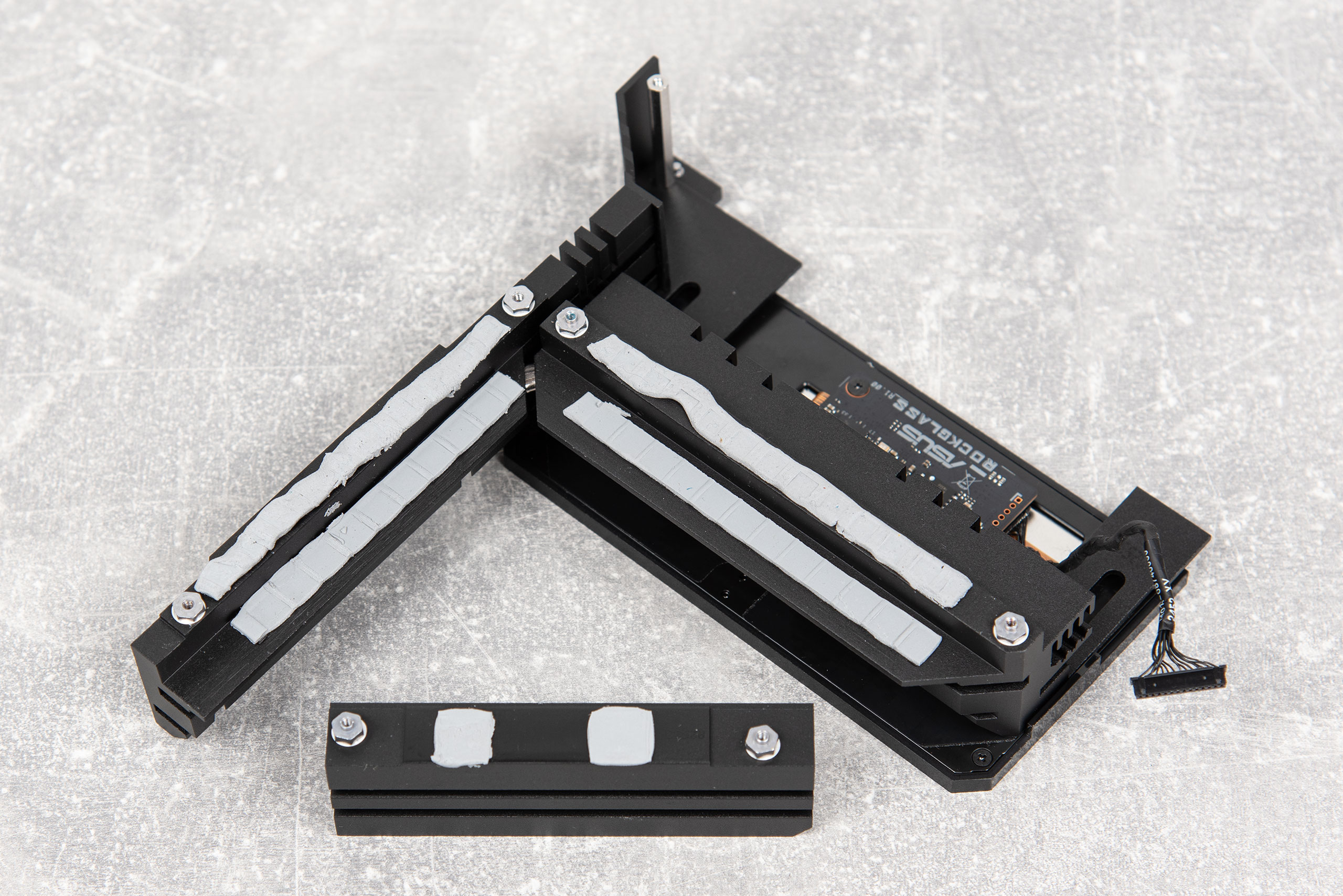 Форм-фактор и насыщенность разнообразными элементами требуют увеличенной жёсткости конструкции, которую успешно обеспечивает бэкплейт на всю площадь текстолита. Более того, он не просто охлаждает обратную сторону силовой подсистемы питания, он также отводит тепло от зон обоих чипсетов, сетевой карты 10G Ethernet, а также контроллера USB4.