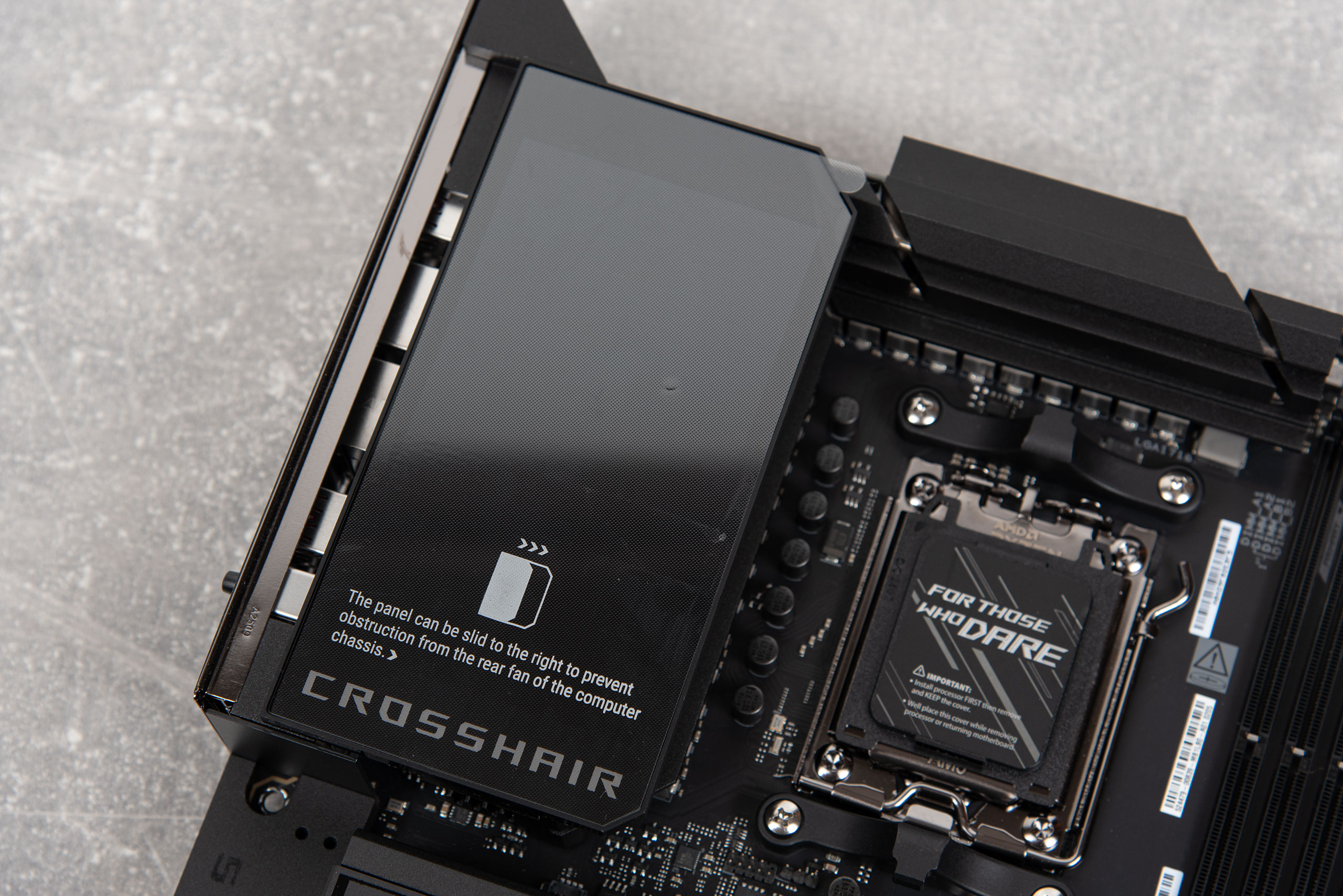 Главным акцентом зоны I/O является упомянутый ранее дисплей. Он подключается по проприетарному интерфейсу ASUS Rockglass. В случае необходимости его можно немного сместить в сторону, например во время монтажа для безопасности и комфорта сборки, либо на постоянное основание если вентилятор на задней панели корпуса будет перекрывать его на стандартной позиции. Он имеет немало полезных функций для своего пользователя, но его можно просто отключить в UEFI, если владелец консервативная личность. Дисплей может работать в Standby-режиме при выключенной системе.