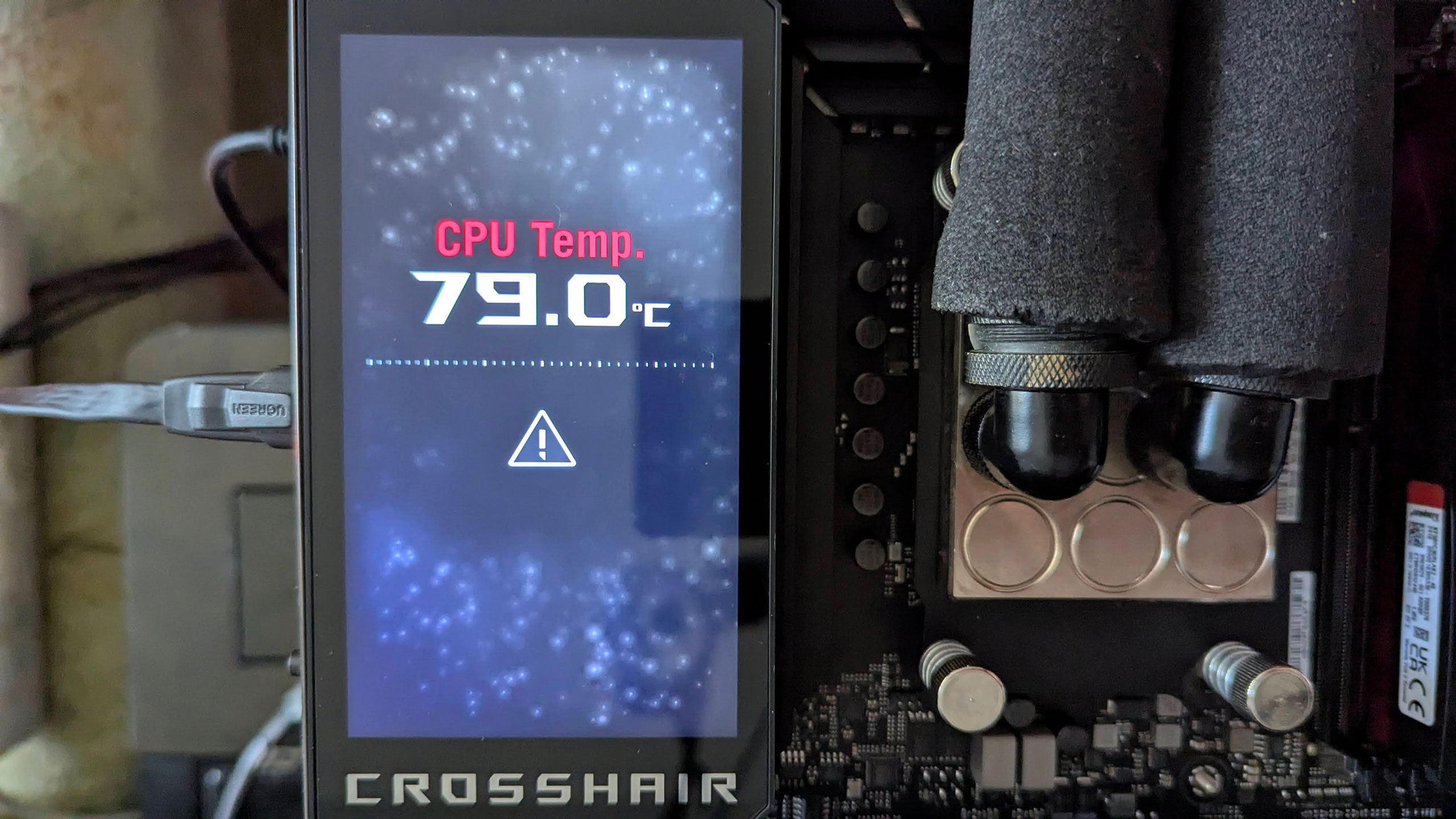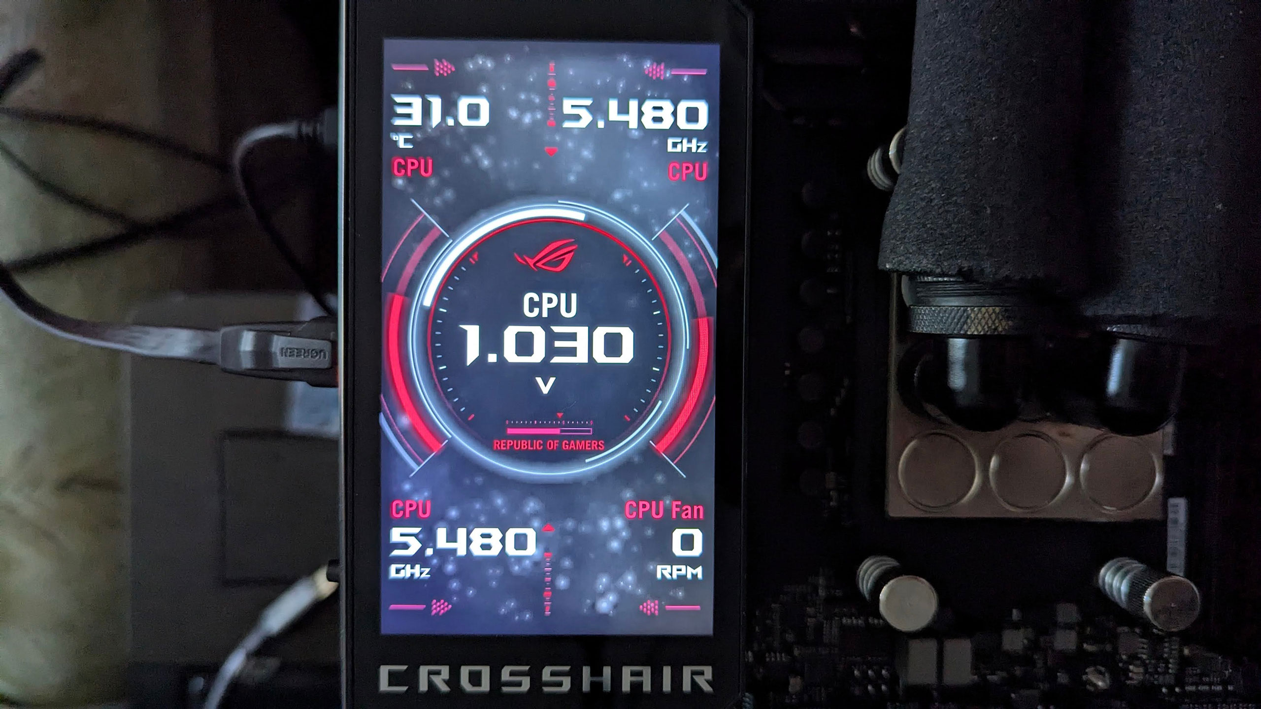 Сперва главное — эксплуатировать его как полноценный дисплей, например выводить на него системную картинку и играть в Counter-Strike 2 не получится. Он управляется через программный хаб ArmouryCrate. Когда система выключена (но не обесточена) экран может показывать фирменные анимации. Во время запуска он дублирует показ POST-кодов. После инициализации системы — переходит в стандартный режим работы. По умолчанию дисплей выводит телеметрию с ключевых датчиков системы (можно показывать информацию от одного до пяти одновременно), например: температура ЦП, обороты вентилятора, напряжение и прочее. Доступна функция регулировки яркости дисплея. Из полезного есть функция тревоги в случае перегрева.