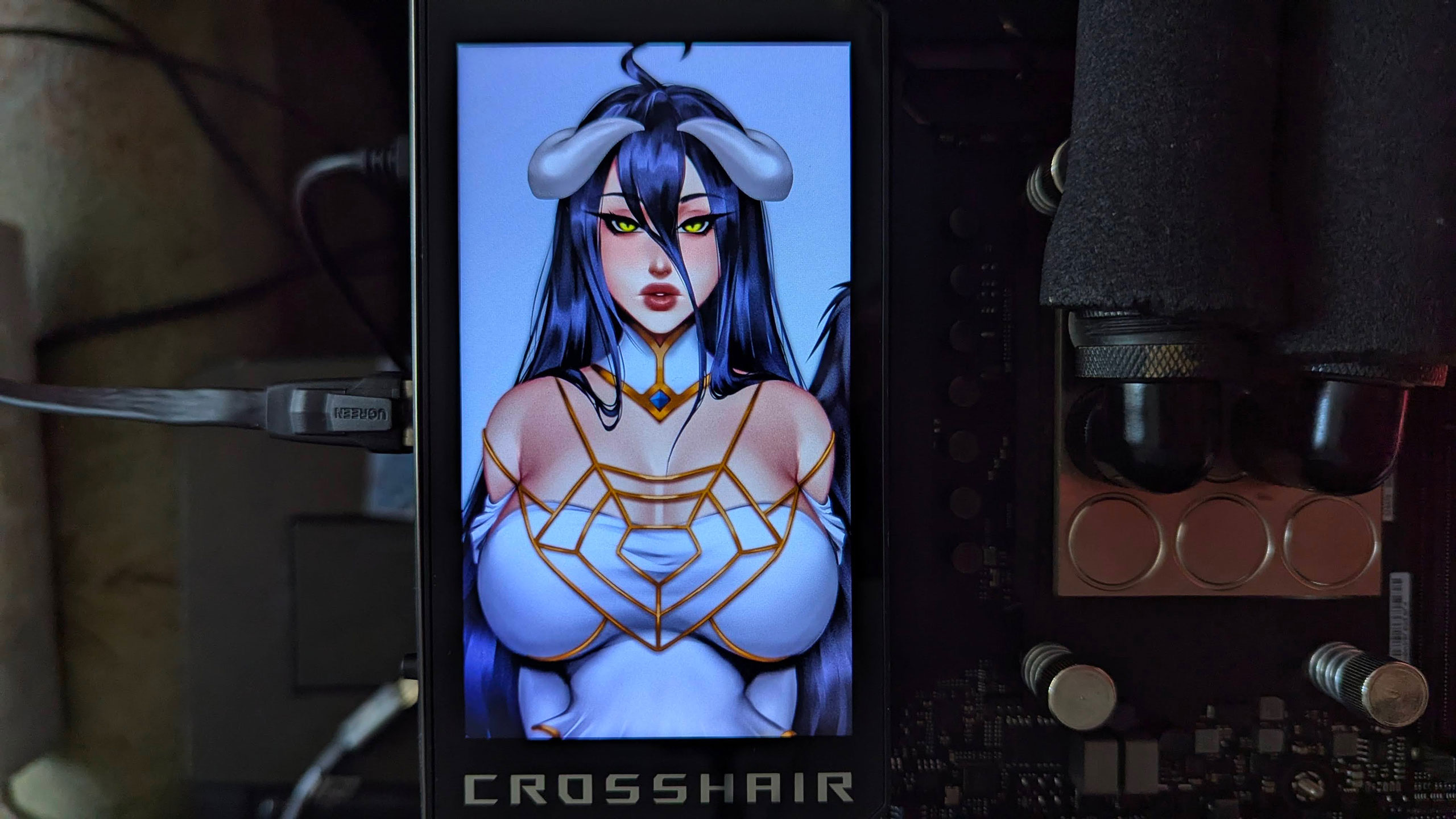 Конечно же его можно перевести в декоративный режим, который будет крутить анимации, или показывать статические изображения. Все верно, люди высокой культуры могут продемонстрировать всем свою вайфу прямо на радиаторе зоны I/O. Инновации 2025 года и материнской платы за около 50000 гривен! Однако следует помнить, что углы обзора у этого дисплея не самые лучшие.