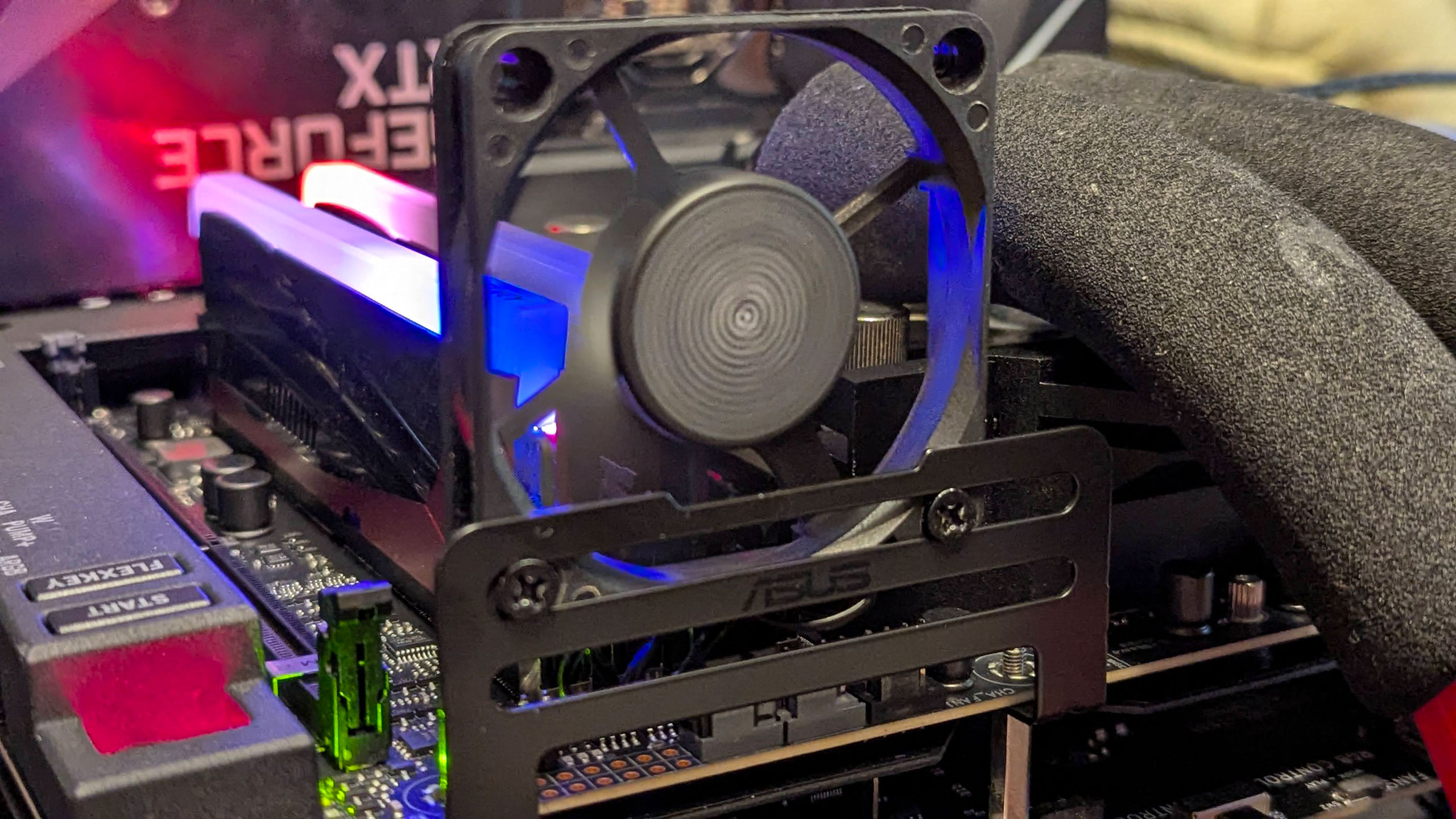 Для улучшения температурного режима памяти опциональным является использование кронштейна DDR5 Fan holder, который пользователь может разместить на корпусных стойках справа. Это конечно не настолько идеально и круто, как тот же ROG Memory Fan Kit из ROG Maximus Z790 Apex Encore, но приятно что производитель снаряжает своего потенциального будущего клиента решением для дополнительного охлаждения. Готовая конструкция будет иметь подобный вид: