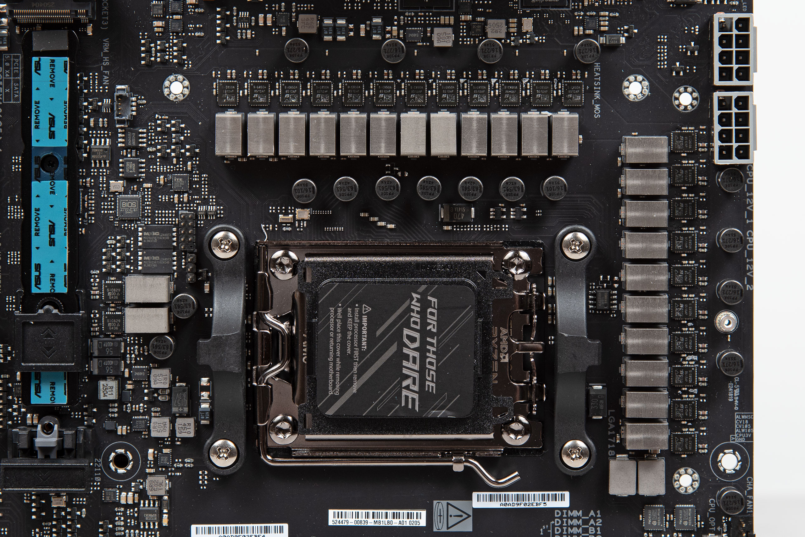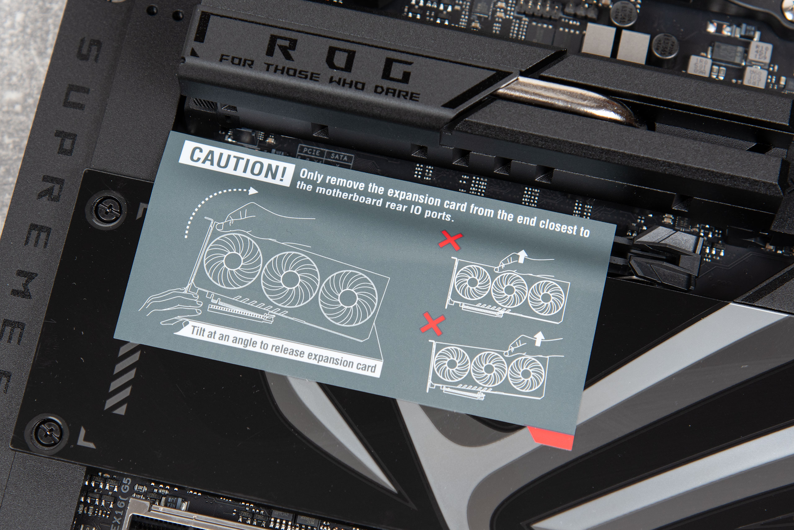 Слоты PCIe имеют механизм Q‑Release Slim, позволяющий устанавливать и снимать видеокарту без нажатия на рычаг освобождения. Производитель оставил для пользователя памятку-наклейку как правильно пользоваться механизмом. Более детально мы уже не раз описывали его в других обзорах, например ROG Crosshair X870E Hero.