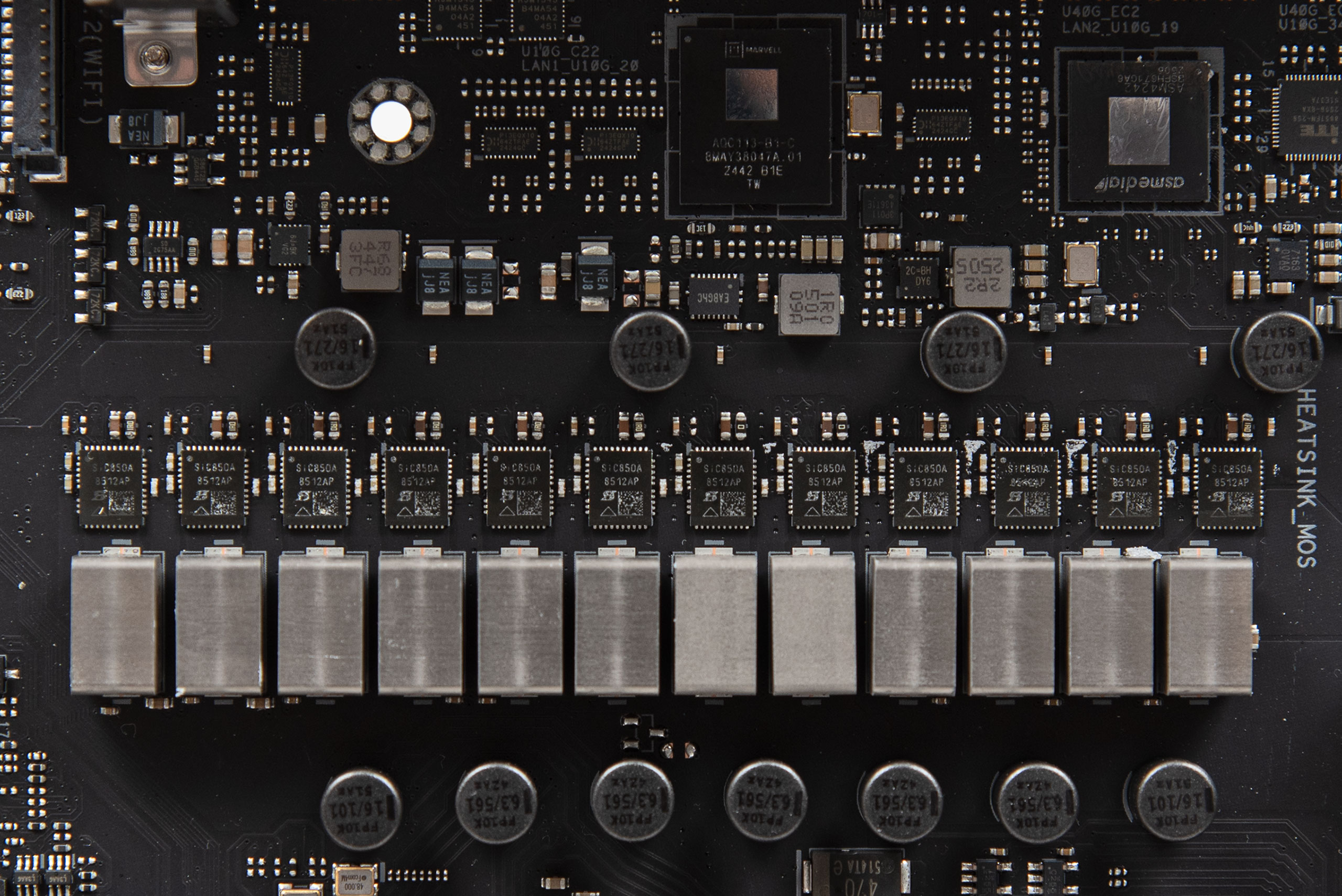 Подсистема питания имеет конструкцию 20+2+2 (VCORE+SOC+MISC). Процессорная группа управляется упомянутым ранее ШИМ-контроллером DIGI+ ASP2205, который расположен на обратной стороне платы, выделено 20 силовых элементов Vishay SiC850A, рассчитанных на 110 А (по словам производителя). Группа SoC управляется ШИМ-контроллером Richtek Technology RT3672EE, выделено еще два силовых элемента SiC850A. MISC управляется ШИМ-контроллером Infineon XDPE192838, выделено два силовых элемента Vishay SIC629, что рассчитано на 80 А. Группа MISC не имеет собственного радиатора для охлаждения (это не проблема, тепловая камера зафиксировала 63 градуса во время разгона). Питание процессора осуществляется через два армированных (ASUS ProCool II) коннектора EPS12V.