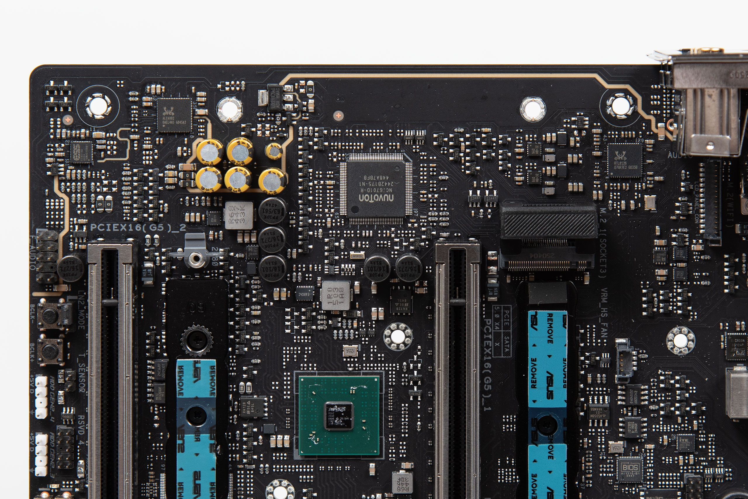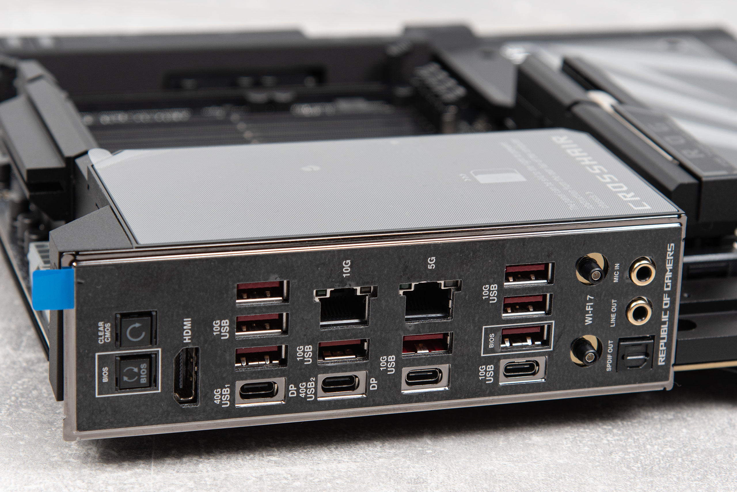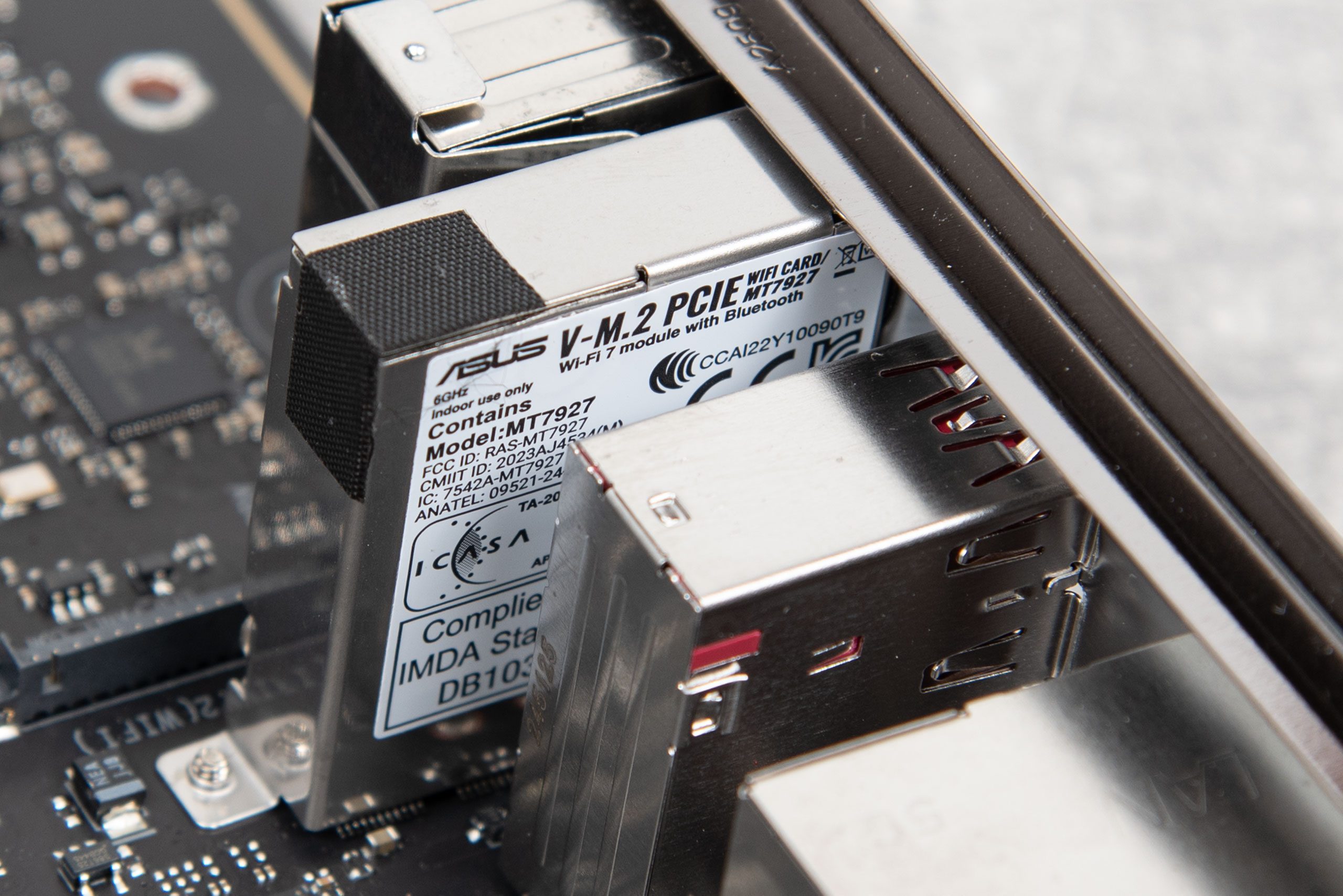 Проводные интерфейсы представлены в виде двух сетевых карт. Это 5G Ethernet Realtek RTL8126, а также 10G Ethernet ASUS XG-C100C (Marvell FastLinQ Edge). Беспроводной интерфейс Wi-Fi 7 представлен в виде модуля M.2 key E в зоне I/O на базе контроллера MediaTek MT7927 (есть поддержка Bluetooth 5.4).