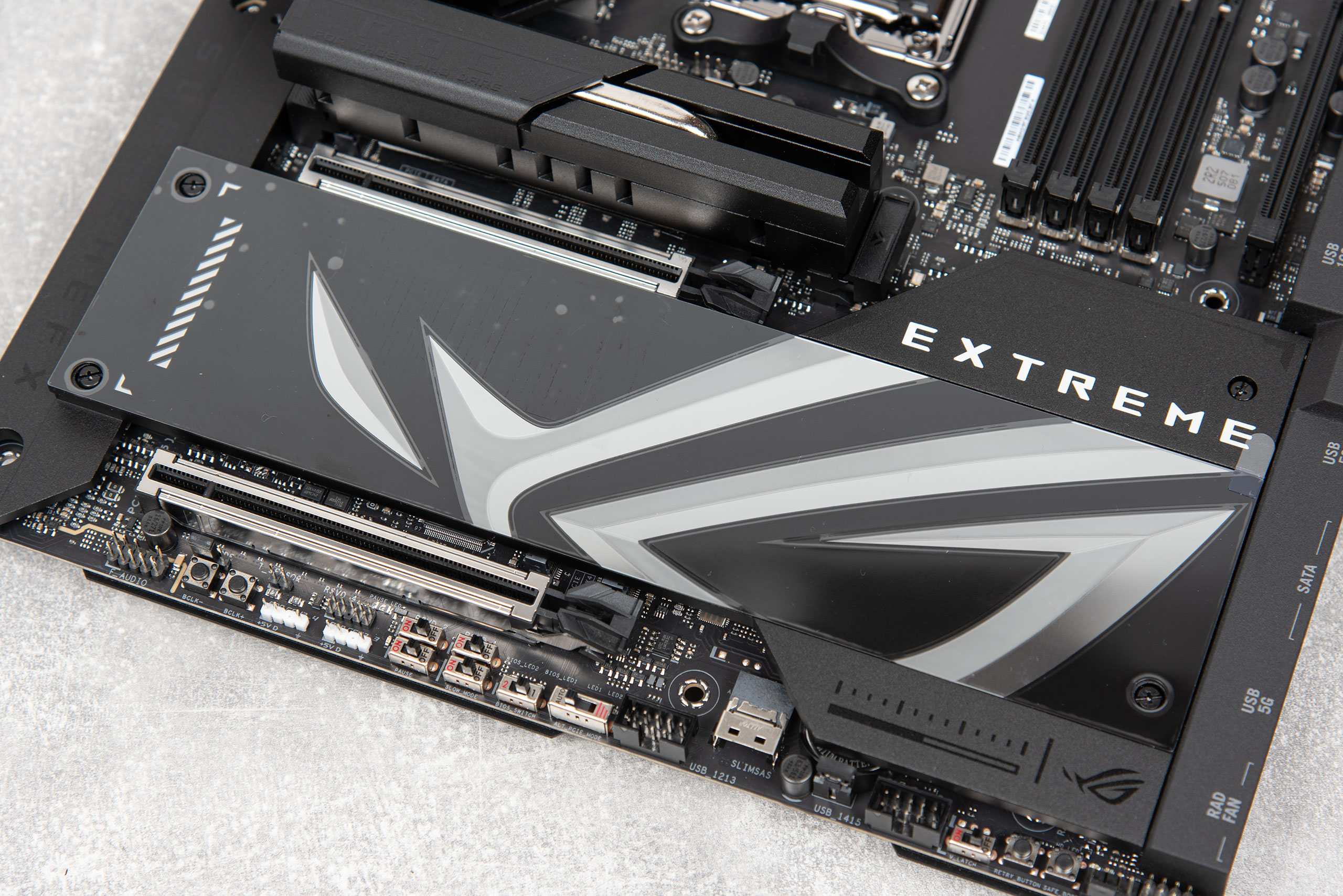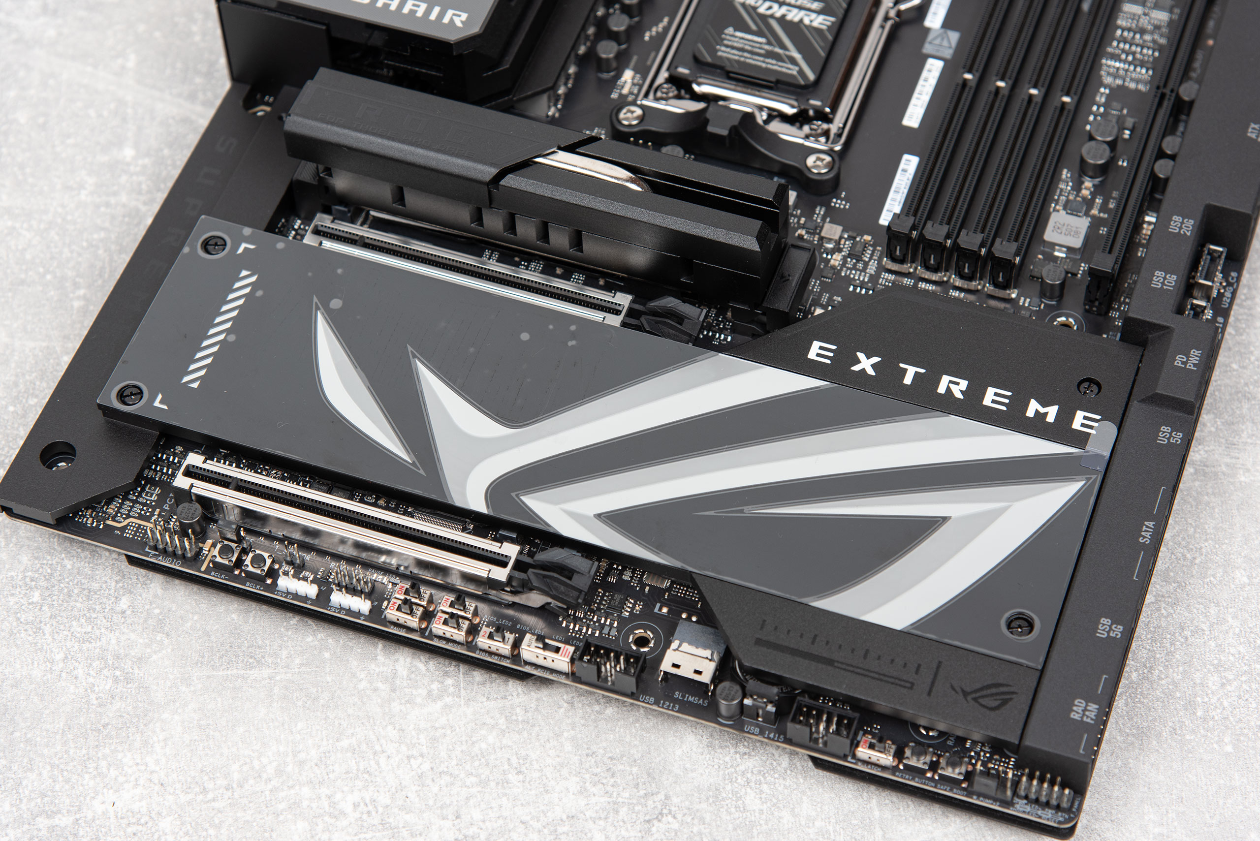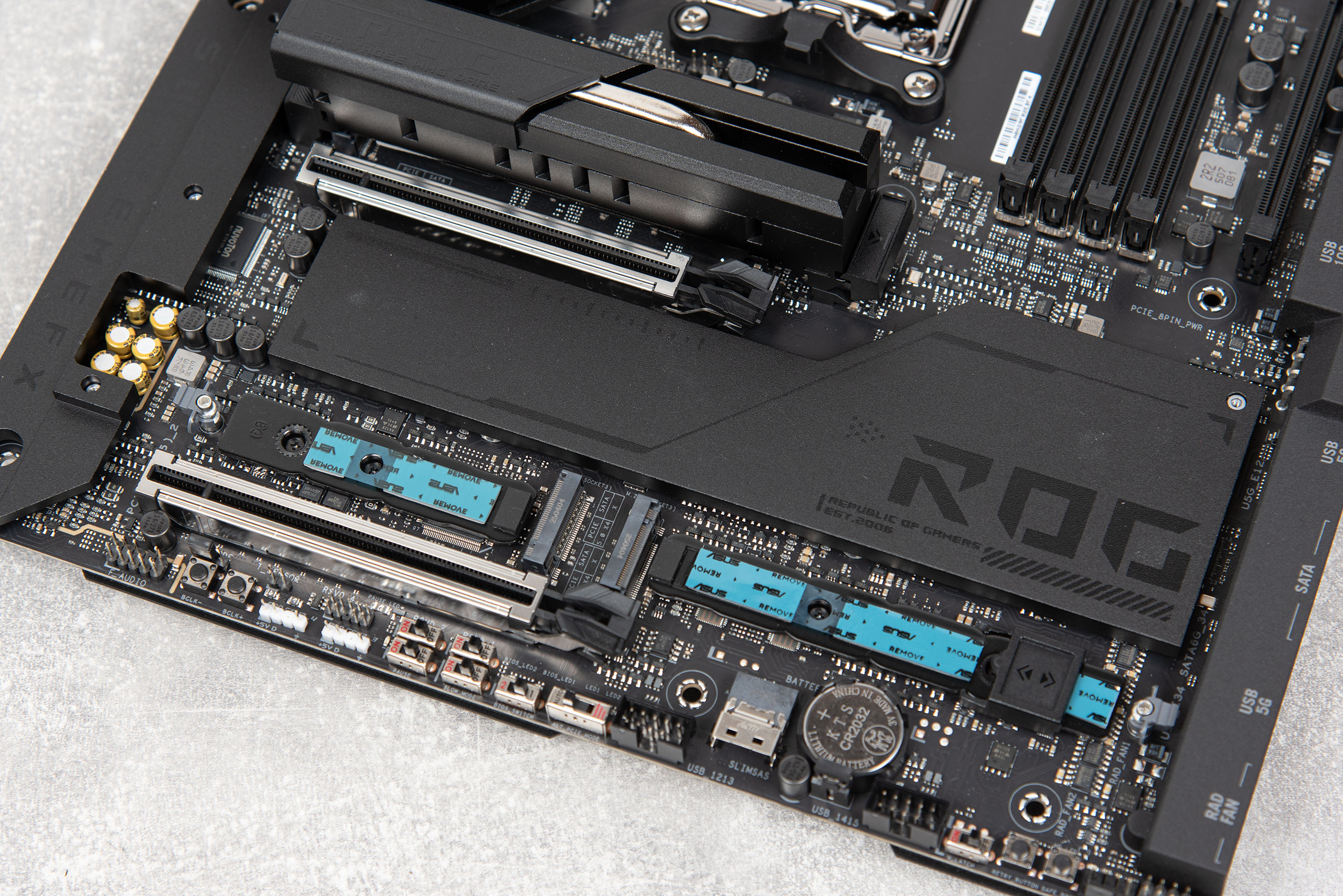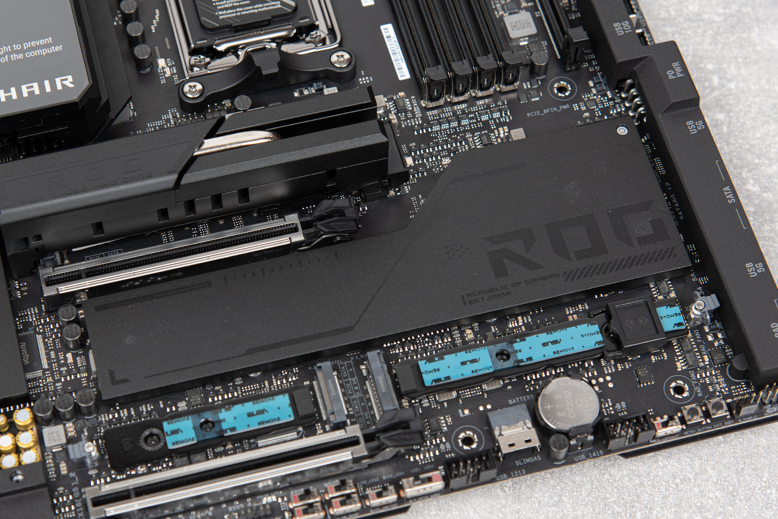 Слоты M.2_2 и M.2_3 охлаждаются большим радиатором с декоративным логотипом серии ROG. Его уже не снять без отвертки, а вместо M.2 Q‑slide используется уже M.2 Q‑latch, что позволяет устанавливать и снимать именно M.2 накопитель без инструмента.