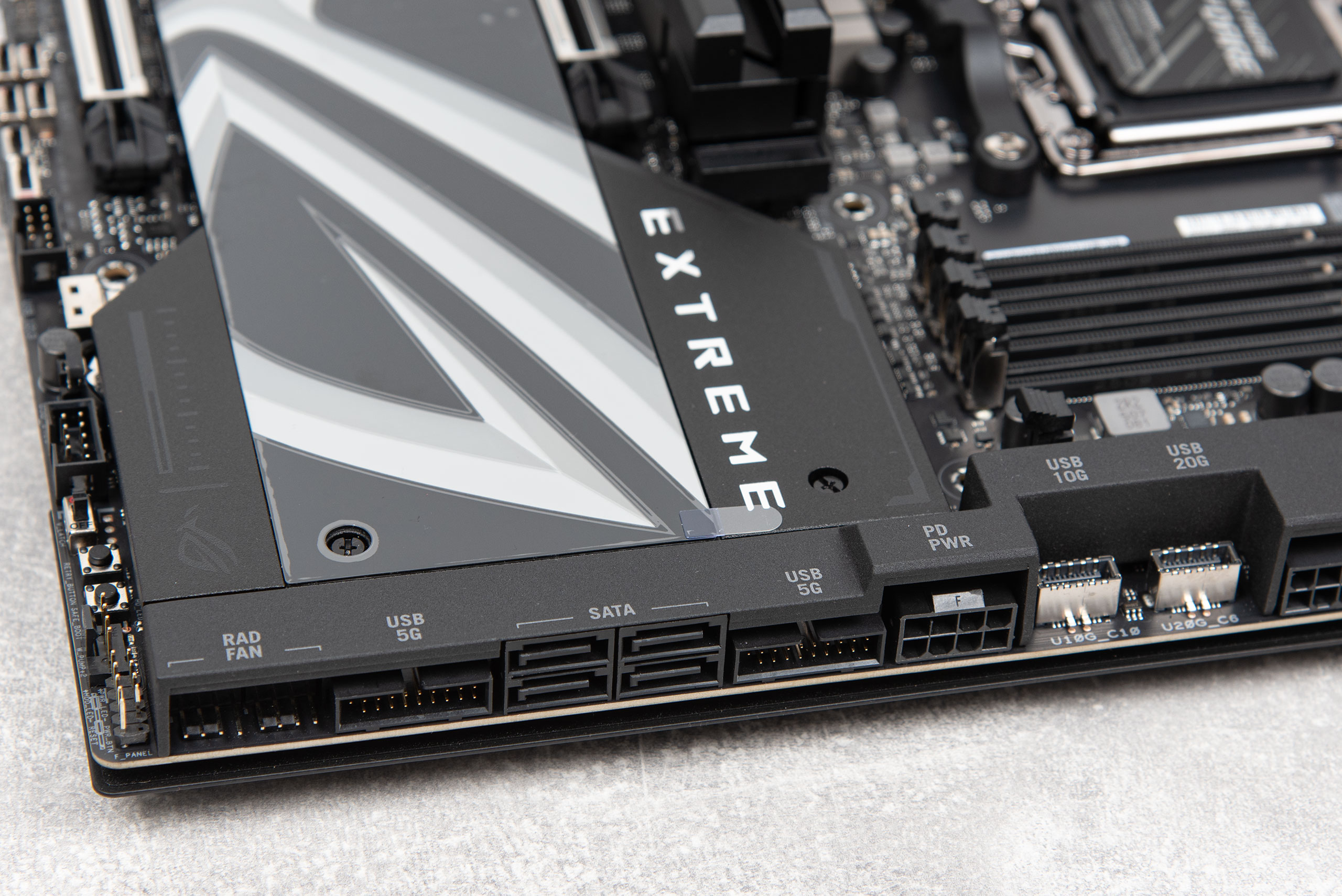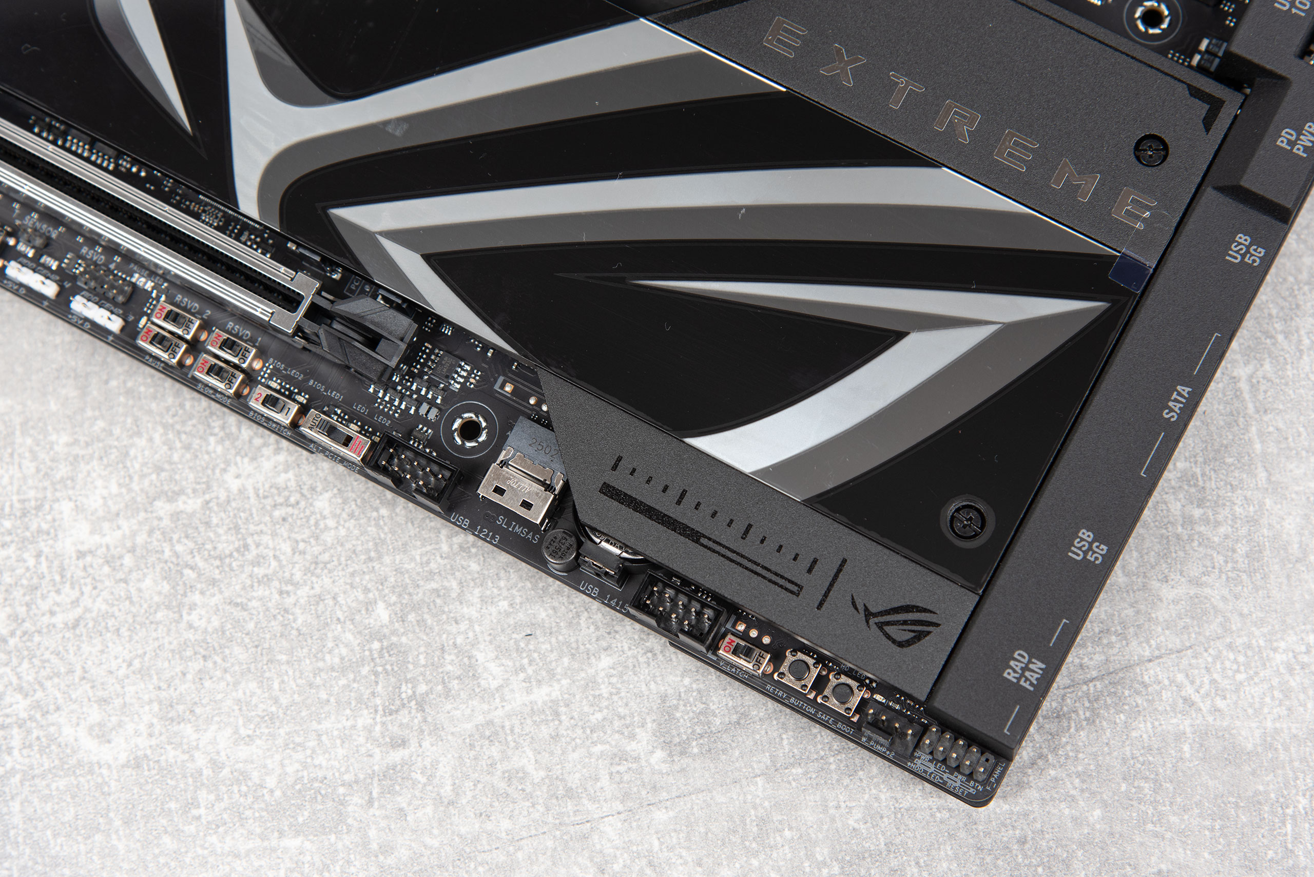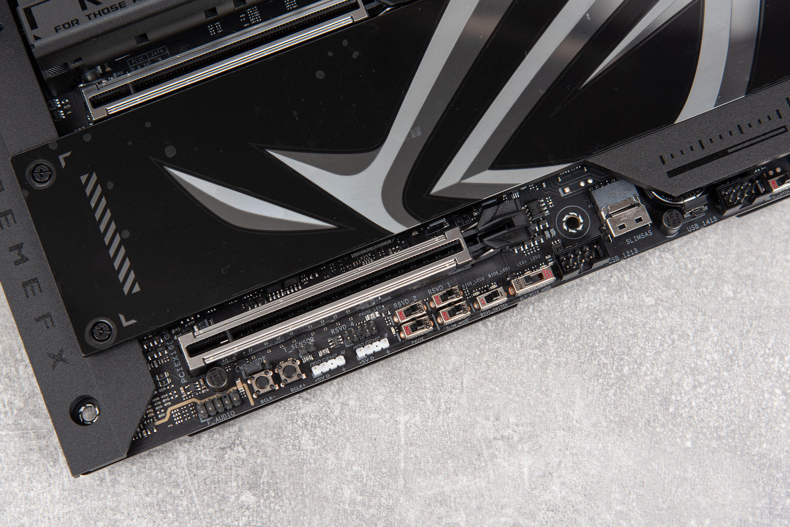 Снизу слева расположена традиционная контактная группа HD_AUDIO, кнопки управления частотой BCLK, два коннектора ADD_GEN2 (RGB 5V), джампер LN2, коннектор термопары, контактная группа RSVD (вероятно DEBUG), альтернатор PCIe (можно назначить другие функции). Присутствуют пять переключателей: PAUSE (управляемый фриз системы) SLOW_MODE (сброс множителей частот до минимальных), два переключателя RSVD (функциональность зависит от спец-прошивки для экстремального оверклокинга), переключатель микросхем прошивки материнской платы.