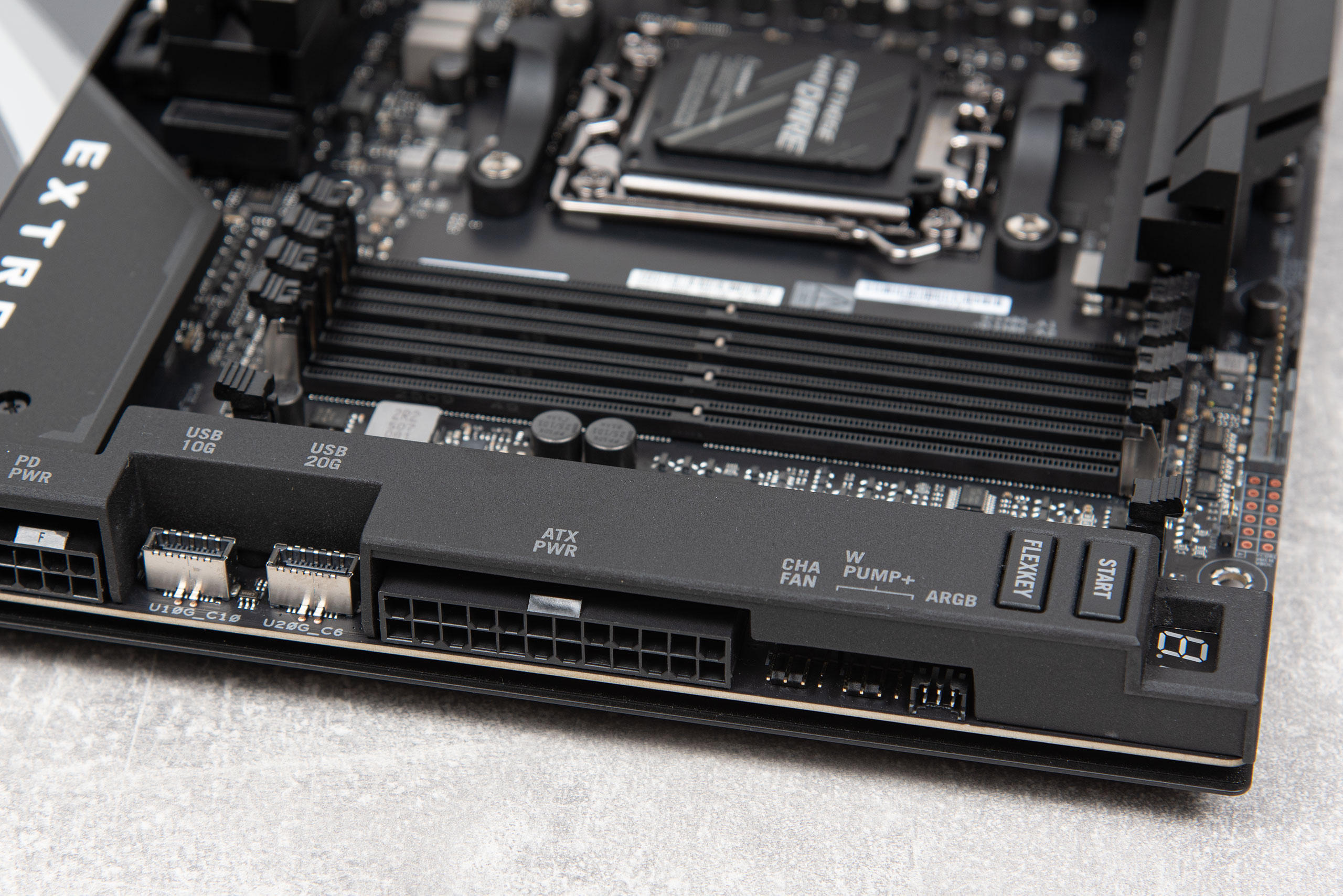 Справа сверху под углом 90 градусов выведены два разъема вентиляторов, разъем ARGB 6‑pin (с помощью кабеля из комплектации превращается в два дополнительных ADD_GEN2), а также типичный коннектор питания материнской платы. На краю защитного каркаса расположены кнопки Start, Flexkey, а также диагностическая зона POST.