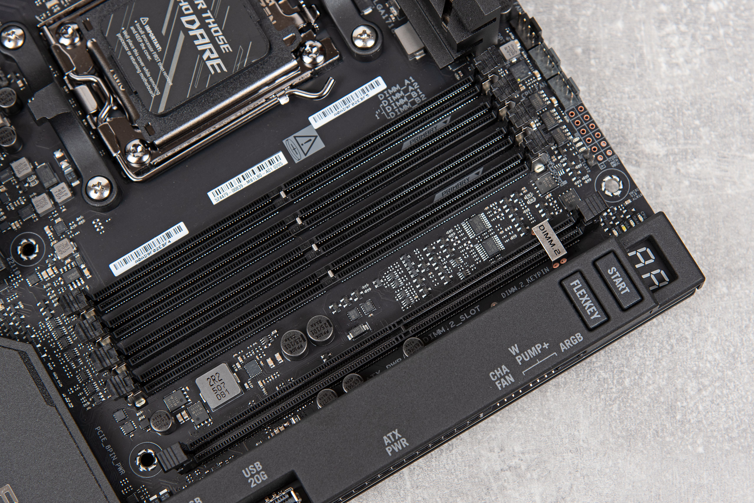 Слоты оперативной памяти имеют защелки с обеих сторон, а также снабжены фирменной технологией производителя NitroPath. В стороне размещен слот DIMM.2 для установки соответствующего модуля под M.2 накопители.