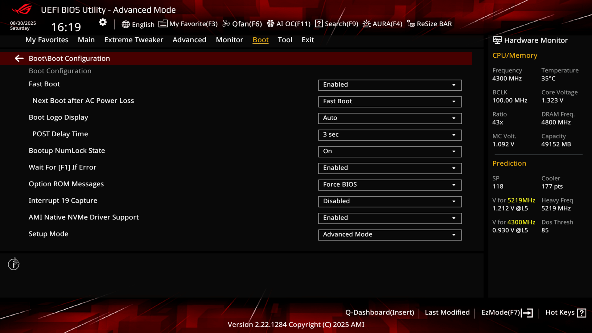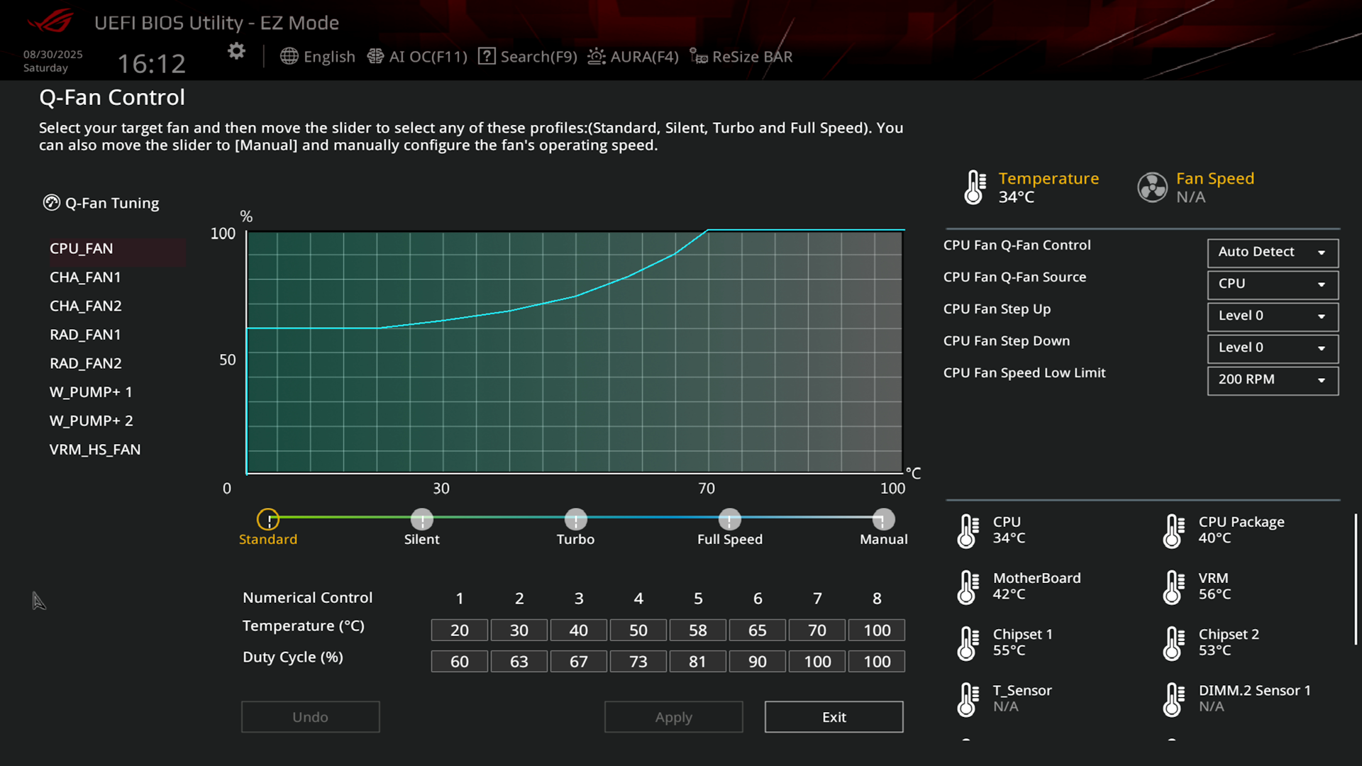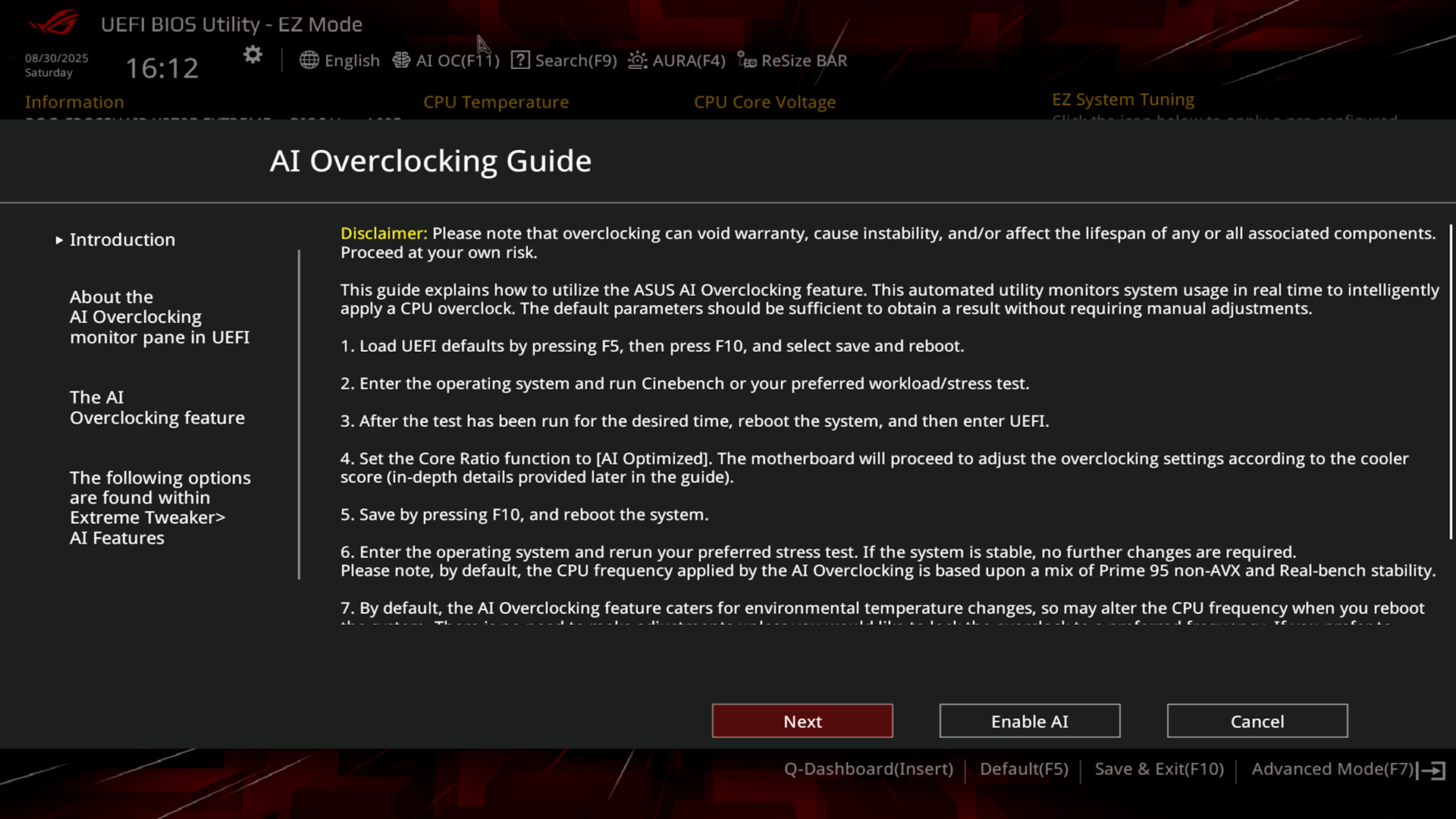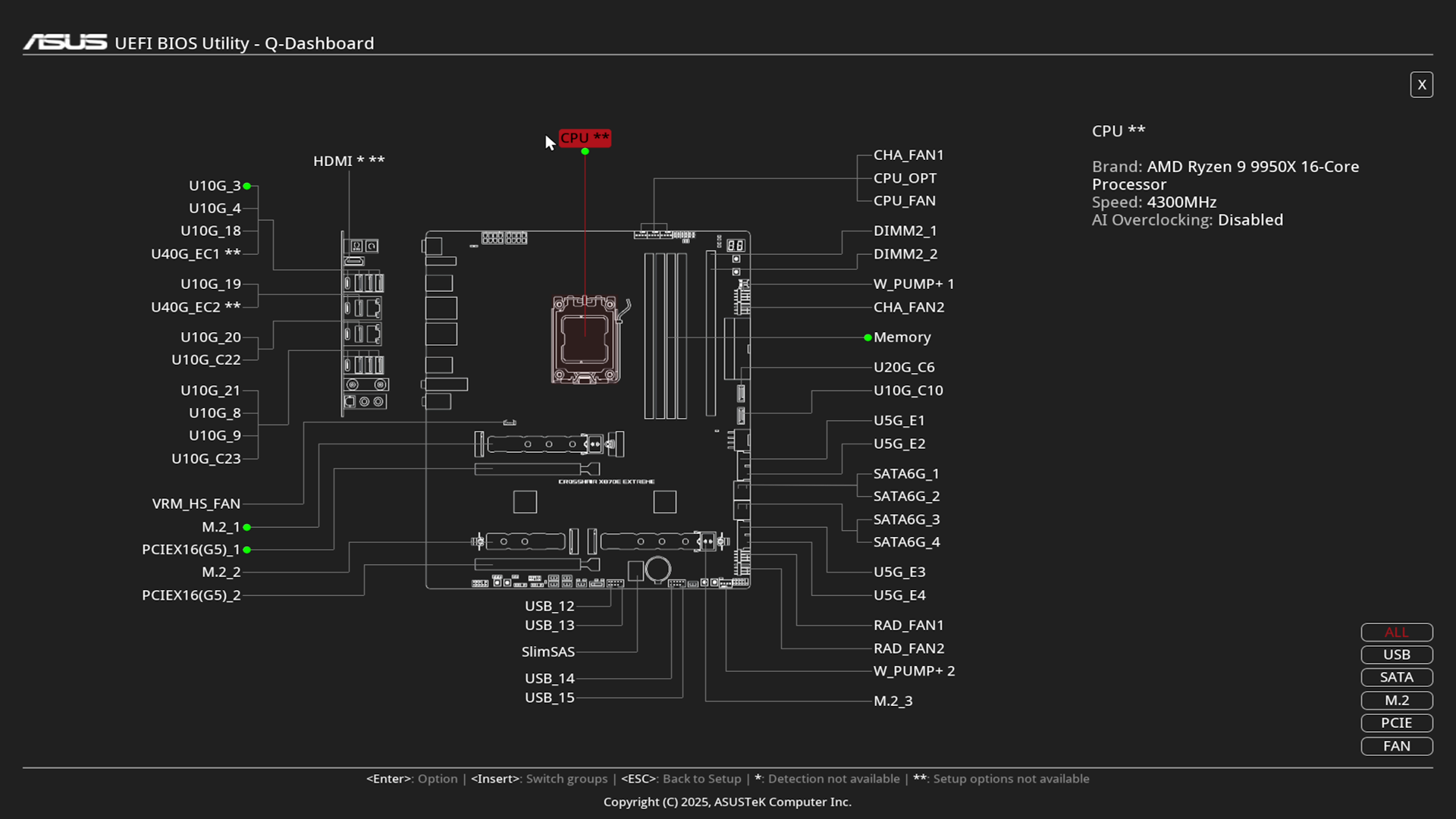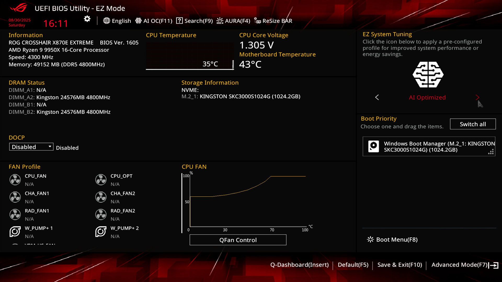 Интерфейс EZ Mode реализован в рамках одной страницы. В нем пользователь может получить стандартный отчет по ключевым элементам системы, указать системное время, выбрать язык интерфейса, найти нужную опцию по поиску, настроить AURA (система RGB), ResizeBAR, кривую оборотов вентиляторов, задействовать профили AMD EXPO в случае их наличия или AEMP (ASUS Enhanced Memory Profile) для своего комплекта ОЗУ, настроить RAID (доступная функциональность зависит от процессора), указать приоритет загрузки из сети или накопителей, а также вызвать интерфейс Q‑Dashboard. Кроме того, в наличии автоматический оверклокинг системы AI Optimized, который может отдать приоритет оптимизации (Power Efficient), либо приоритизировать производительность (Performance).
