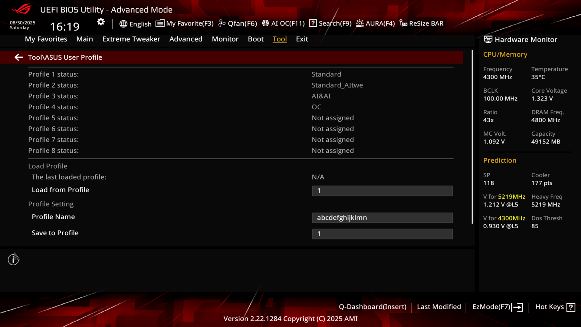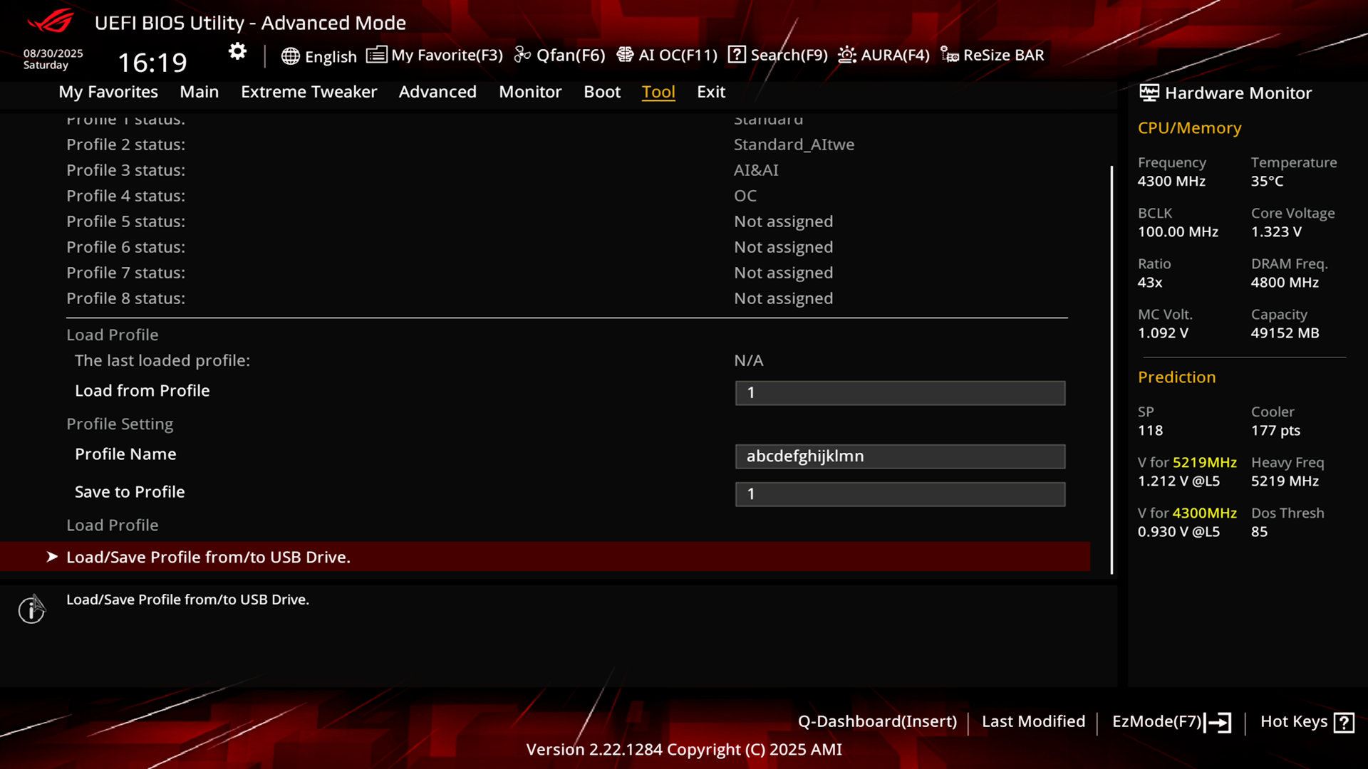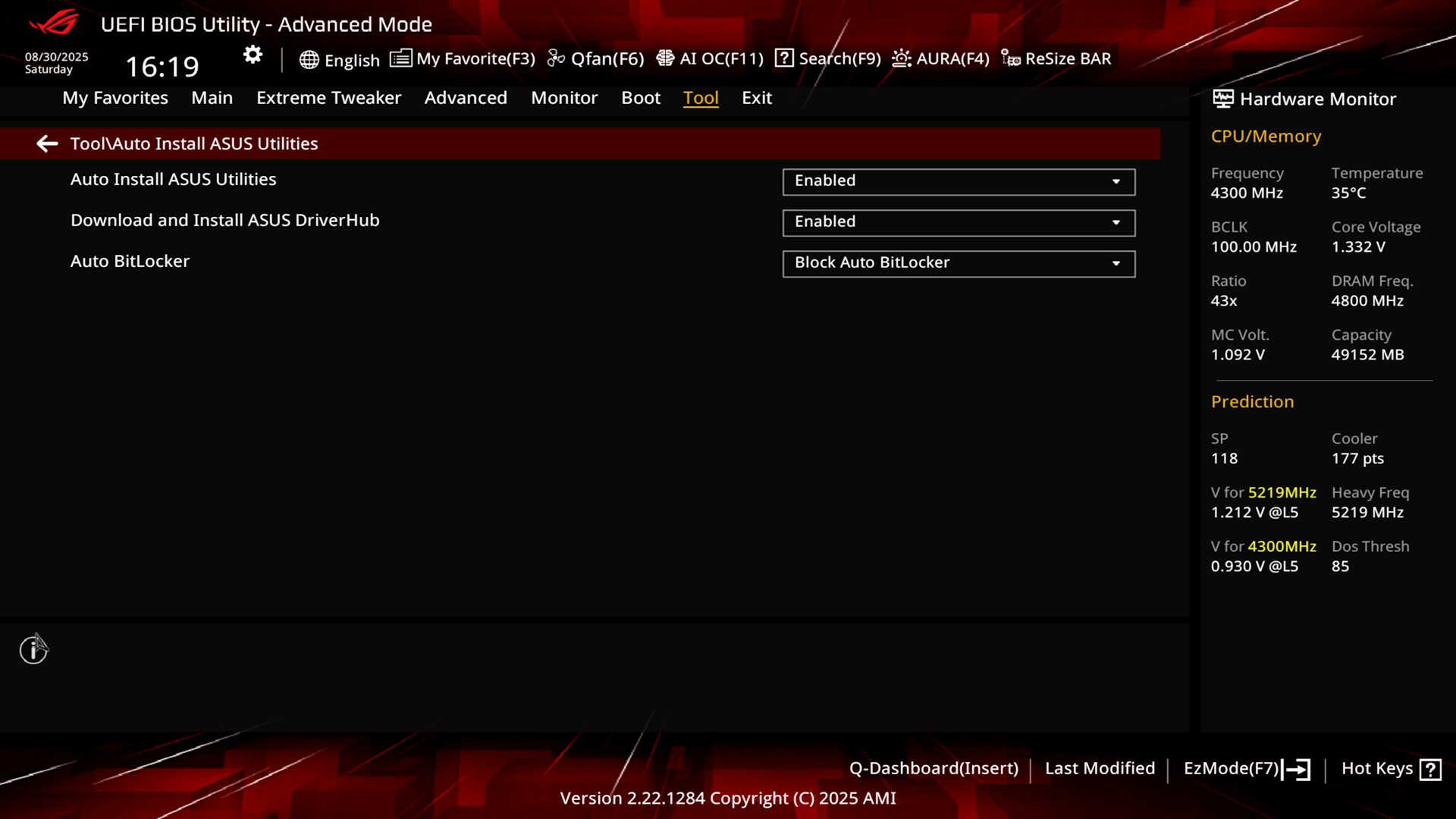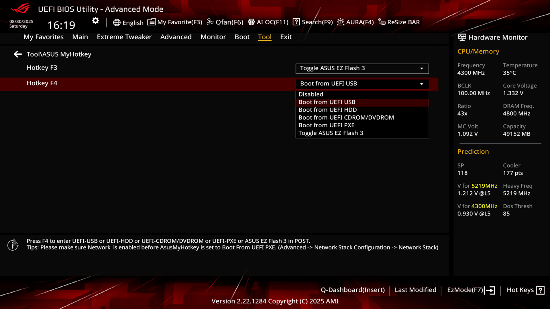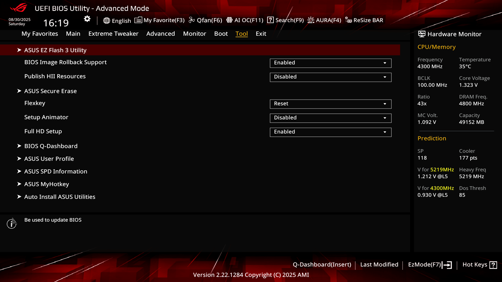 Вкладка Tool: здесь находятся система профилей настроек ASUS User Profile (хранятся в памяти платы, либо импортируются/экспортируются на внешние накопители), управление фирменными технологиями производителя вроде ASUS DriverHub, MyHotKey, ASUS EZ Flash 3 Utility (для обновления прошивки), Secure Erase для накопителей, FlexKey. Также присутствует еще одна ссылка вызова BIOS Q‑Dashboard.