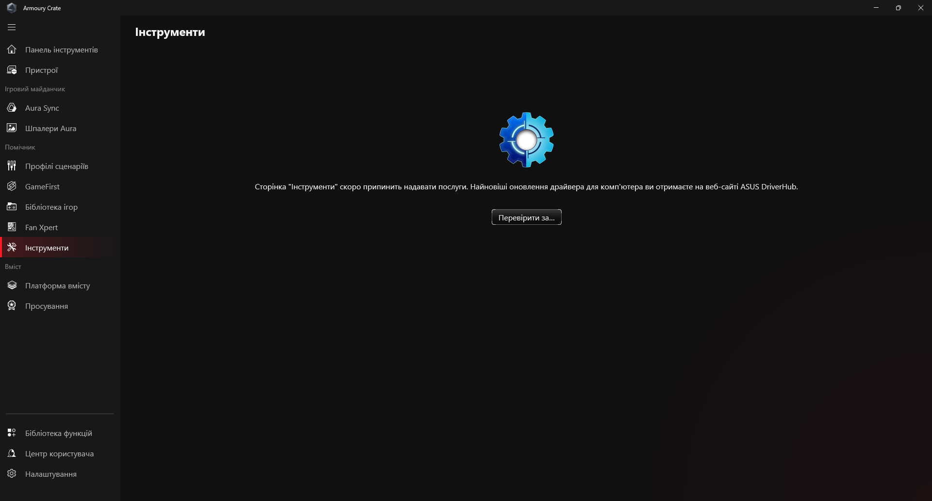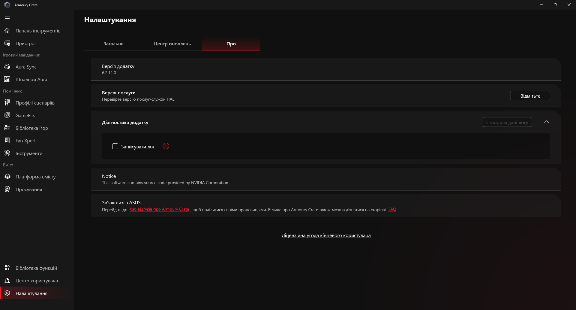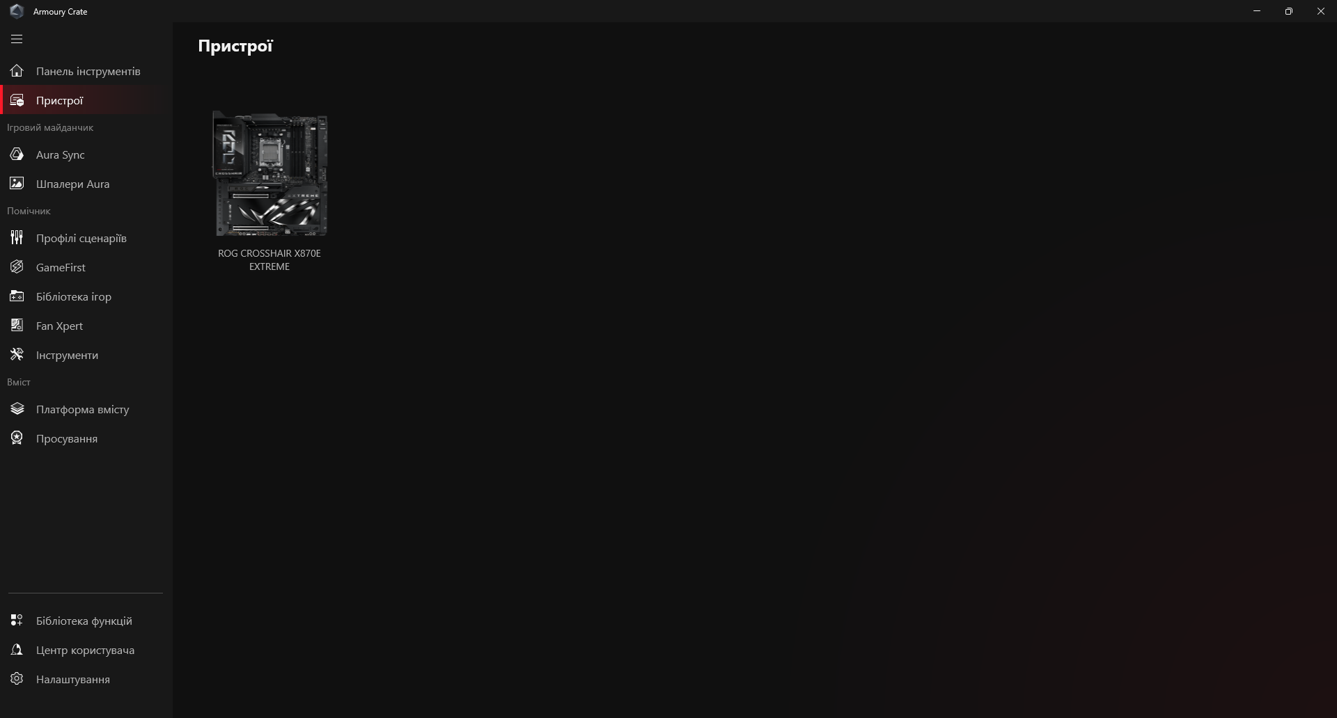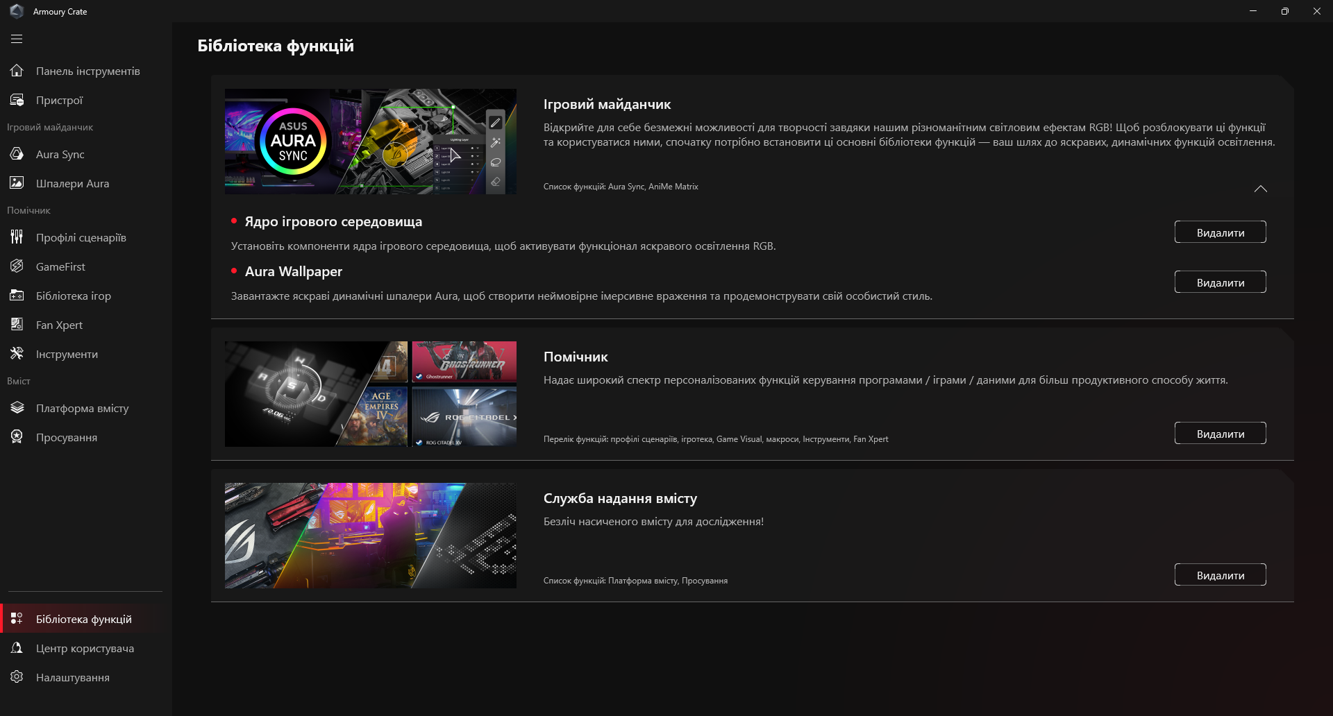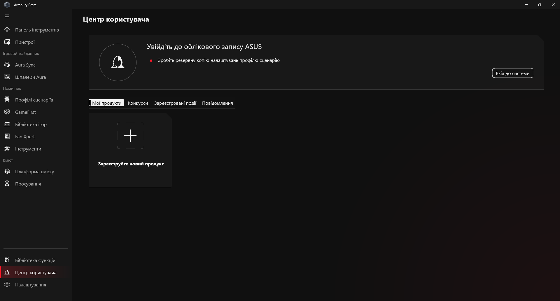 Главный хаб устройств и продукции ASUS — Armoury Crate. Благодаря ему все синхронизируется и управляется из единой консоли. Базовое приложение позволяет зарегистрировать продукт, управлять RGB, получить сводку по различным узлам платформы и управлять ими. Возможно обновлять прошивки фирменных устройств вроде манипуляторов, а также настраивать их через интерфейс Armoury Crate. Дополнительно можно оптимизировать систему под обнаруженные игры, создавать профили для разных сценариев использования, установить дополнительные модули типа Virtual Pet, добавить функции игровой площадки, помощника, службы предоставления контента. В приложении присутствует украинская локализация. Обновление драйверов происходит отдельно через веб-интерфейс ASUS DriverHub.