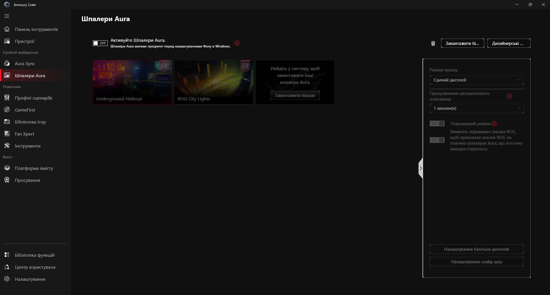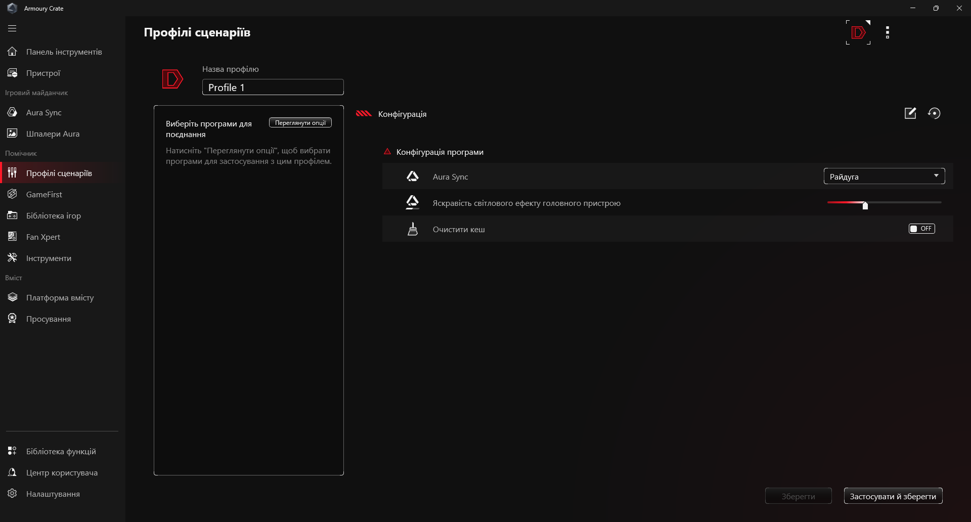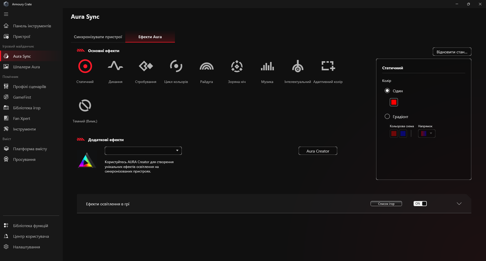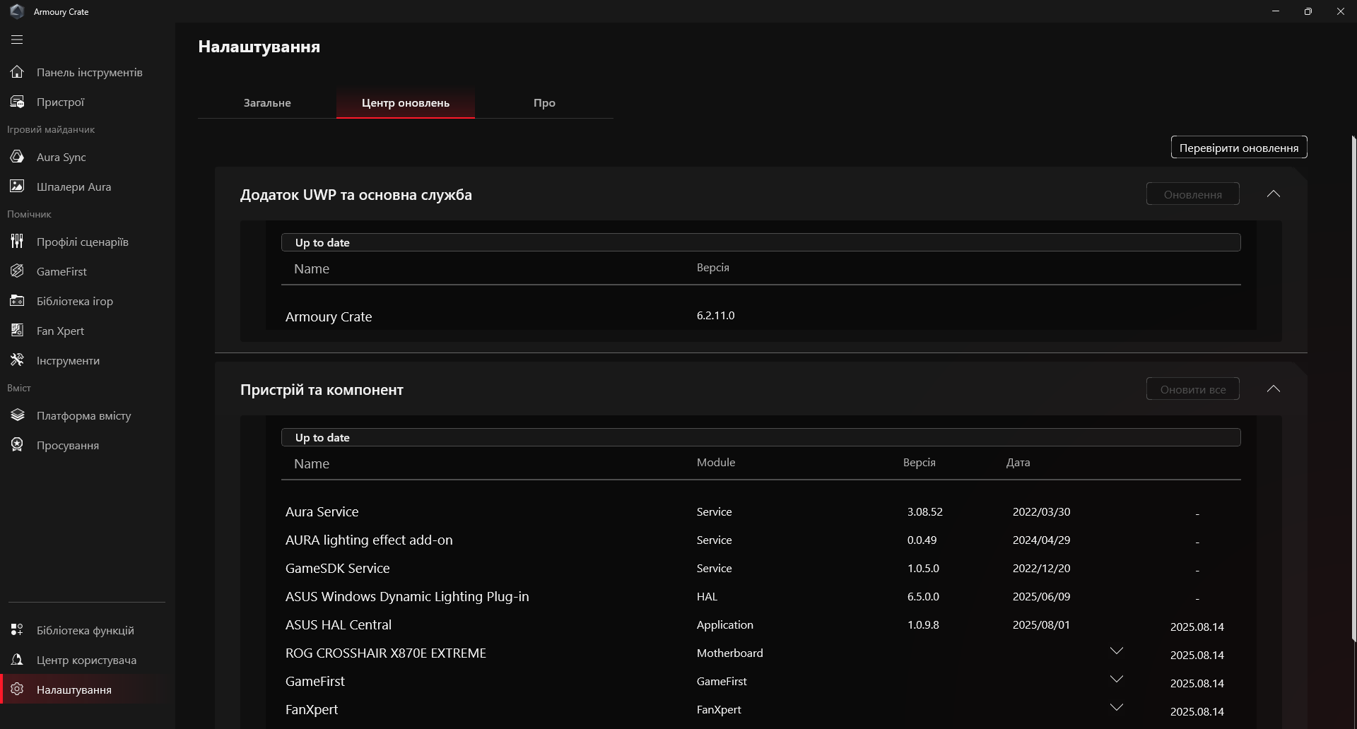 Главный хаб устройств и продукции ASUS — Armoury Crate. Благодаря ему все синхронизируется и управляется из единой консоли. Базовое приложение позволяет зарегистрировать продукт, управлять RGB, получить сводку по различным узлам платформы и управлять ими. Возможно обновлять прошивки фирменных устройств вроде манипуляторов, а также настраивать их через интерфейс Armoury Crate. Дополнительно можно оптимизировать систему под обнаруженные игры, создавать профили для разных сценариев использования, установить дополнительные модули типа Virtual Pet, добавить функции игровой площадки, помощника, службы предоставления контента. В приложении присутствует украинская локализация. Обновление драйверов происходит отдельно через веб-интерфейс ASUS DriverHub.