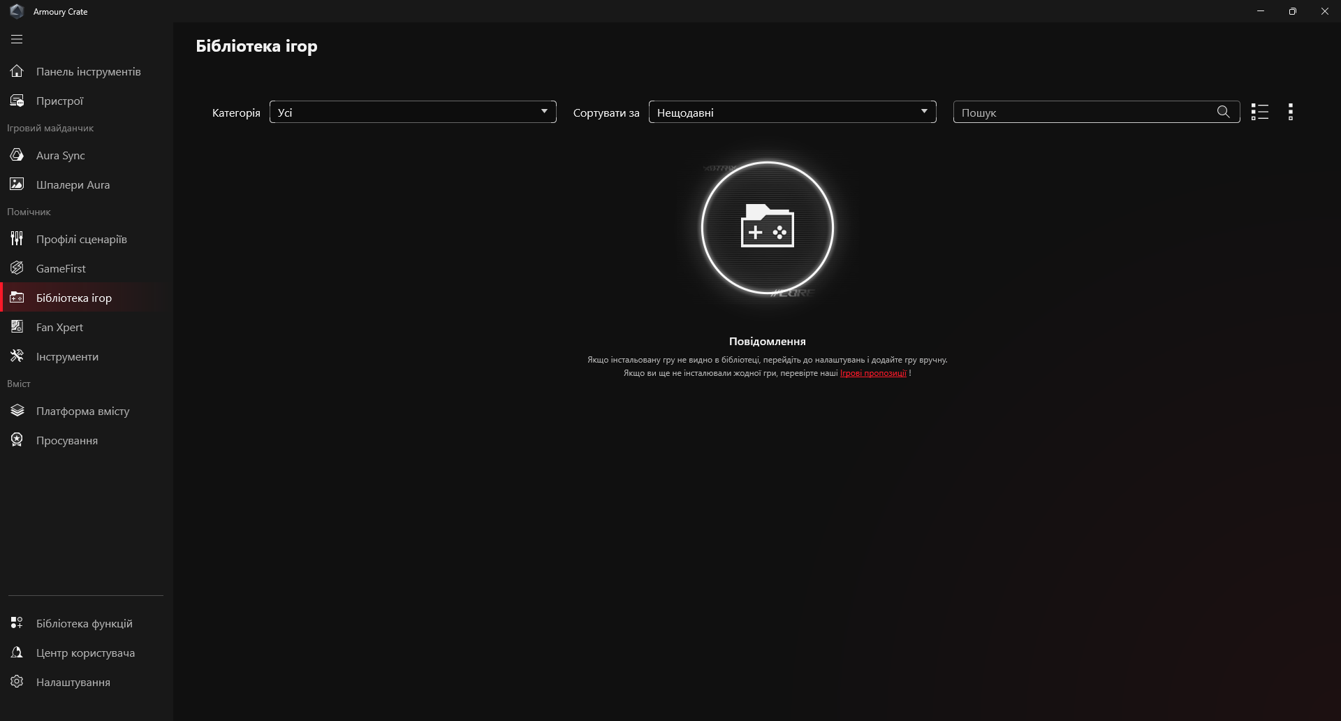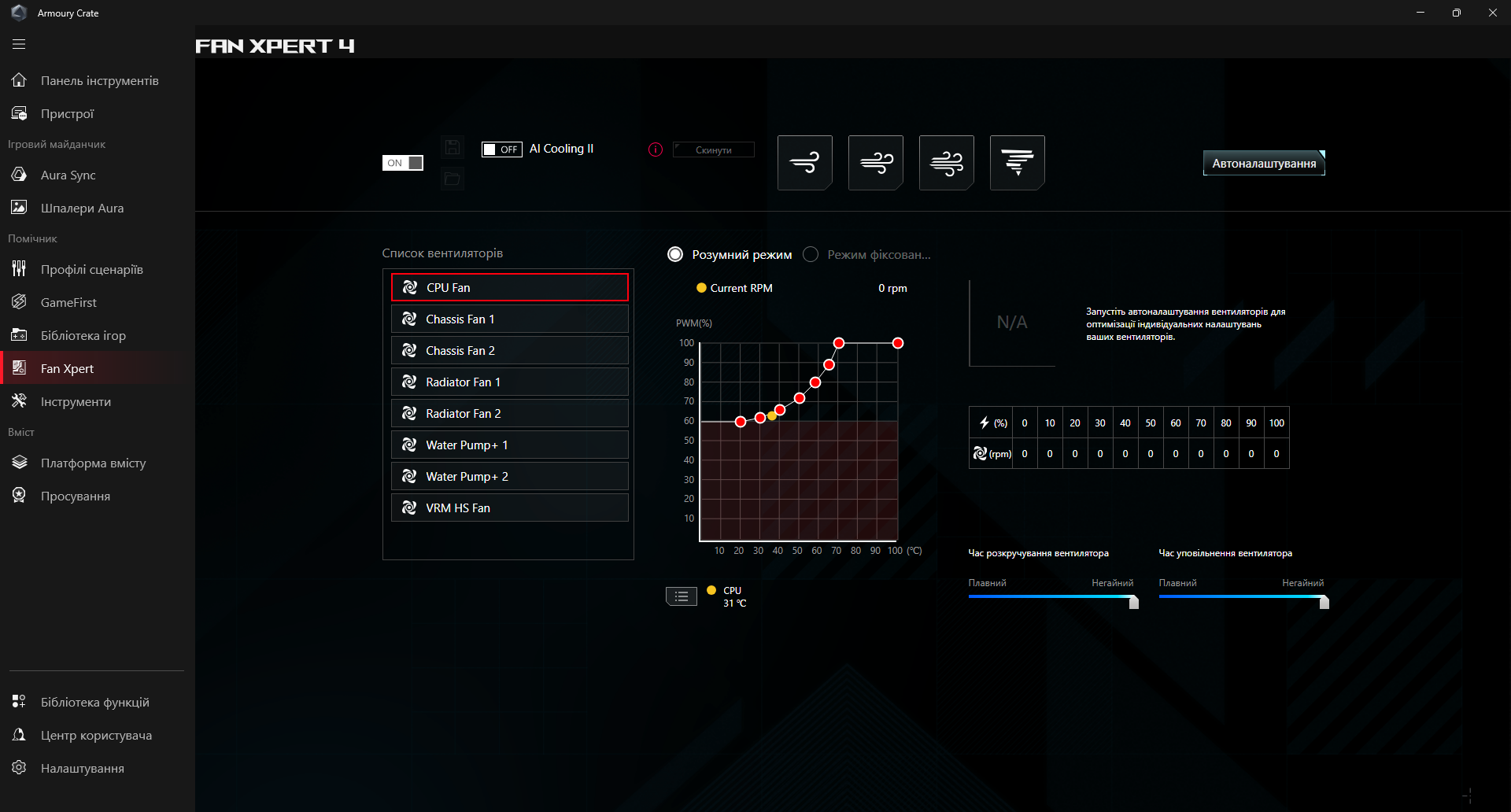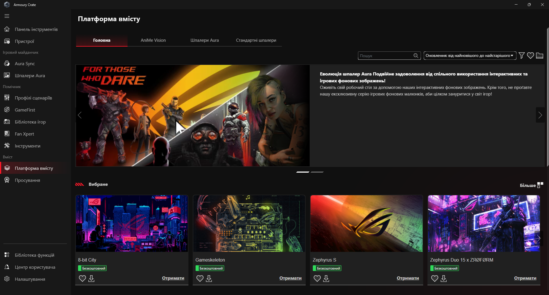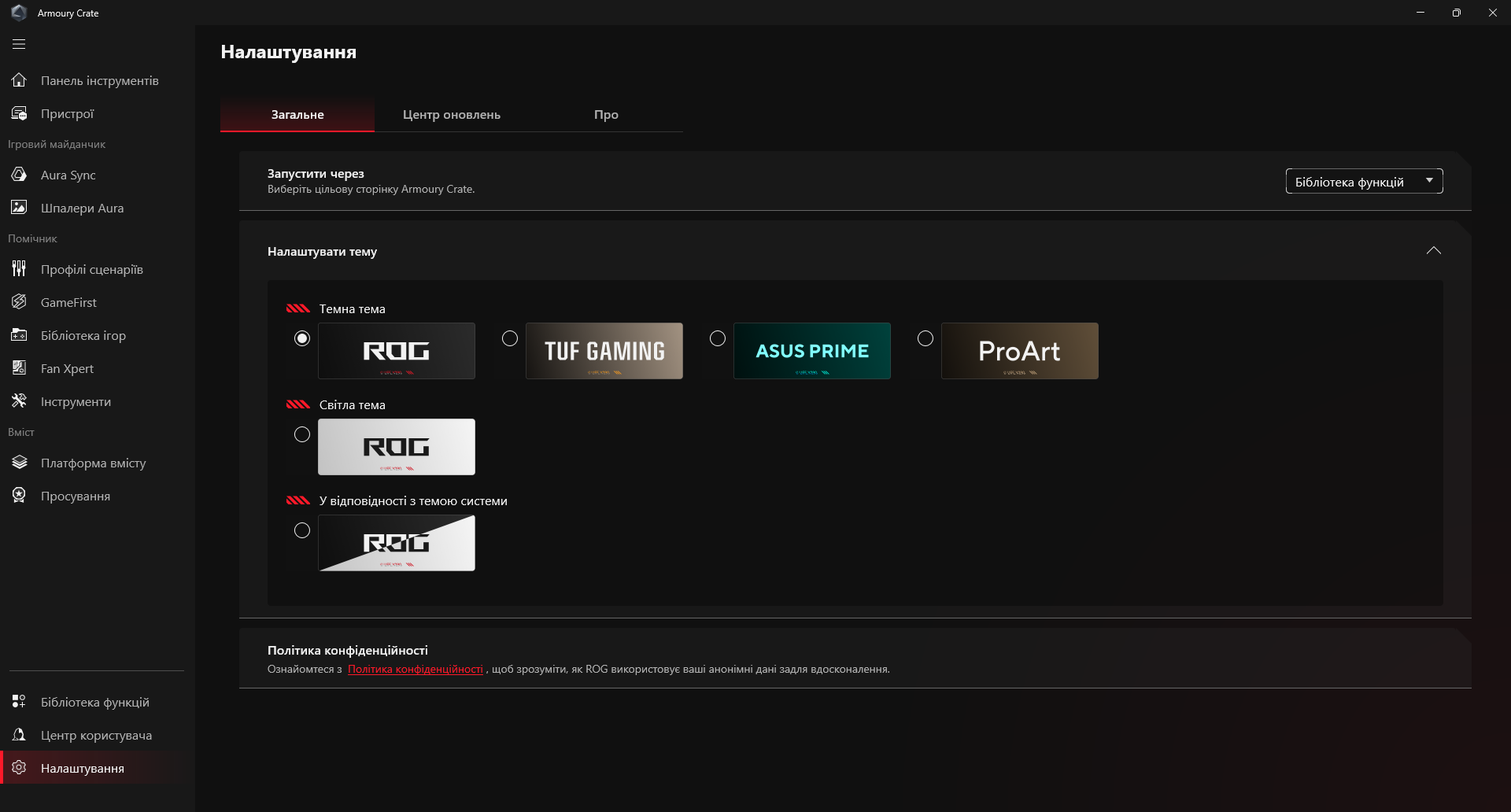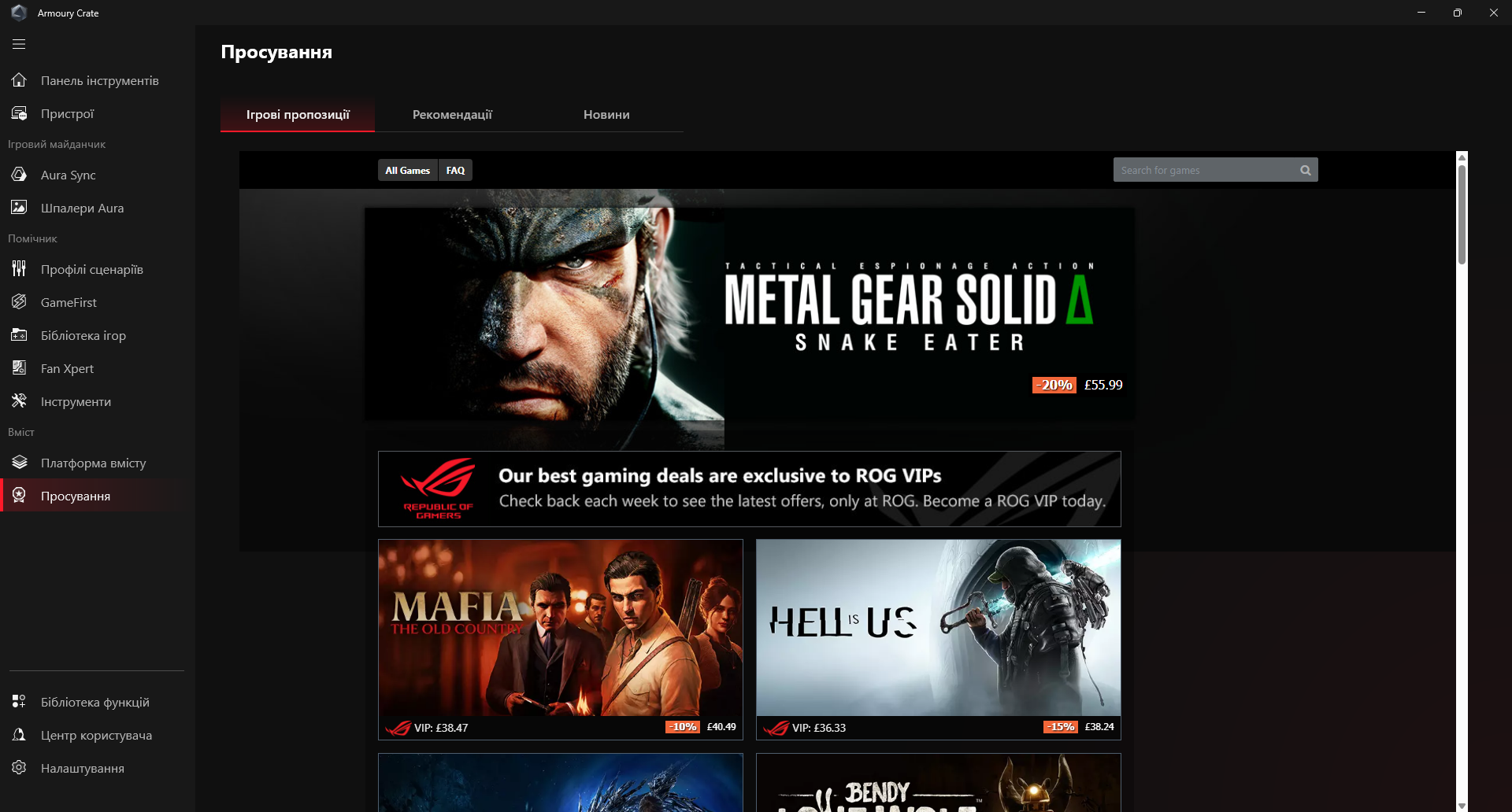 Главный хаб устройств и продукции ASUS — Armoury Crate. Благодаря ему все синхронизируется и управляется из единой консоли. Базовое приложение позволяет зарегистрировать продукт, управлять RGB, получить сводку по различным узлам платформы и управлять ими. Возможно обновлять прошивки фирменных устройств вроде манипуляторов, а также настраивать их через интерфейс Armoury Crate. Дополнительно можно оптимизировать систему под обнаруженные игры, создавать профили для разных сценариев использования, установить дополнительные модули типа Virtual Pet, добавить функции игровой площадки, помощника, службы предоставления контента. В приложении присутствует украинская локализация. Обновление драйверов происходит отдельно через веб-интерфейс ASUS DriverHub.