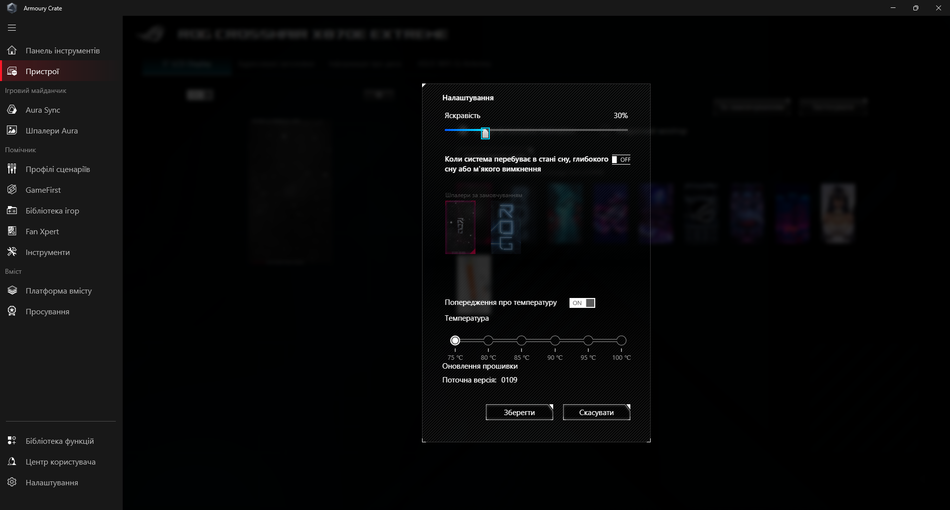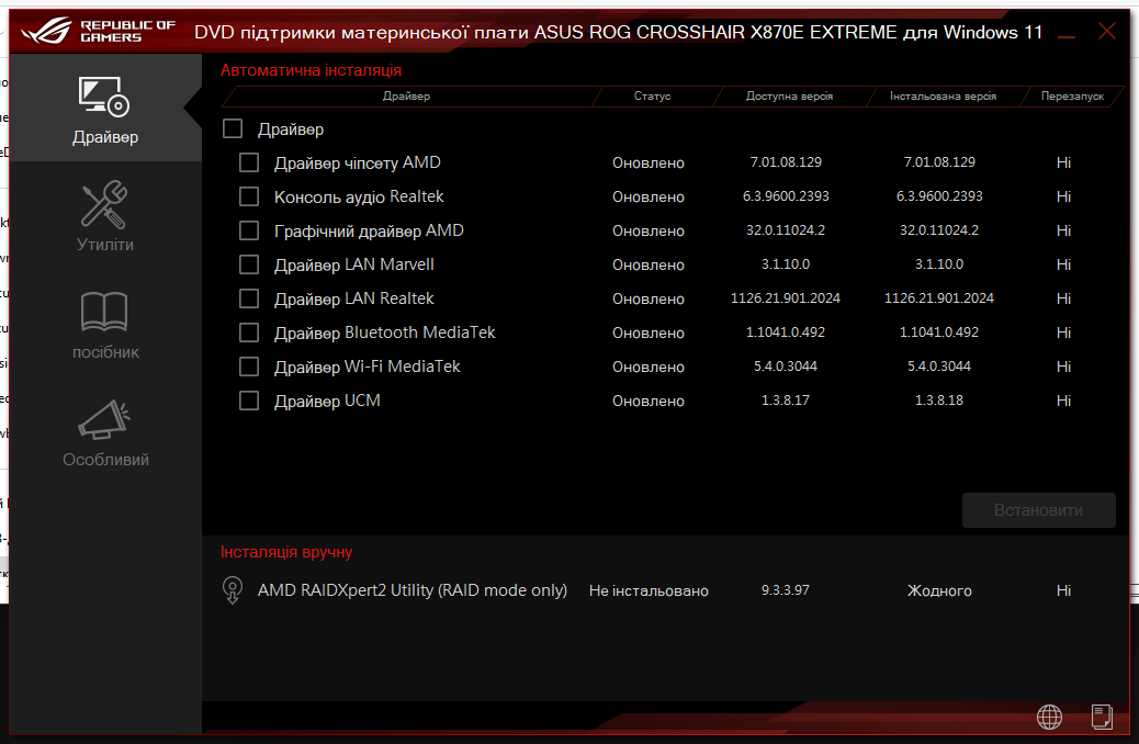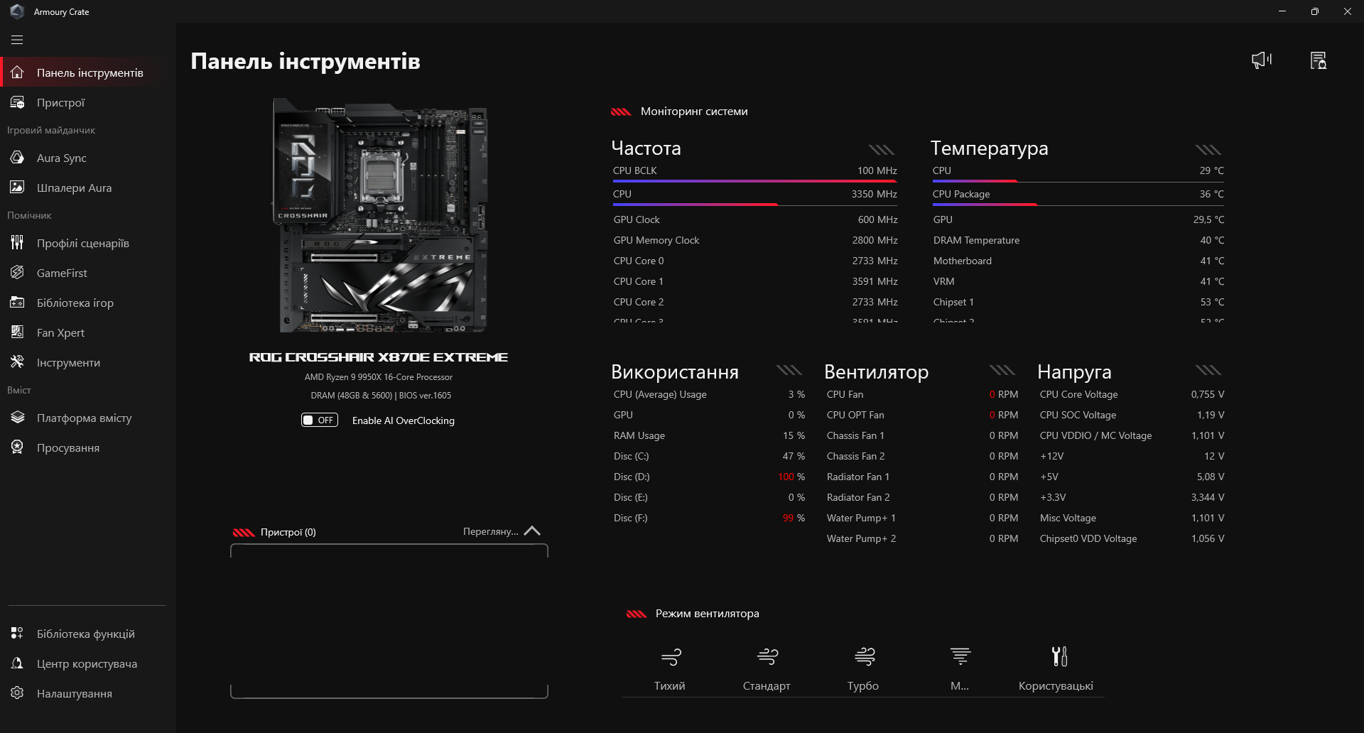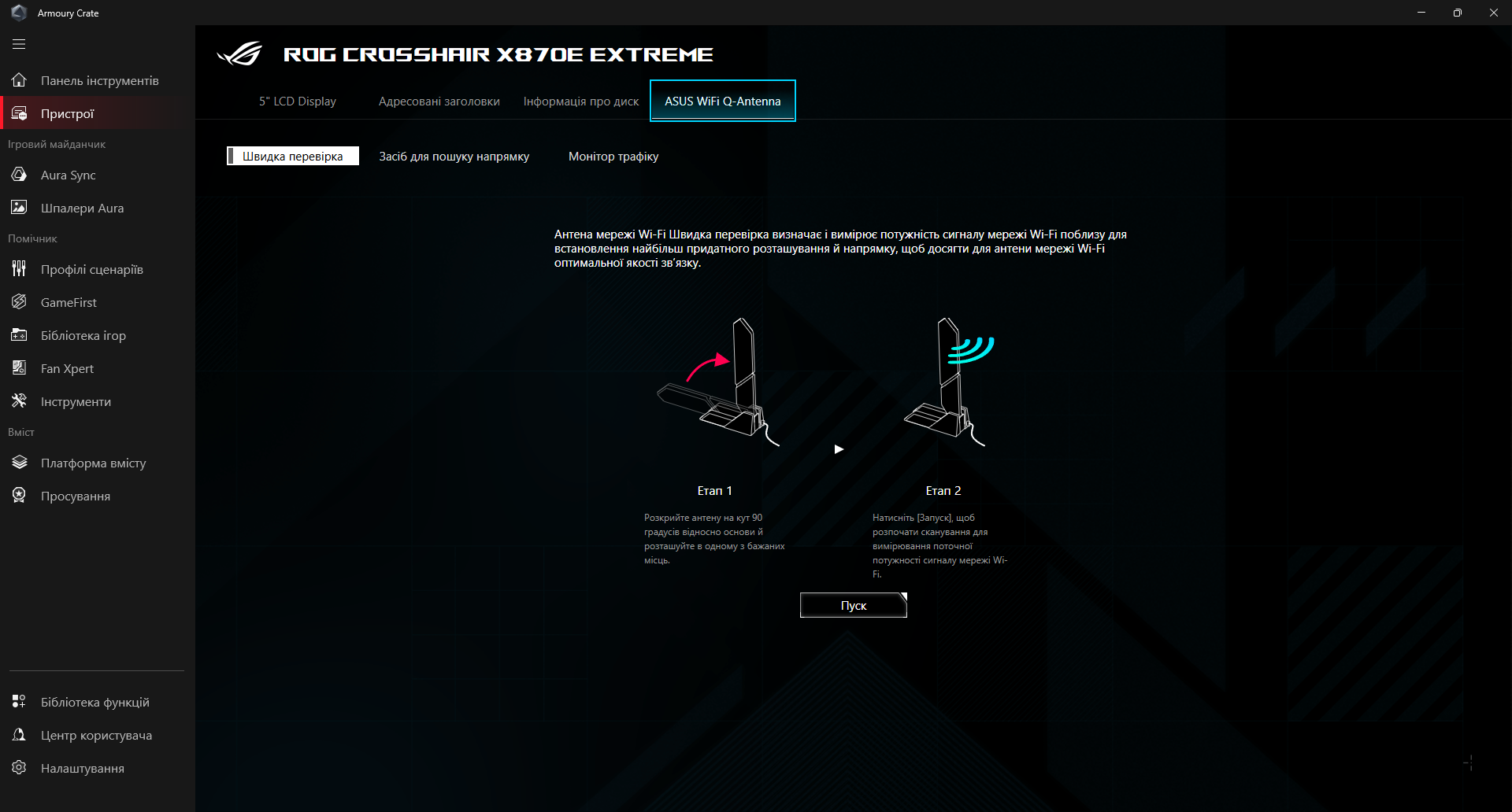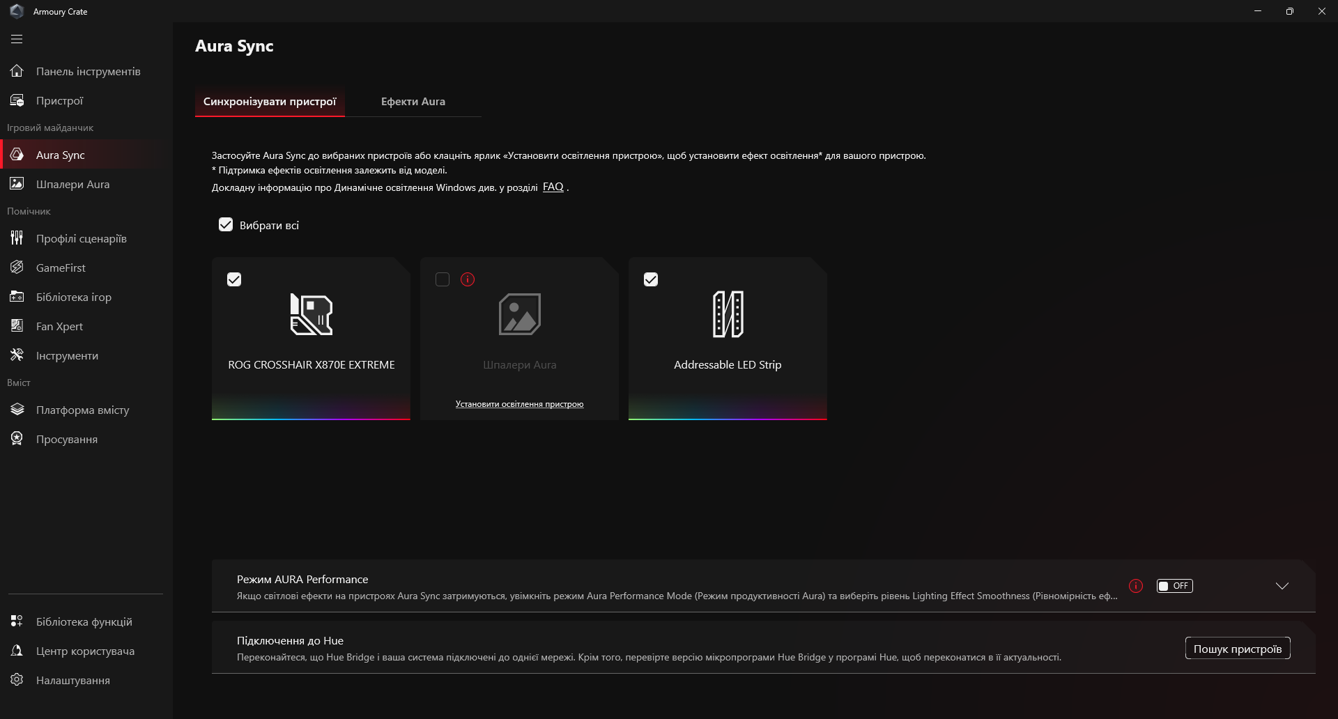 Главный хаб устройств и продукции ASUS — Armoury Crate. Благодаря ему все синхронизируется и управляется из единой консоли. Базовое приложение позволяет зарегистрировать продукт, управлять RGB, получить сводку по различным узлам платформы и управлять ими. Возможно обновлять прошивки фирменных устройств вроде манипуляторов, а также настраивать их через интерфейс Armoury Crate. Дополнительно можно оптимизировать систему под обнаруженные игры, создавать профили для разных сценариев использования, установить дополнительные модули типа Virtual Pet, добавить функции игровой площадки, помощника, службы предоставления контента. В приложении присутствует украинская локализация. Обновление драйверов происходит отдельно через веб-интерфейс ASUS DriverHub.