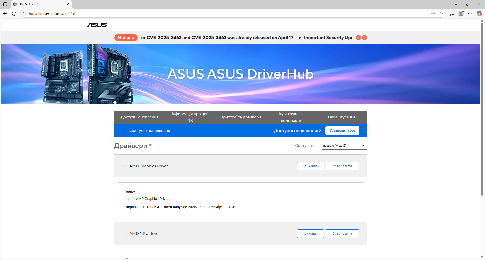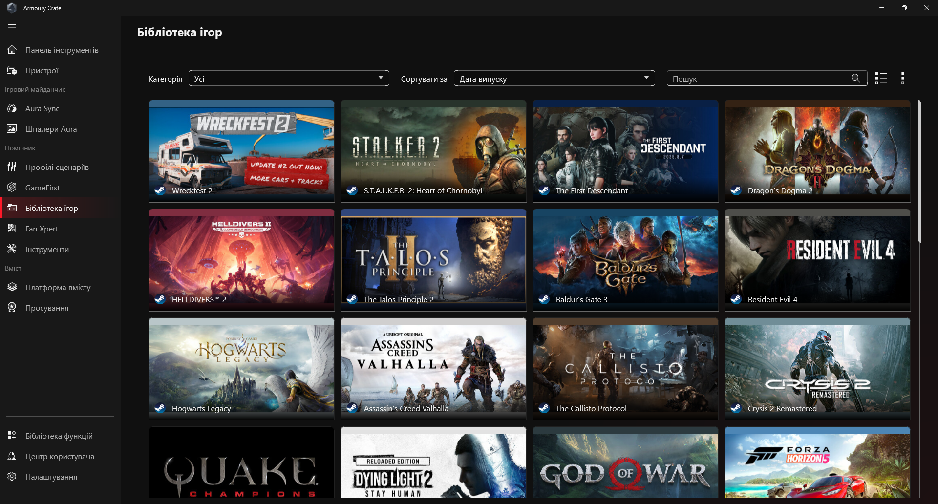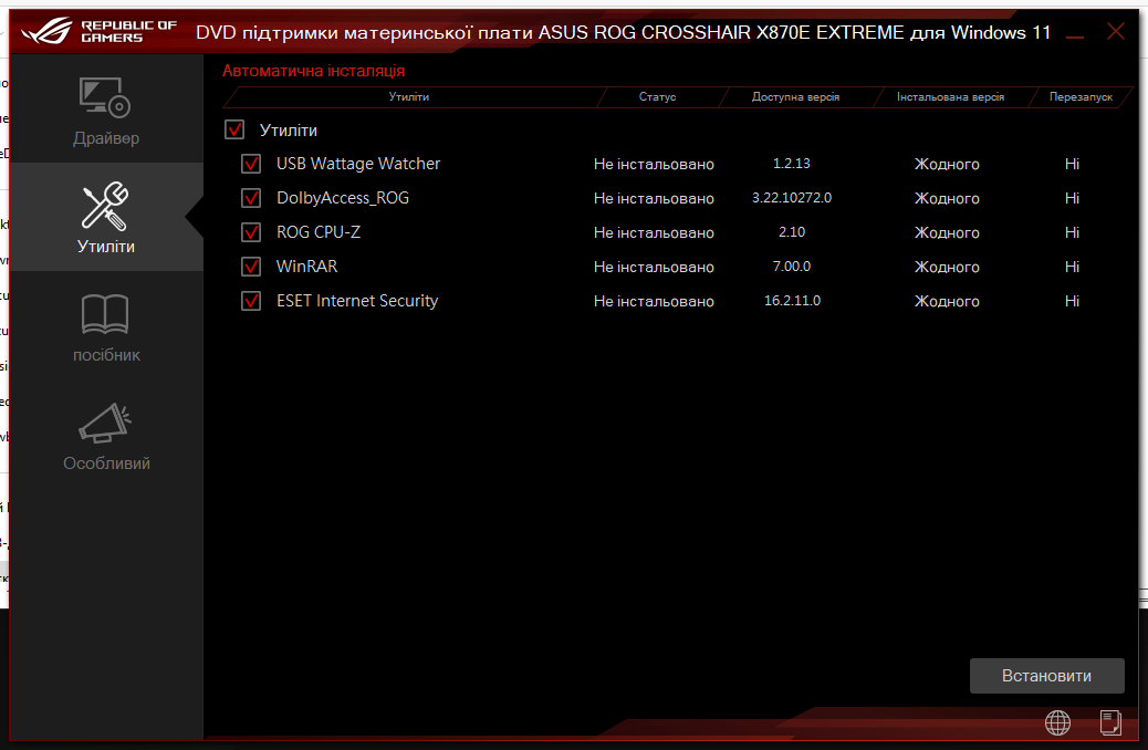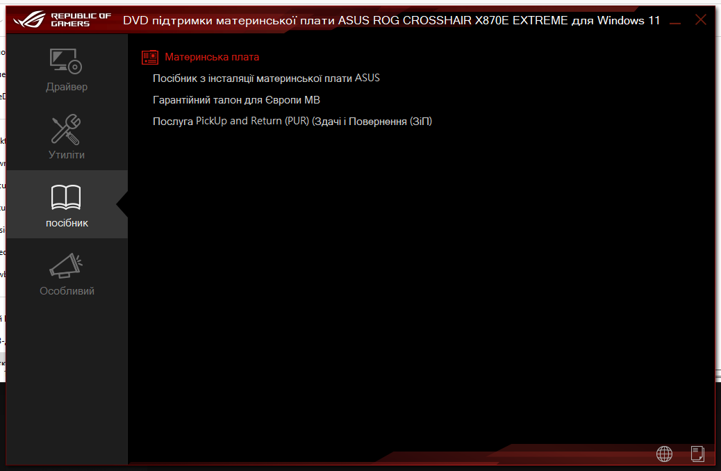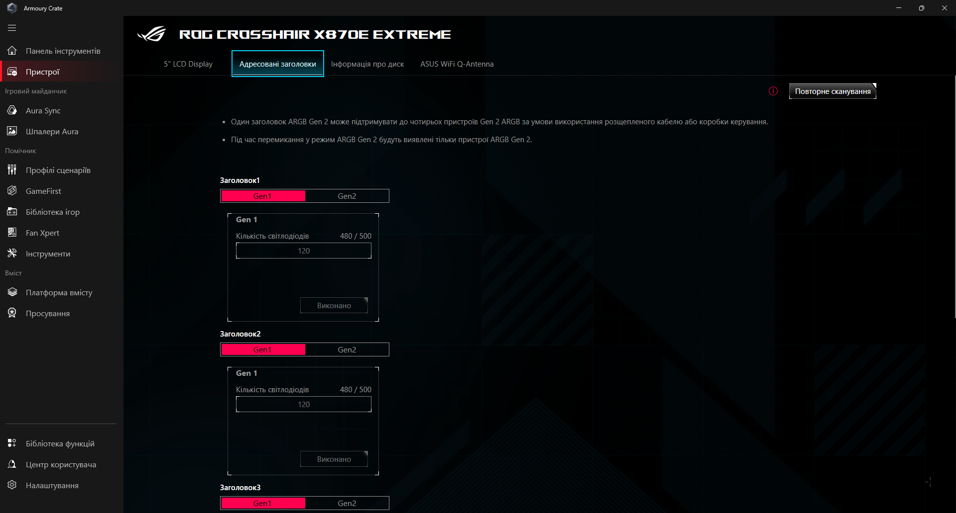 Главный хаб устройств и продукции ASUS — Armoury Crate. Благодаря ему все синхронизируется и управляется из единой консоли. Базовое приложение позволяет зарегистрировать продукт, управлять RGB, получить сводку по различным узлам платформы и управлять ими. Возможно обновлять прошивки фирменных устройств вроде манипуляторов, а также настраивать их через интерфейс Armoury Crate. Дополнительно можно оптимизировать систему под обнаруженные игры, создавать профили для разных сценариев использования, установить дополнительные модули типа Virtual Pet, добавить функции игровой площадки, помощника, службы предоставления контента. В приложении присутствует украинская локализация. Обновление драйверов происходит отдельно через веб-интерфейс ASUS DriverHub.