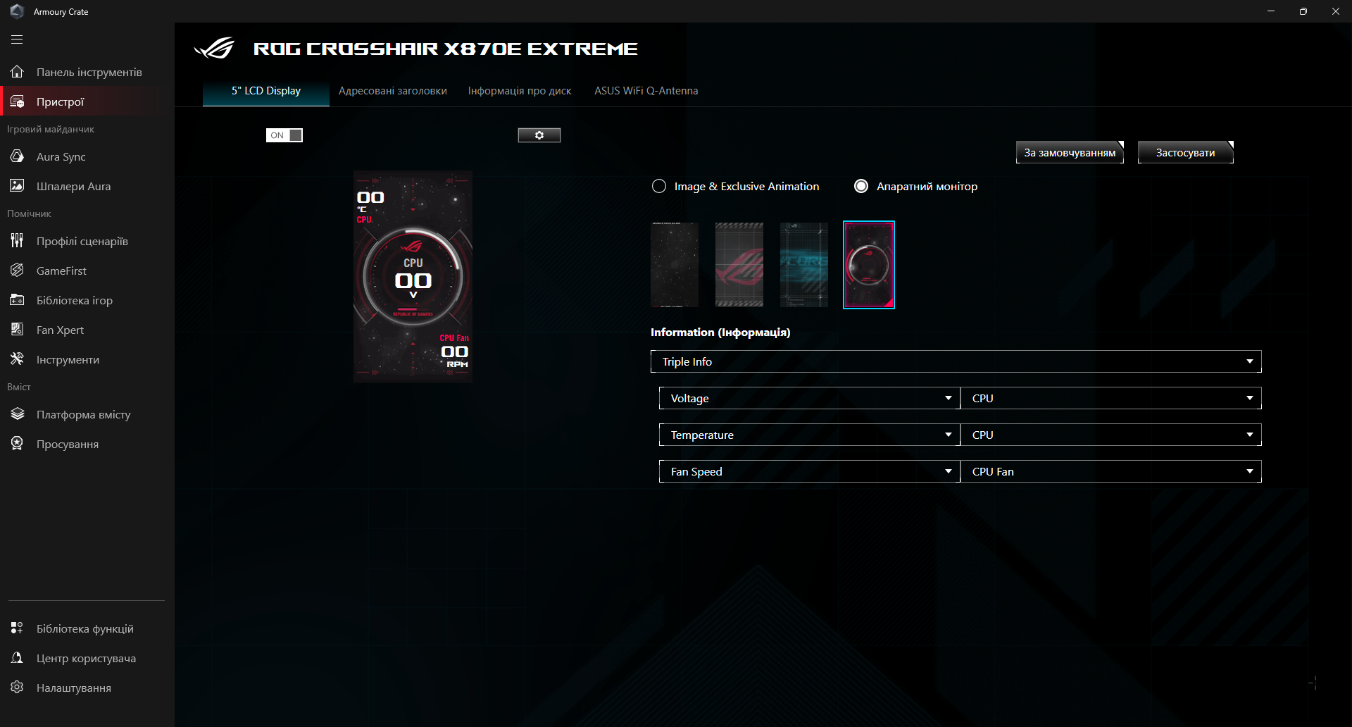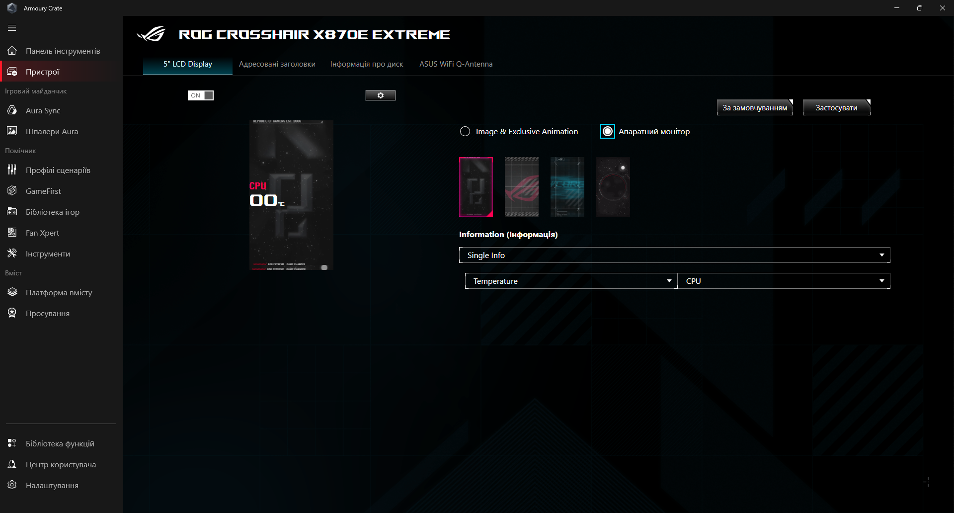 Сперва главное — эксплуатировать его как полноценный дисплей, например выводить на него системную картинку и играть в Counter-Strike 2 не получится. Он управляется через программный хаб ArmouryCrate. Когда система выключена (но не обесточена) экран может показывать фирменные анимации. Во время запуска он дублирует показ POST-кодов. После инициализации системы — переходит в стандартный режим работы. По умолчанию дисплей выводит телеметрию с ключевых датчиков системы (можно показывать информацию от одного до пяти одновременно), например: температура ЦП, обороты вентилятора, напряжение и прочее. Доступна функция регулировки яркости дисплея. Из полезного есть функция тревоги в случае перегрева.