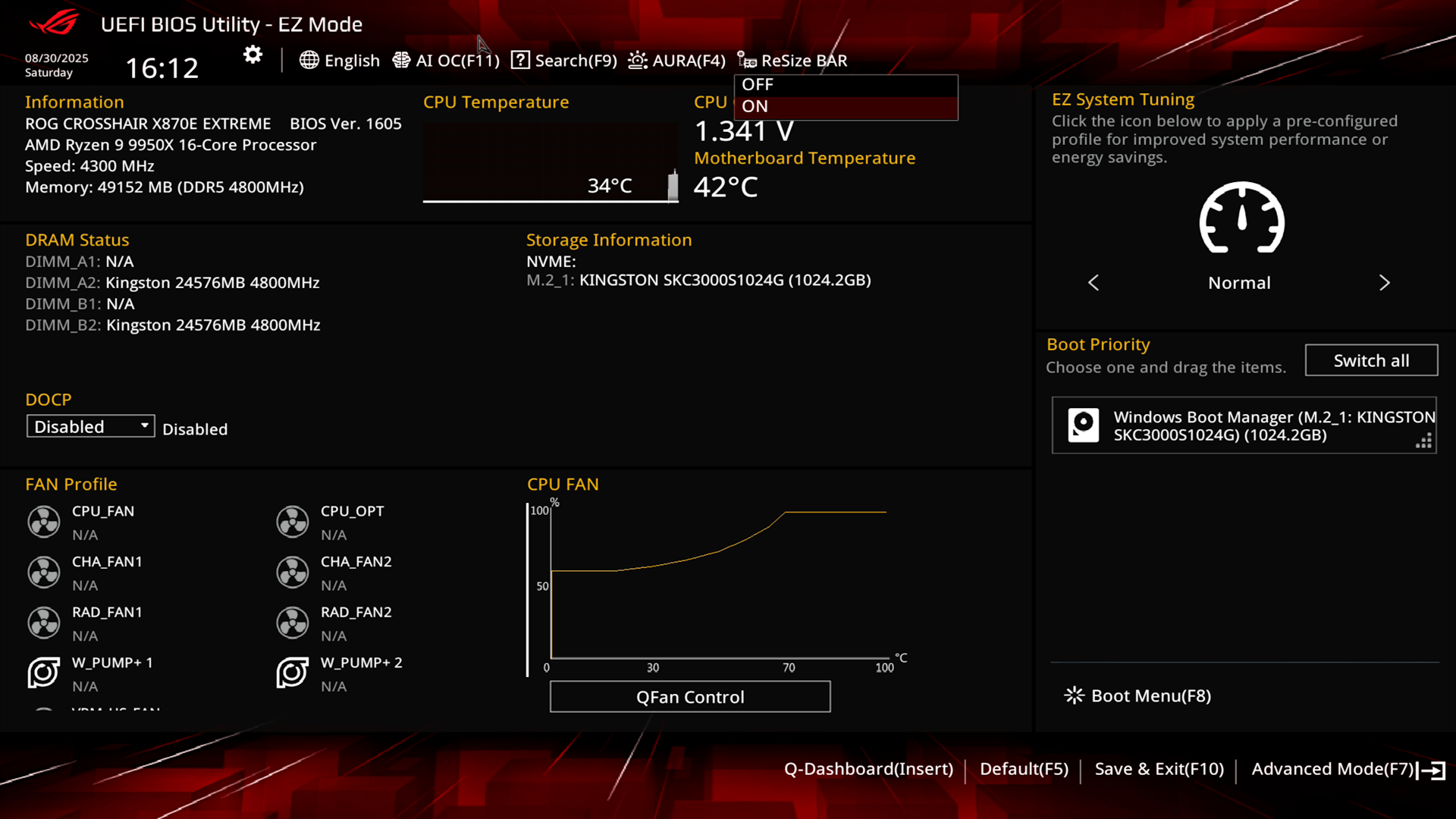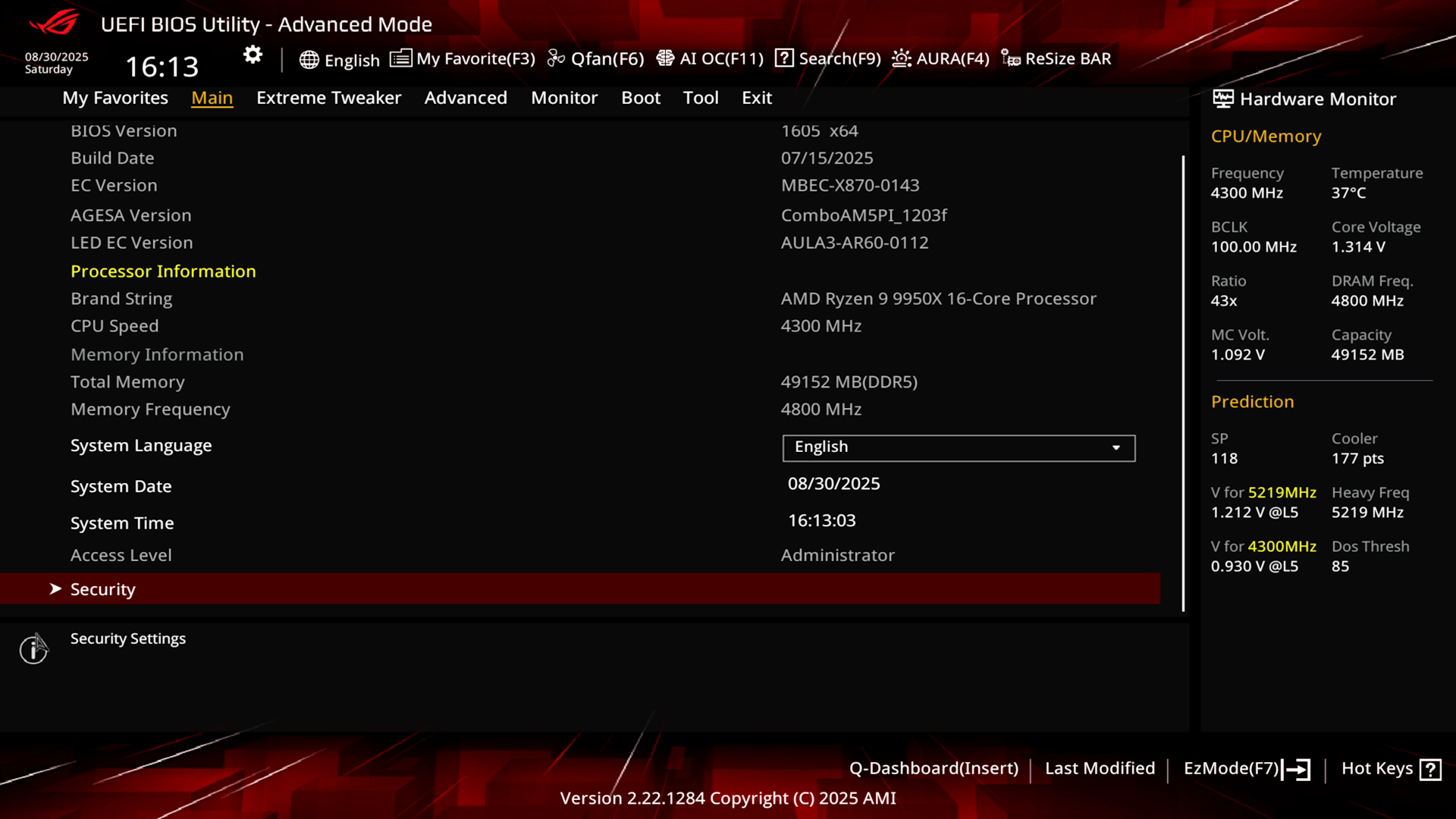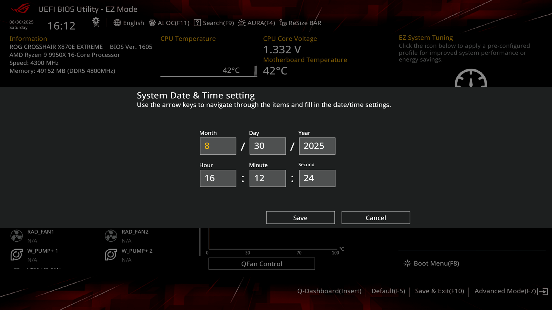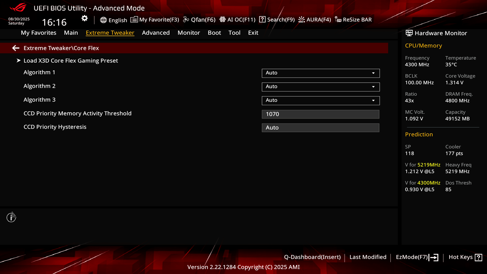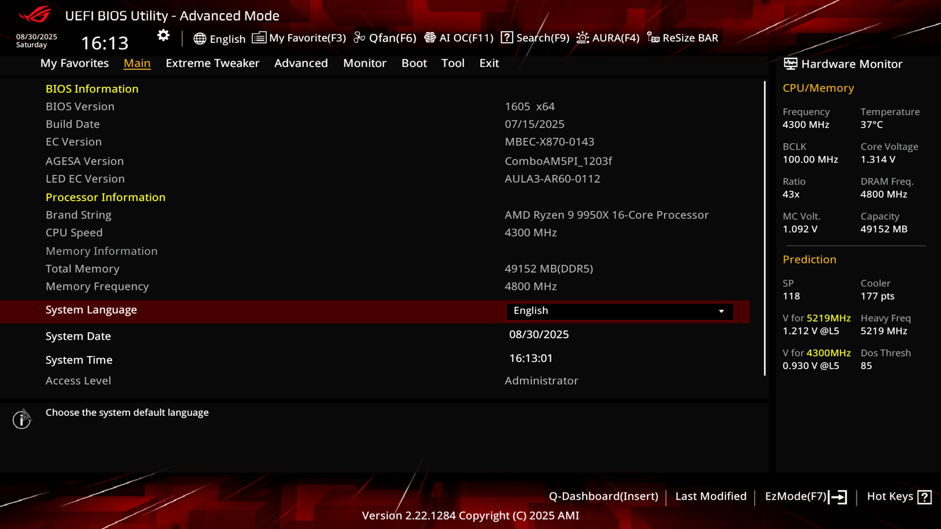 - материнская плата: ASUS ROG Crosshair X870E Extreme (UEFI 1605, AGESA 1.2.0.3f);