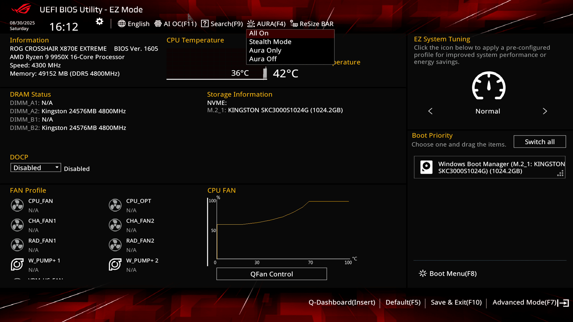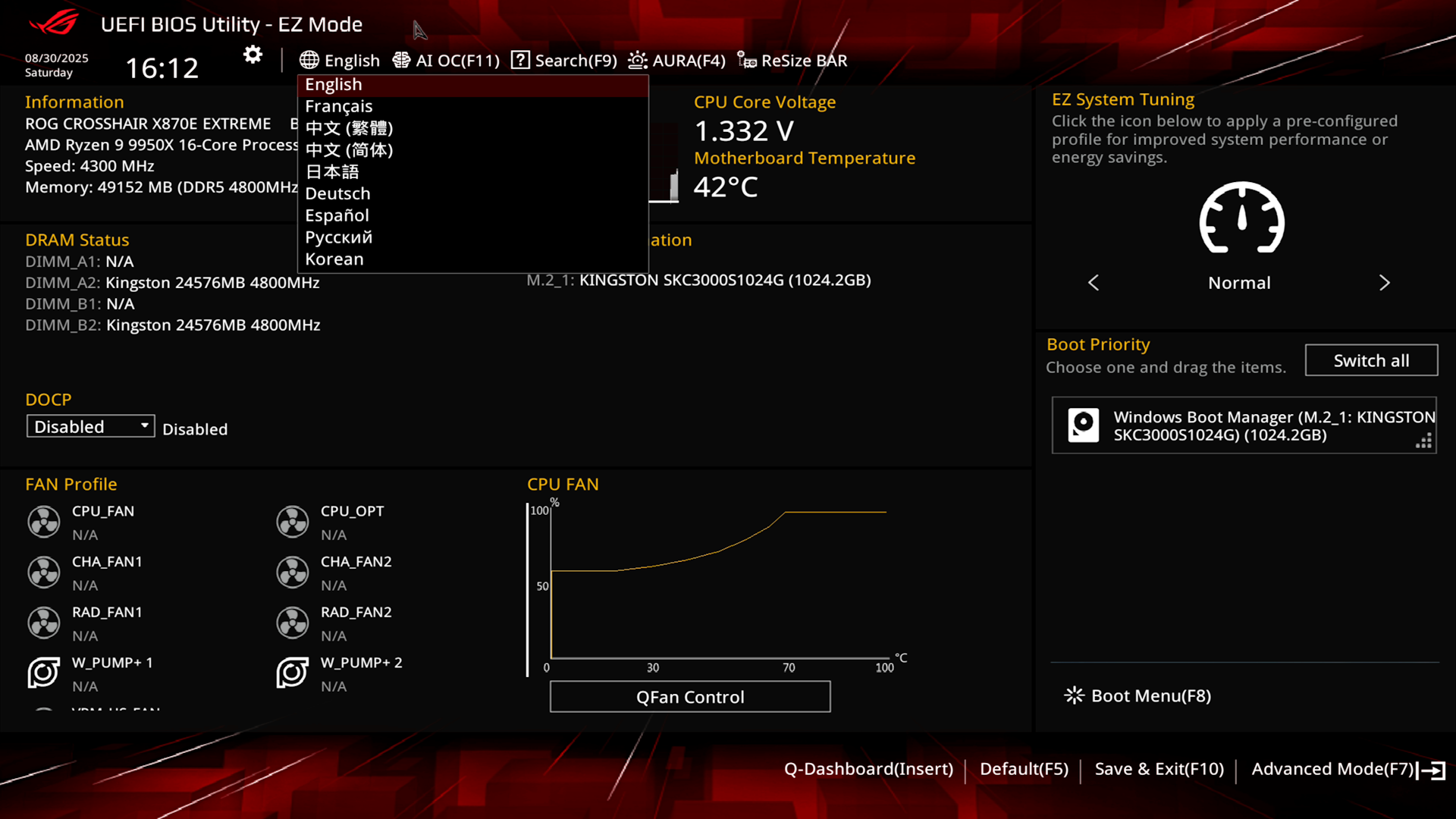 ASUS ROG Crosshair X870E Extreme управляется привычным ASUS UEFI BIOS UTILITY, который стилизован под линейку продуктов Republic of Gamers. Как и с другими материнскими платами производителя пользователю предлагаются два варианта управления: EZ Mode и Advanced Mode.