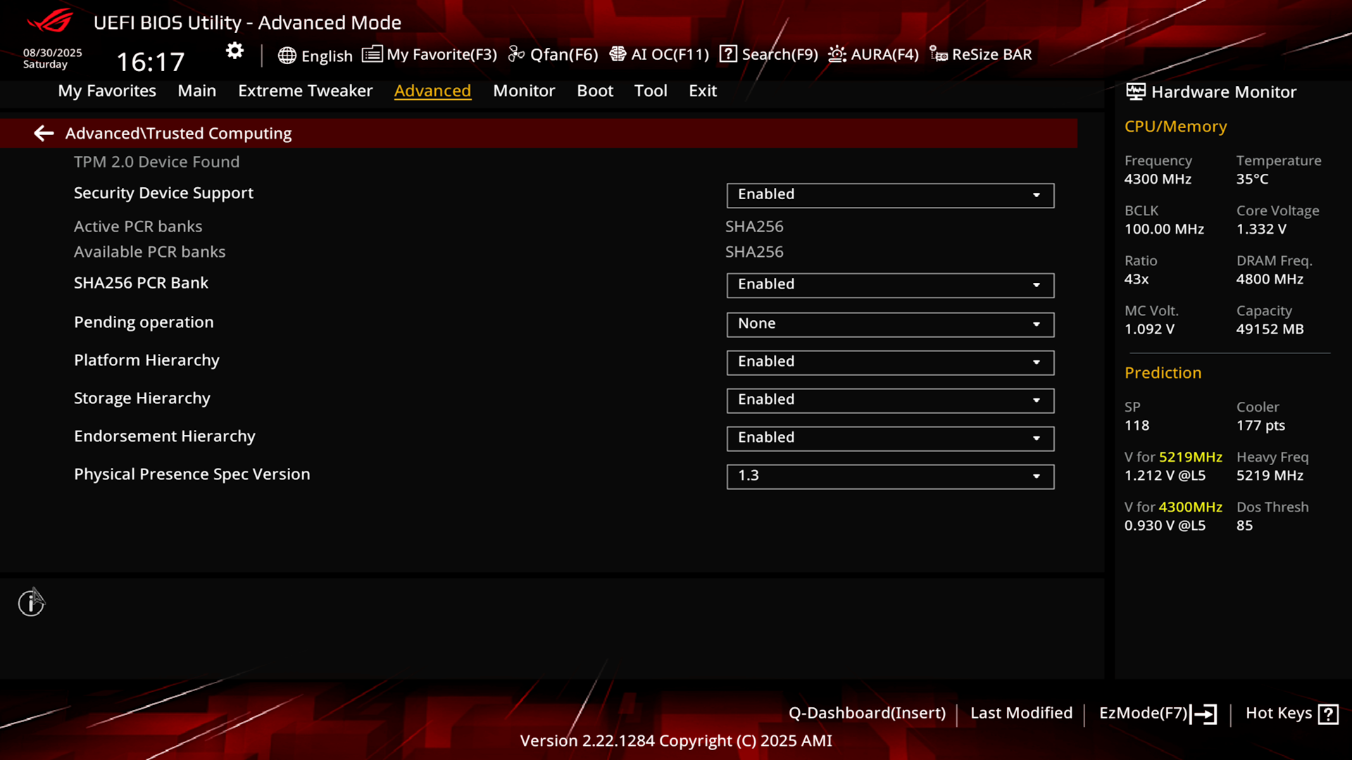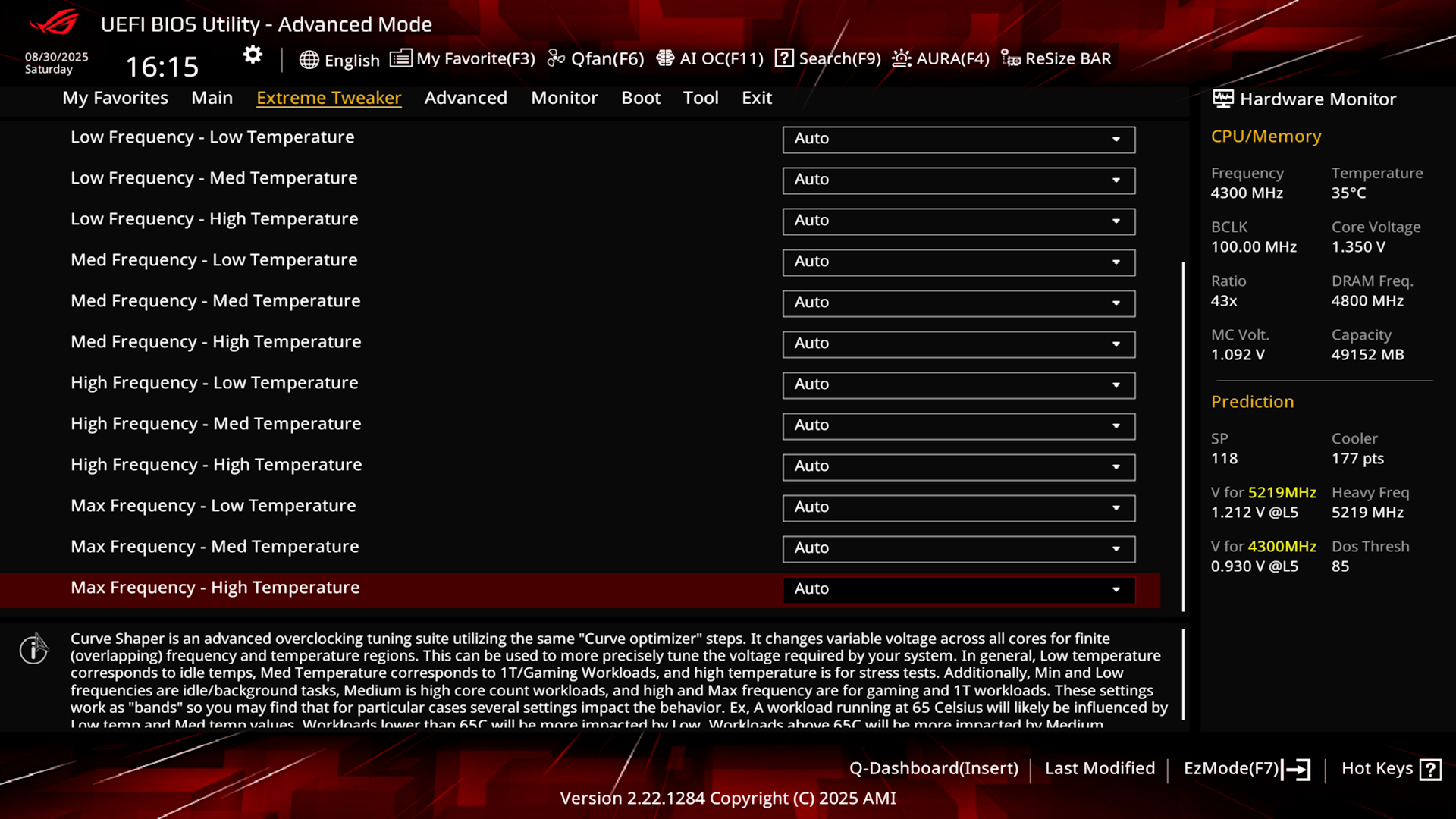 Типовые настройки аналогичны OPTIMIZED_DEFAULTS, исключение — частота памяти, установленная в режиме DDR5-5600 с таймингами JEDEC (максимальная частота без префикса «OC» в спецификациях процессора). Управление оборотами вентилятора по умолчанию — автоматическое. Для приближения к стандартным условиям эксплуатации в операционной системе Memory_integrity и Core_isolation не выключались.