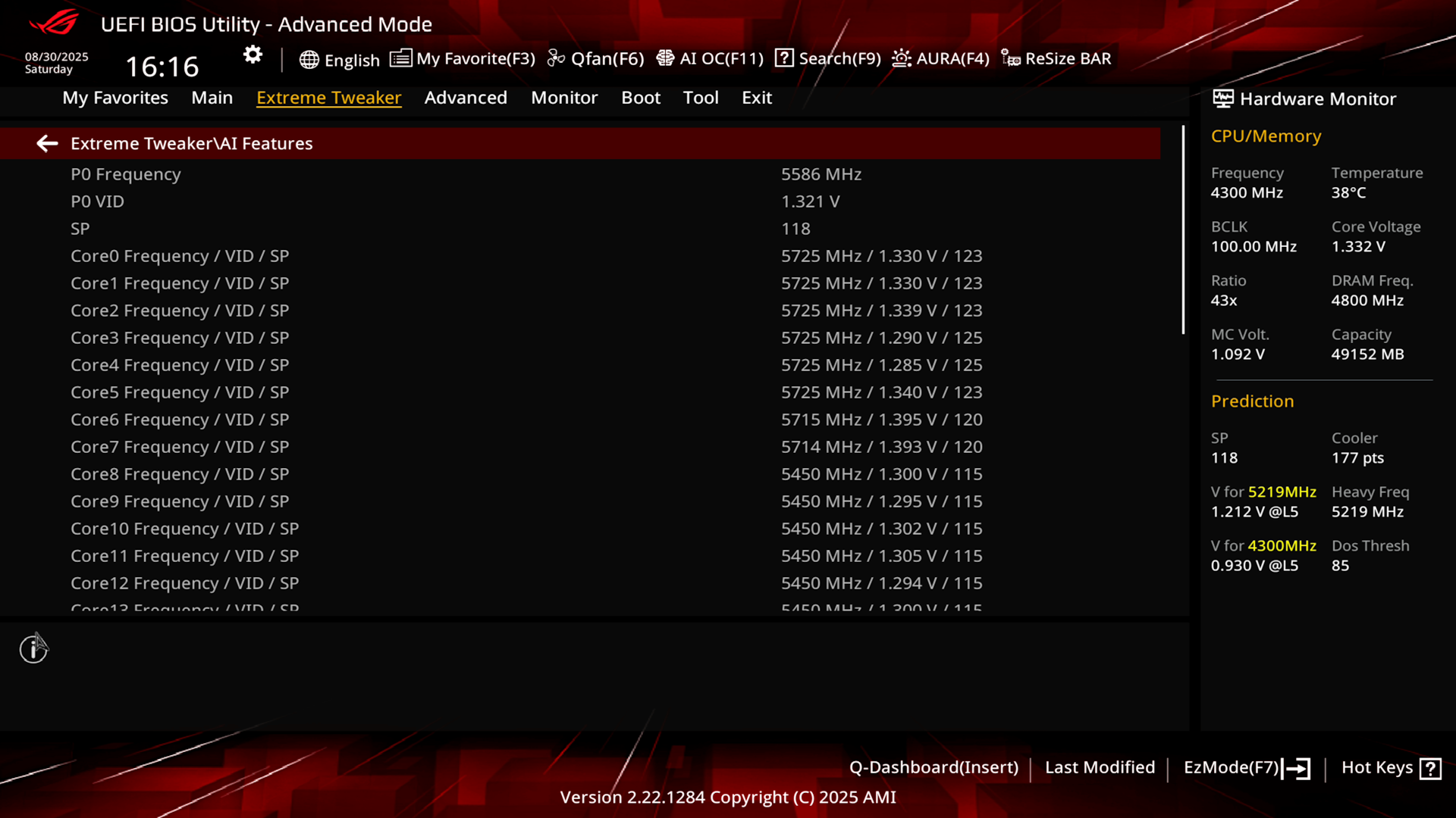В режиме нагрузки с функцией AI Optimized в режиме «Power Efficient» плата удерживала 5220,9 МГц средней частоты всех ядер, а также 5640 МГц максимального ускорения одного ядра.