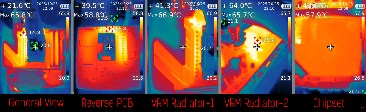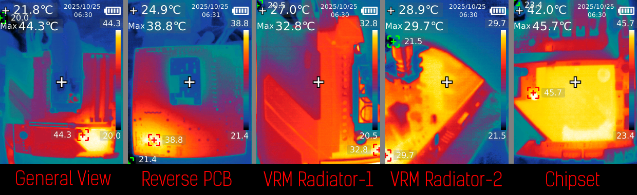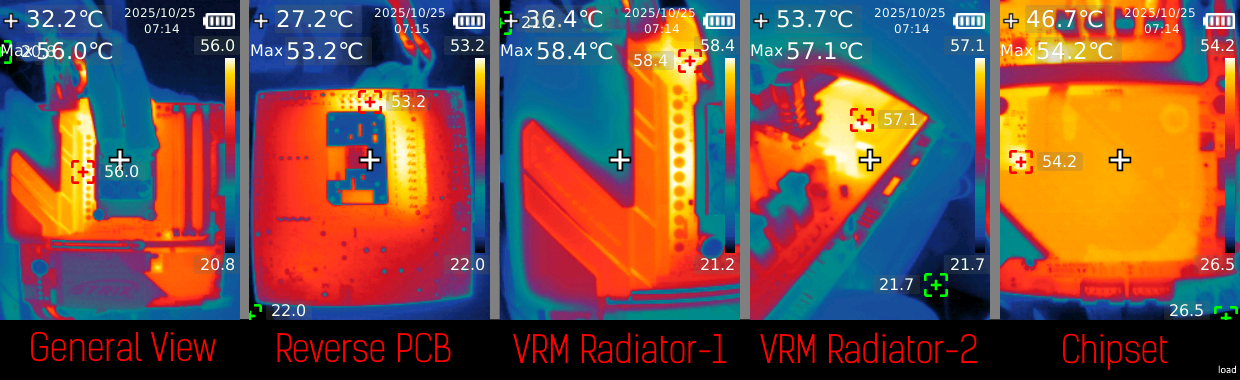 Температура в помещении удерживалась на уровне 20 градусов по Цельсию. Измерение энергопотребления процессора происходило через прямой замер EPS12V, а также энергопотребления материнской платы через прямой замер ATX 24pin с помощью BENCHLAB (опрос датчика каждые 100 мс). Измерение температуры фиксировалось по программным датчикам HWINFO, а также по термофото, которое было выполнено тепловой камерой UNI‑T UTi260B. Тест представлял собой забег 30 минут LinX 0.7.0 AMD (problem size 46290). Во время тестирования температур материнская плата не имела никакого внешнего обдува, использовалась интегрированная видеокарта, а дискретная временно снималась. Каждый бенчмарк запускался пять раз, в результатах указано среднее арифметическое. Игры тестировались на заводских пресетах минимального качества в стандартных бенчмарках. Counter-Strike 2 тестировался на карте мастерской CS2 FPS BENCHMARK DUST2. DOOM: The Dark Ages тестировался в интегрированном бенчмарке на уровне «Spire of Nerathul».