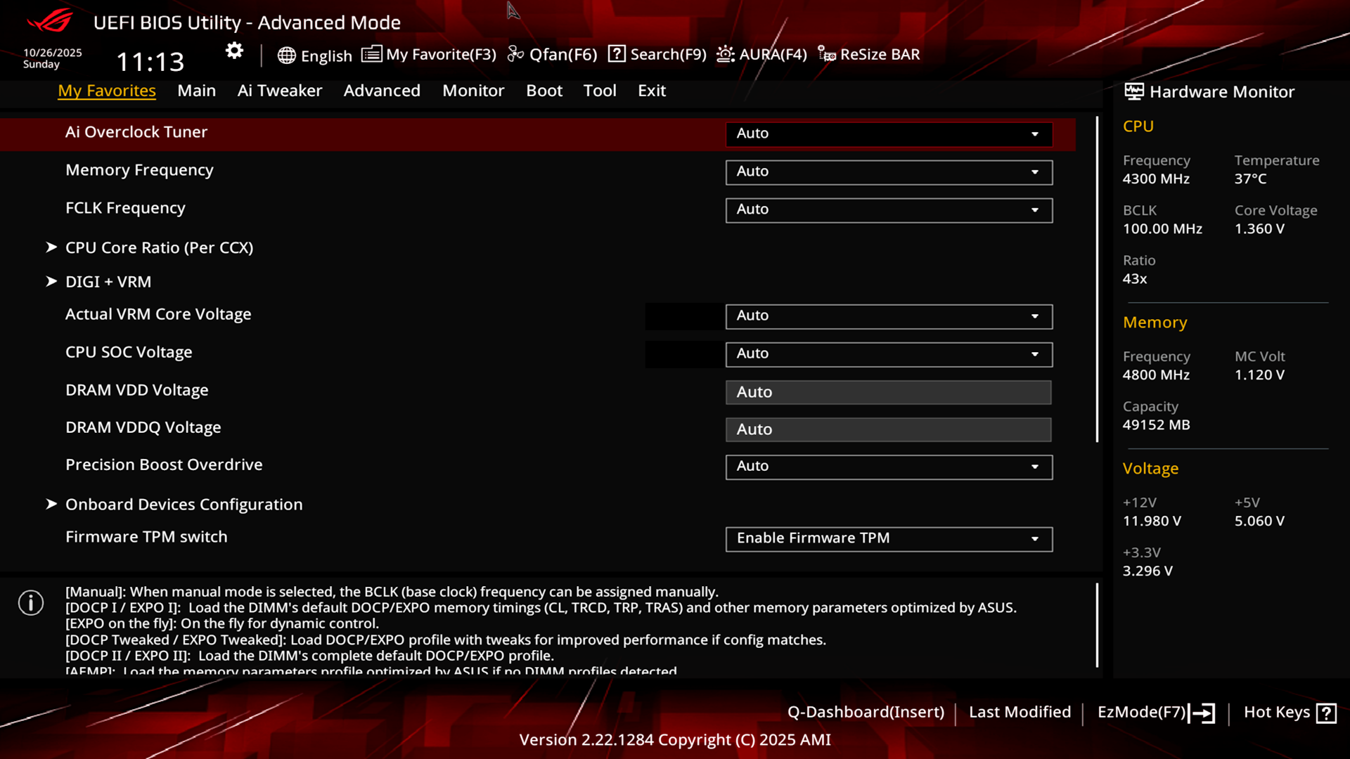 Режим управления EZ Mode реализован в рамках одной страницы. В нем пользователь может получить стандартный отчет по ключевым элементам системы, установить системное время, выбрать язык интерфейса, найти нужную опцию поиском, настроить AURA (система RGB), ResizeBAR, кривую оборотов вентиляторов, привести в действие профили AMD EXPO, в случае их наличия, или AEMP (ASUS Enhanced Memory Profile) для своего комплекта ОЗУ, настроить RAID (доступная функциональность зависит от процессора), указать приоритет загрузки с сети или накопителей, а также вызвать интерфейс Q‑Dashboard. Автоматический оверклокинг у этой модели отсутствует, зато предлагается форсирование режима PBO Enchancement (Precision Boost Overdrive), а это не является эксклюзивной функцией, она доступна везде через меню AMD Overclocking.