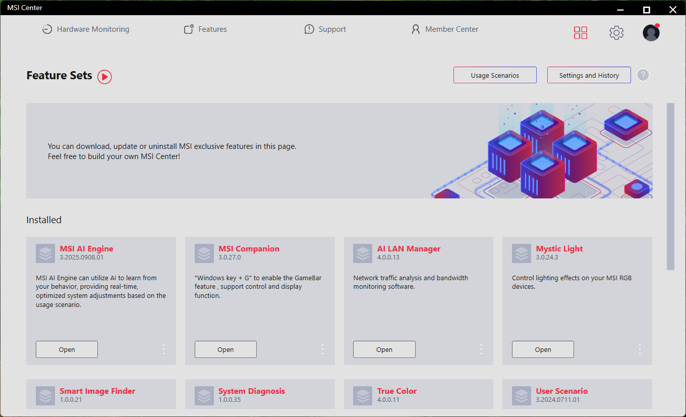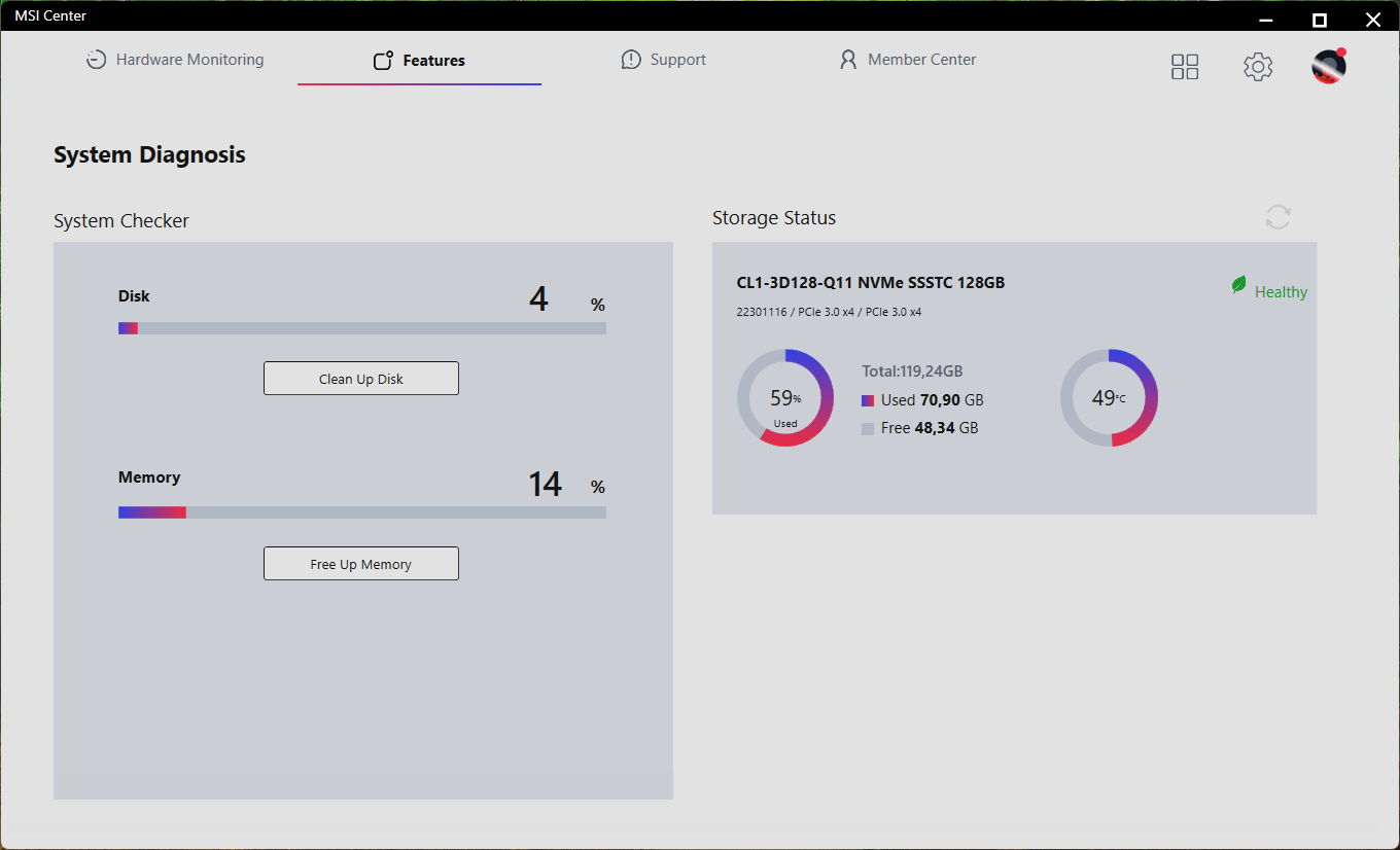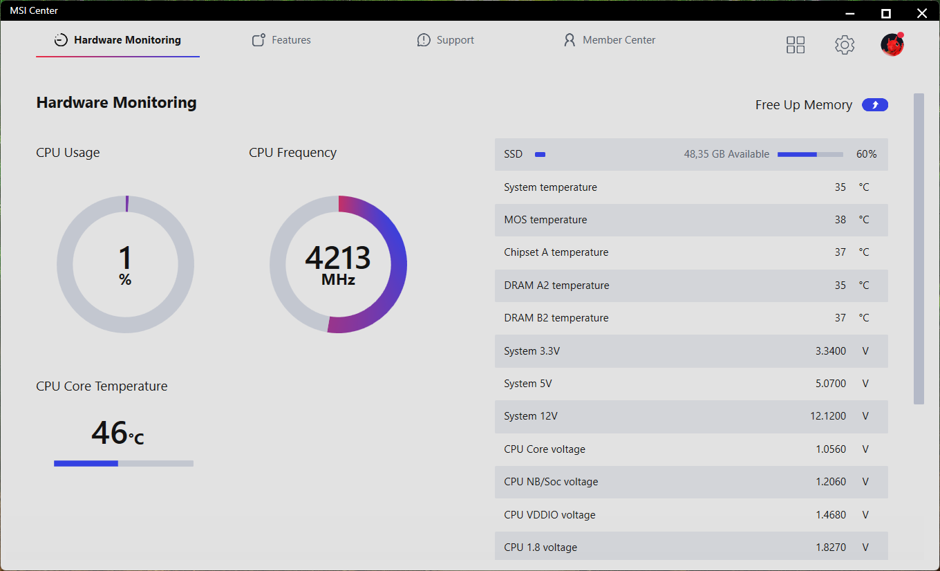 Главное ядро фирменного ПО производителя — MSI Center. Это модульное приложение, которое пользователь самостоятельно настраивает под свои задачи. Оно может быть простым средством мониторинга системы и материнской платы, но при необходимости — превратится в функциональный программный комплекс с богатыми возможностями.