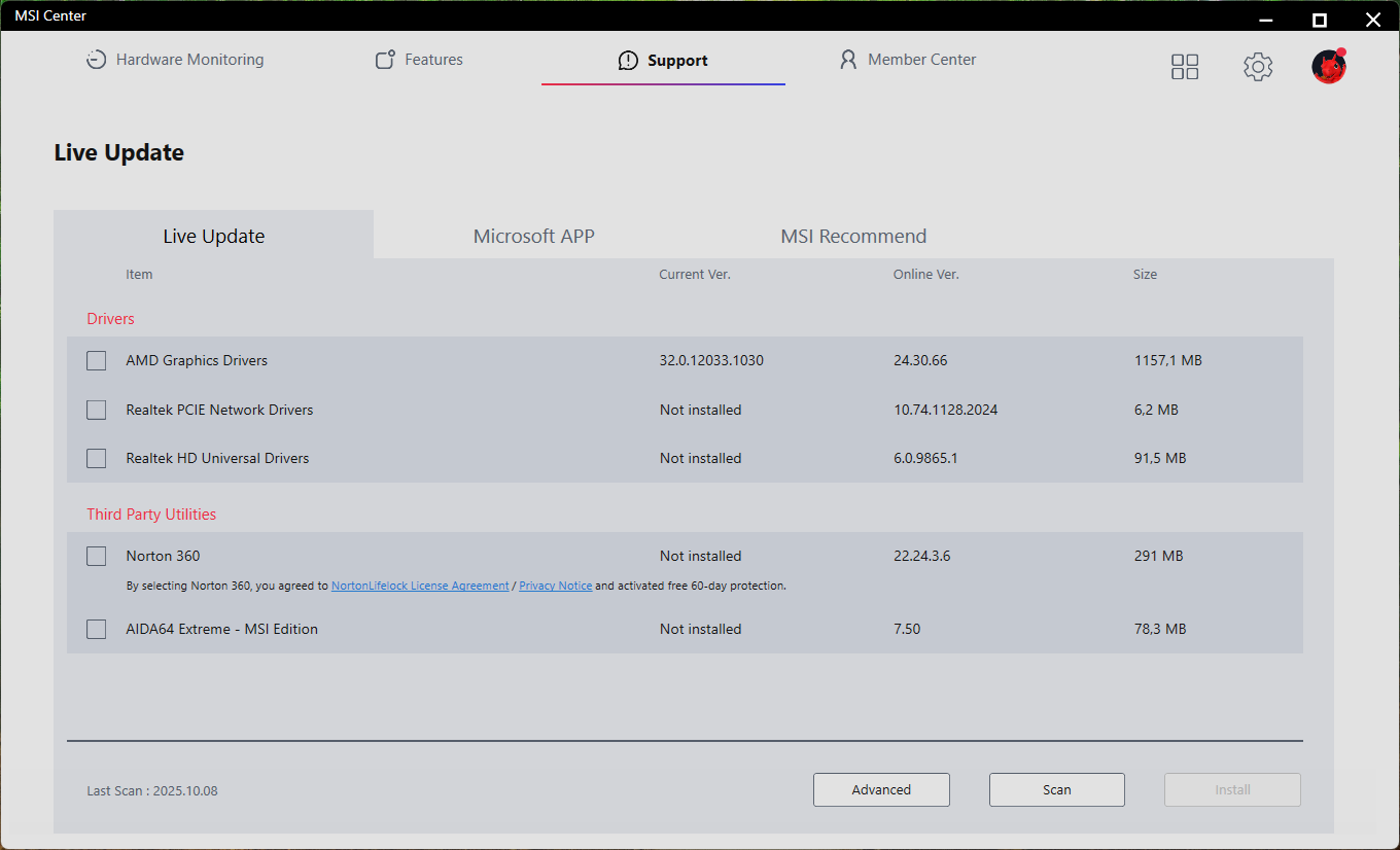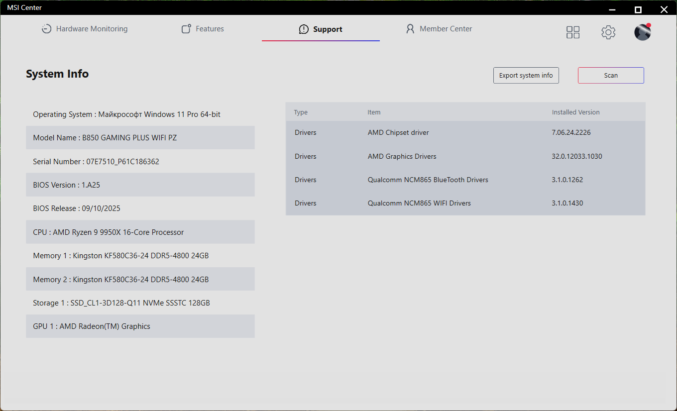 | Фирменное | MSI Center (MSI AI Engine, Game Highlights, MSI Companion, AI LAN Manager, Mystic Light, Smart Image Finder, System Diagnosis, True Color, User Scenario, Cooling Wizard, Live Update) |