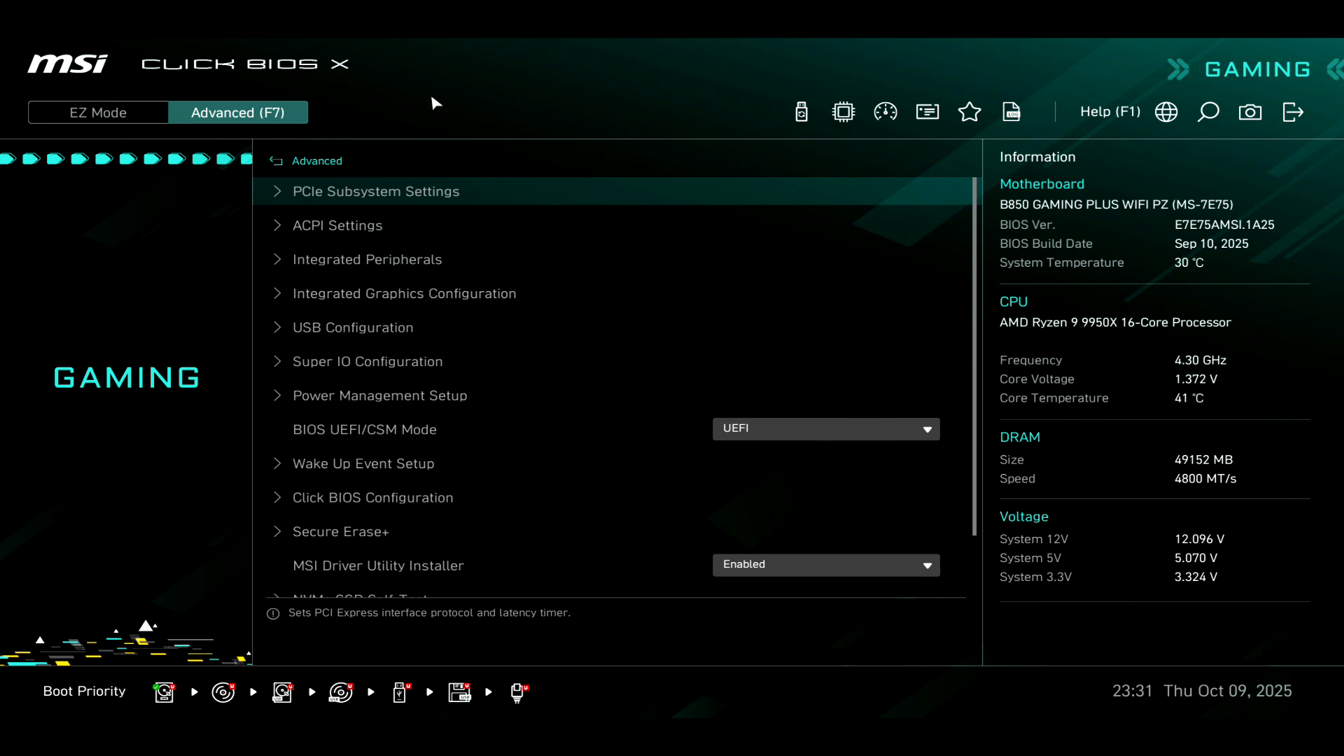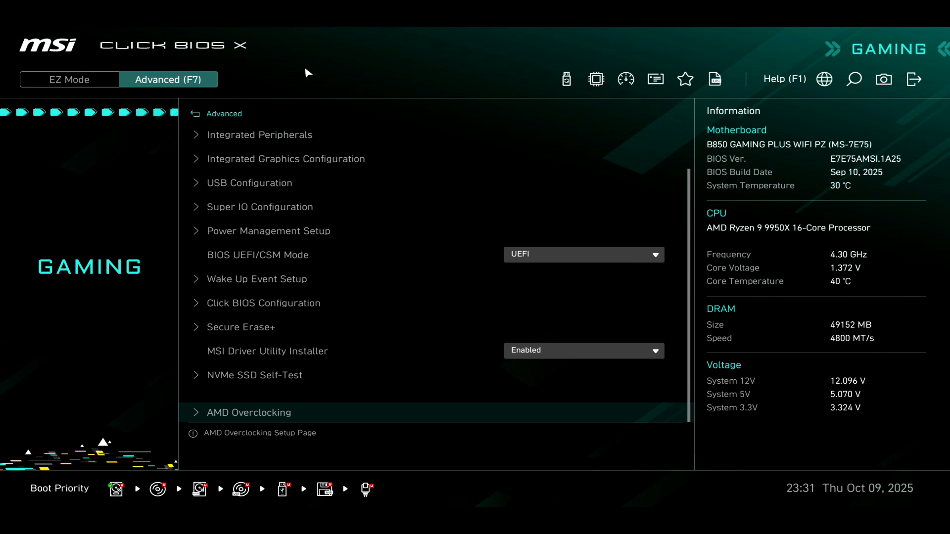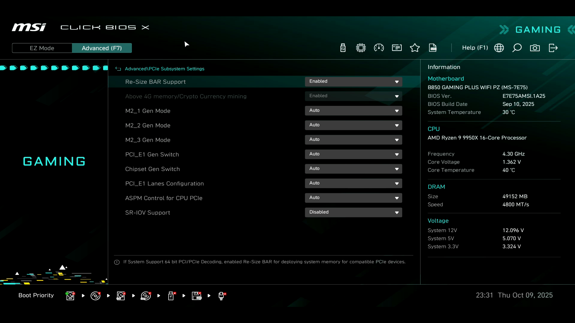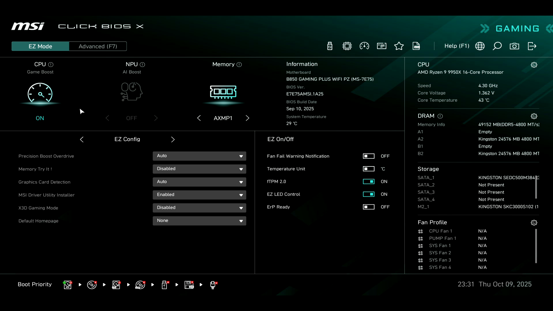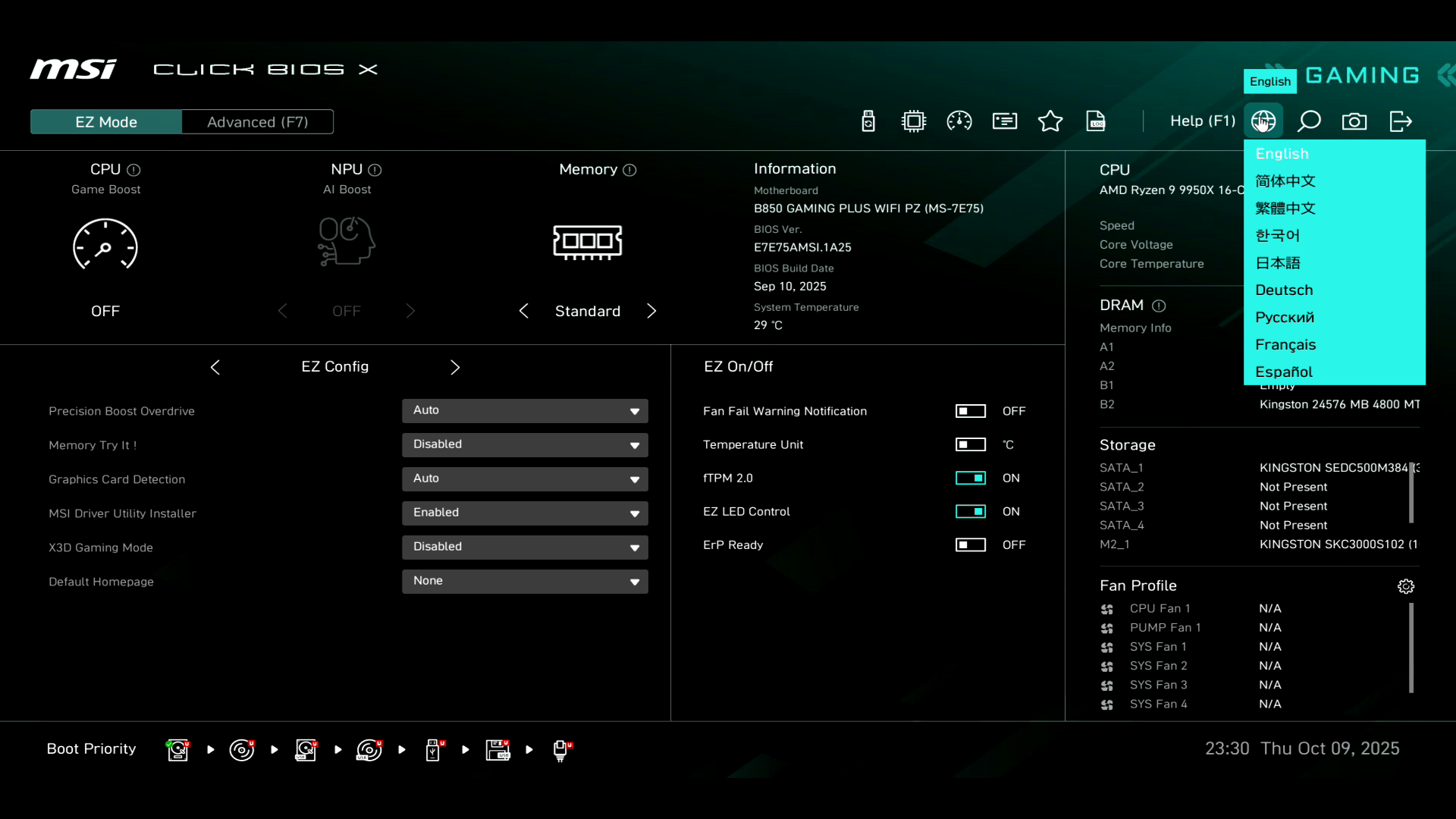MSI B850 Gaming Plus WiFi Project Zero управляется MSI Click BIOS X. Настройка происходит в режимах EZ Mode и Advanced Mode.