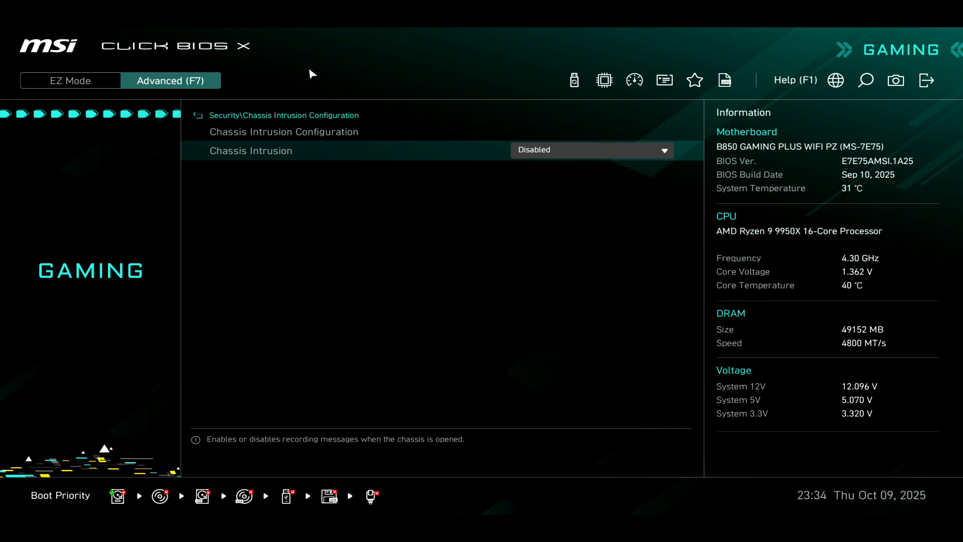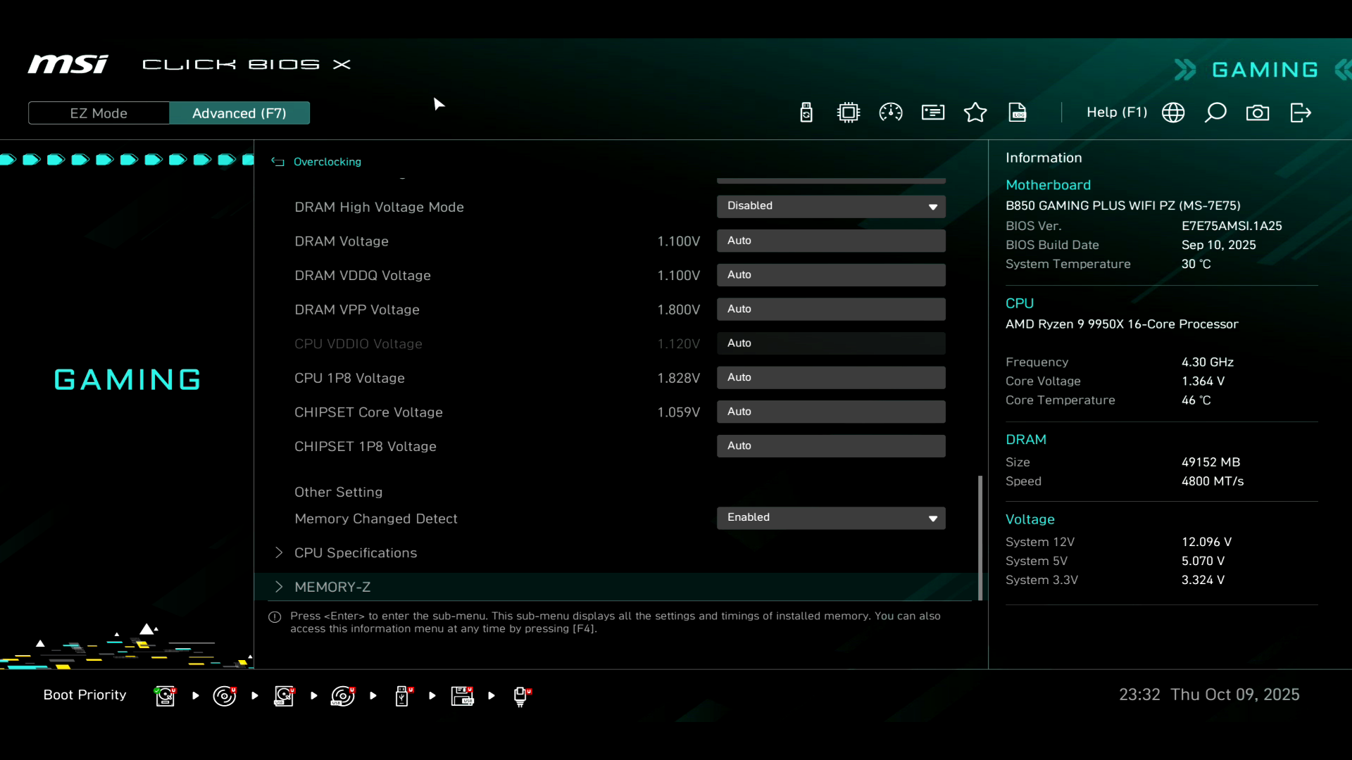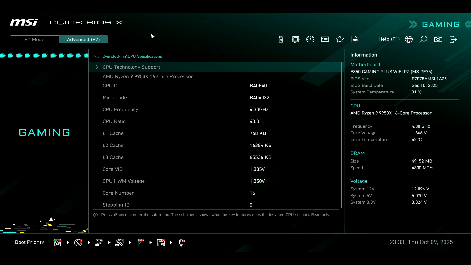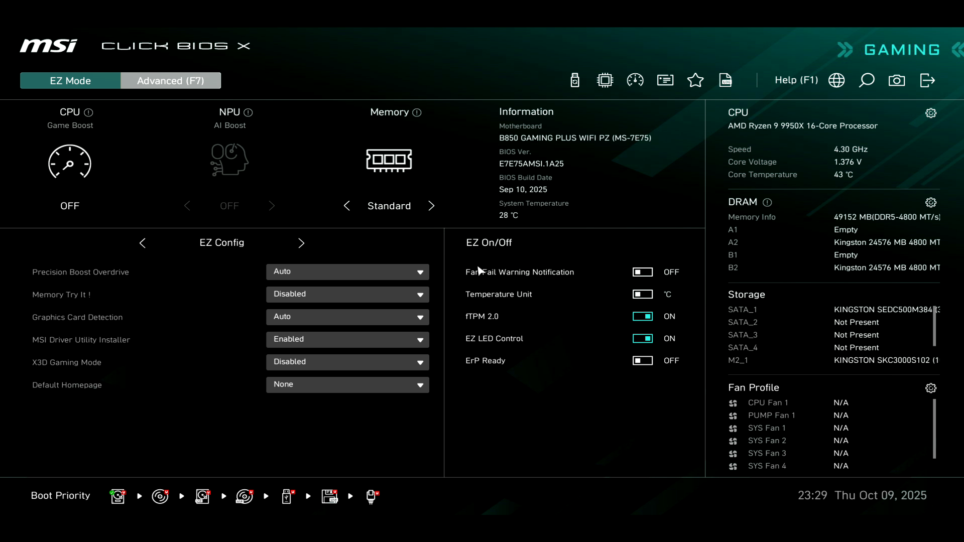 MSI B850 Gaming Plus WiFi Project Zero управляется MSI Click BIOS X. Настройка происходит в режимах EZ Mode и Advanced Mode.