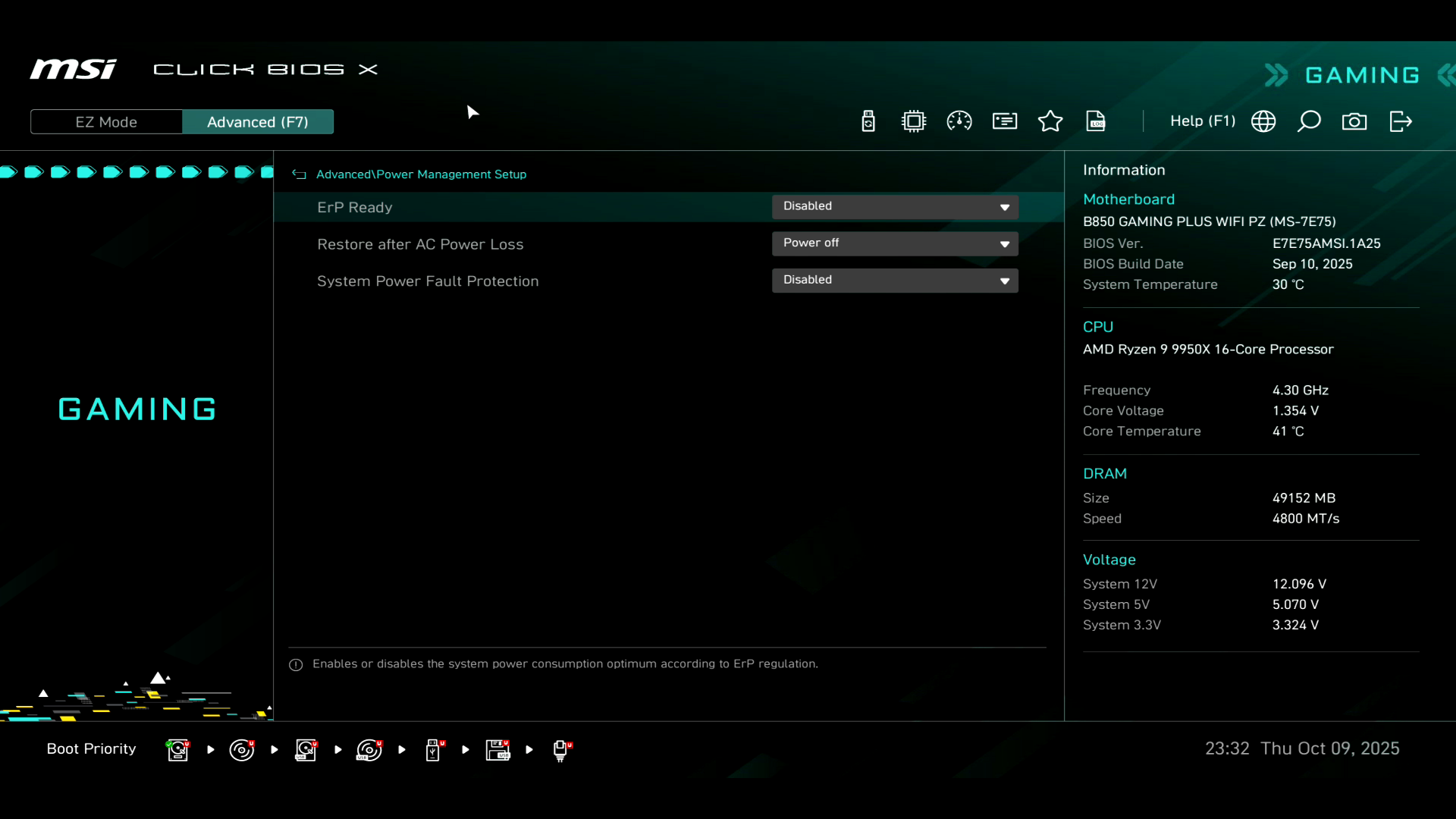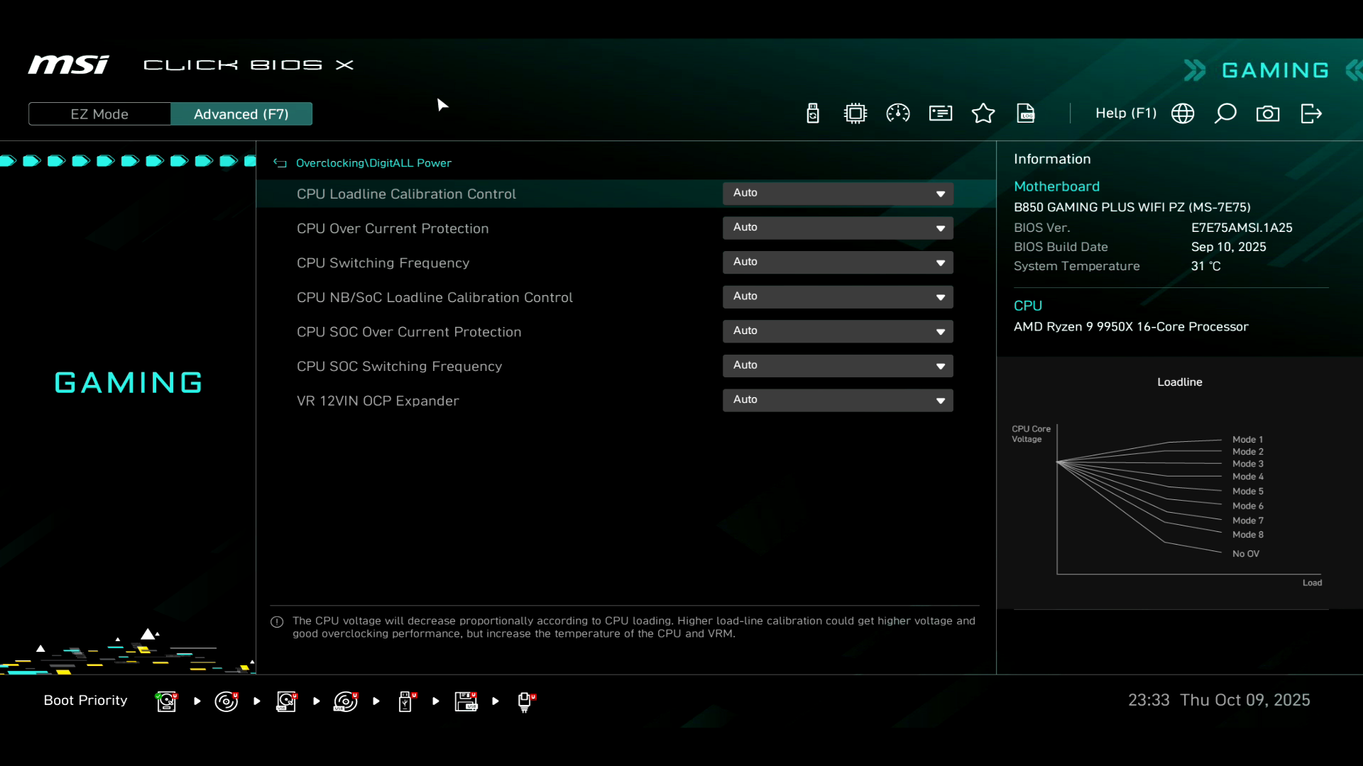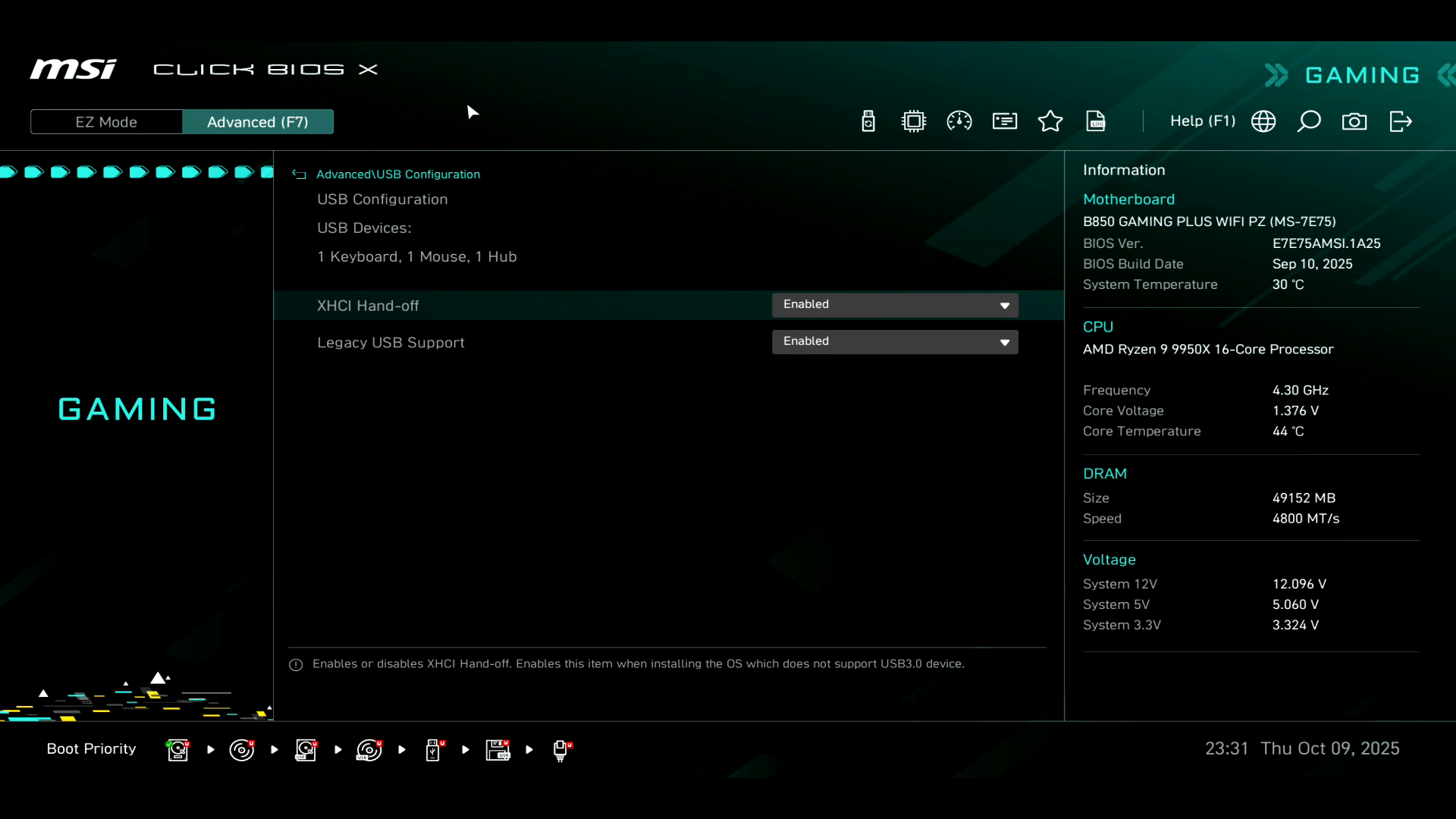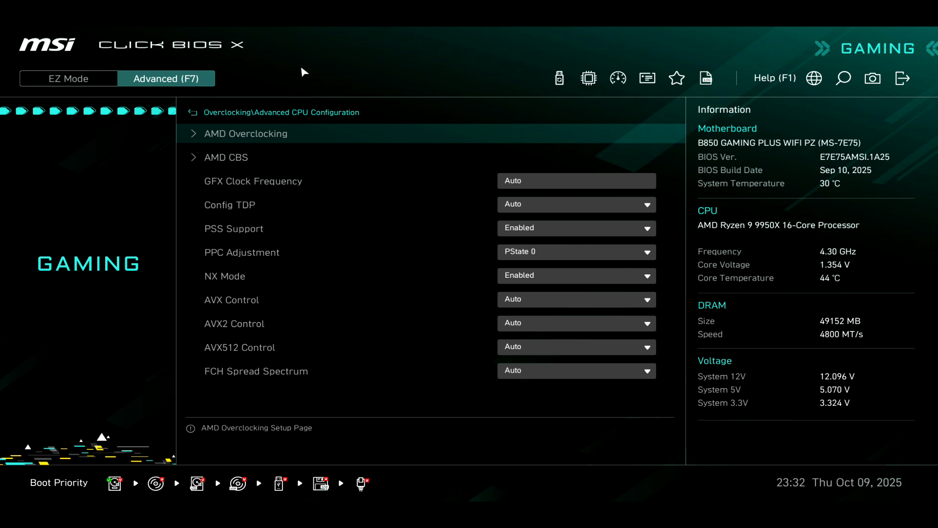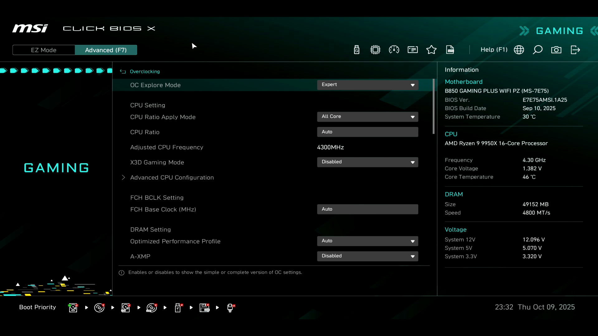 MSI B850 Gaming Plus WiFi Project Zero управляется MSI Click BIOS X. Настройка происходит в режимах EZ Mode и Advanced Mode.