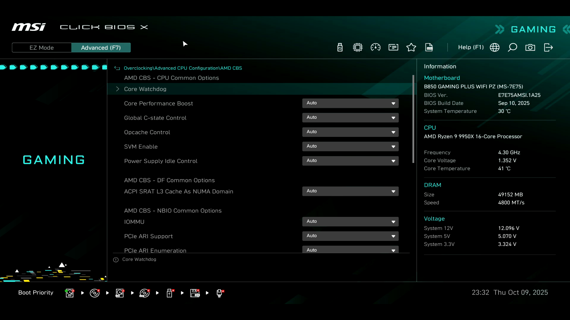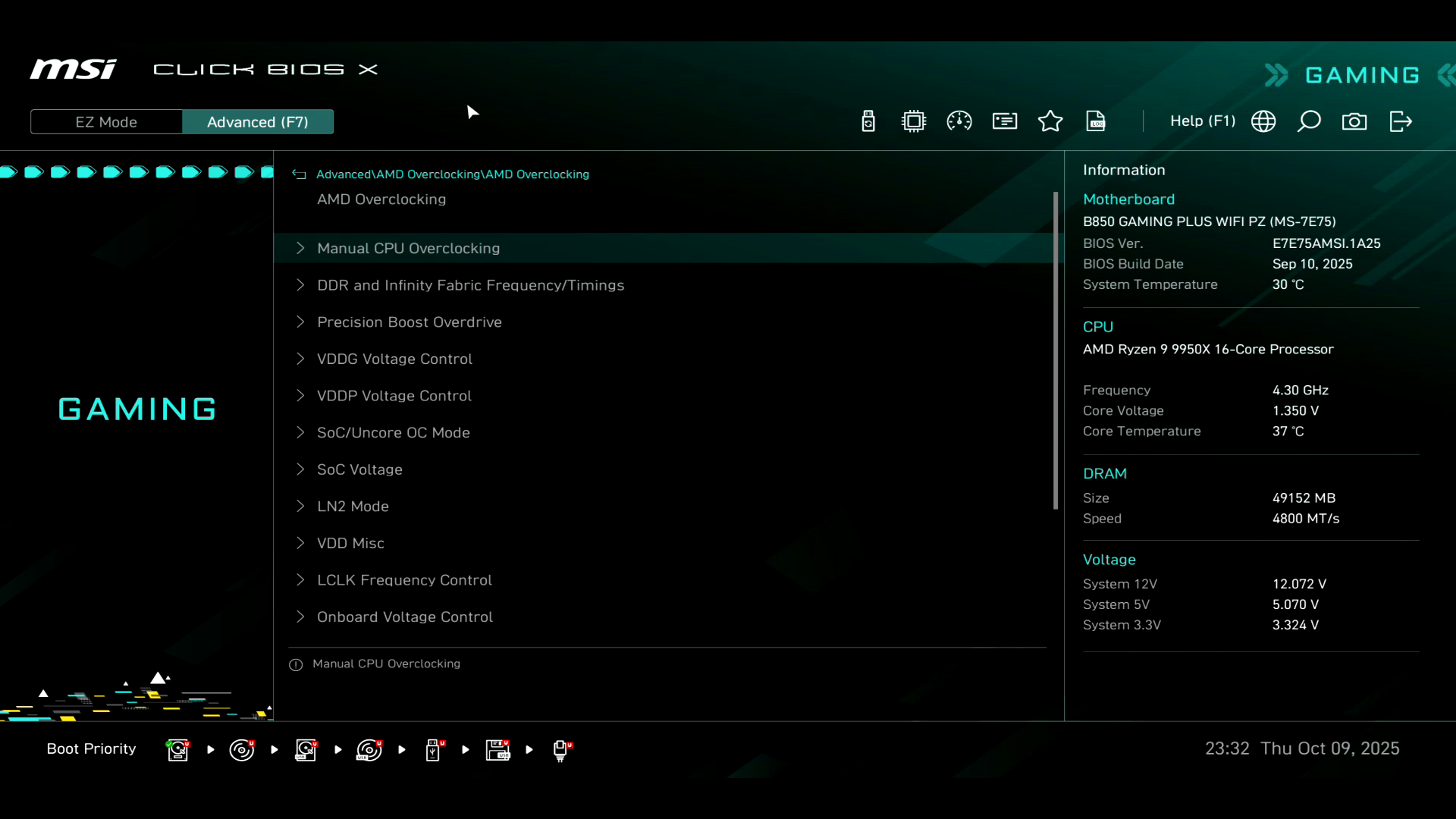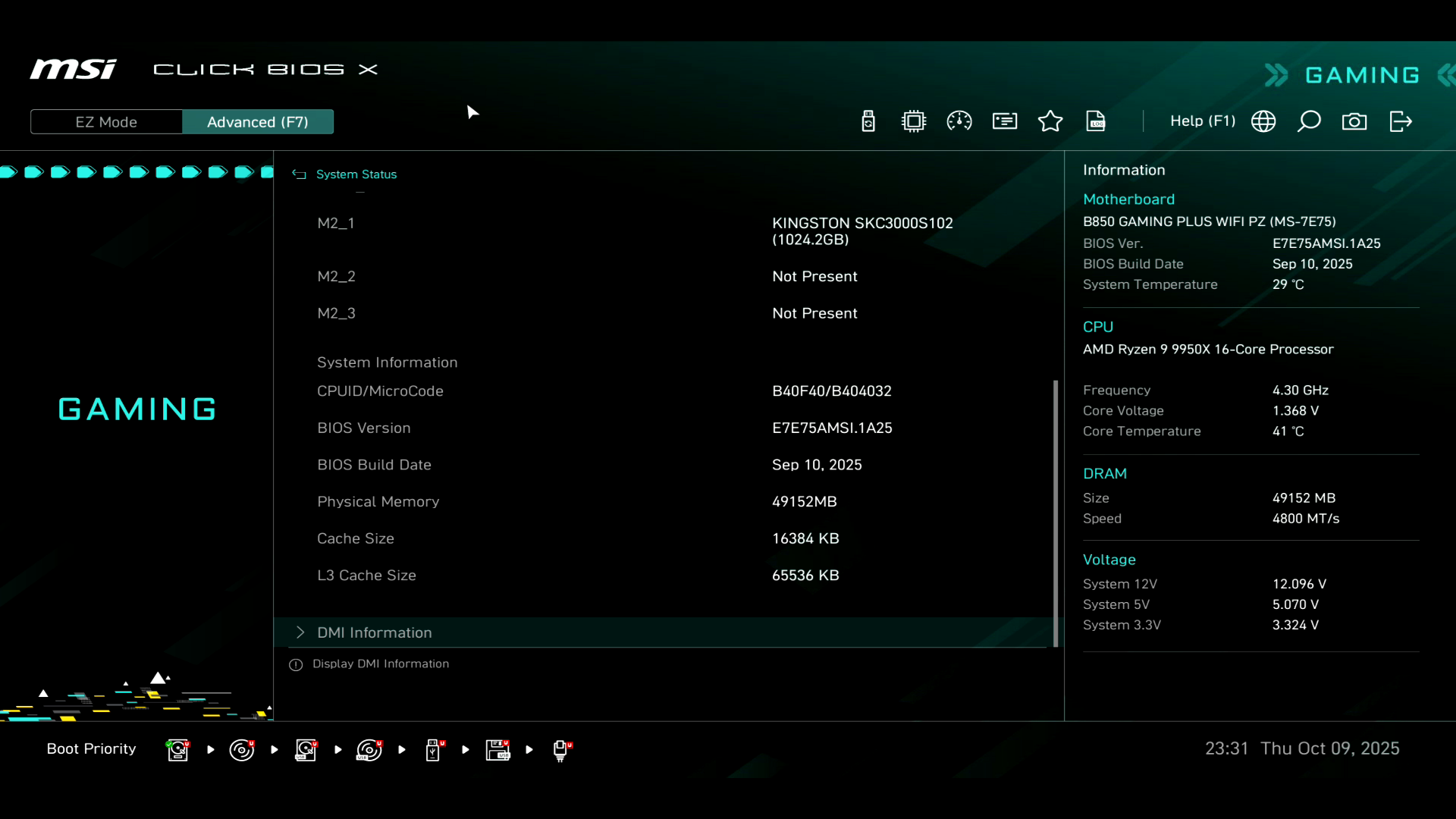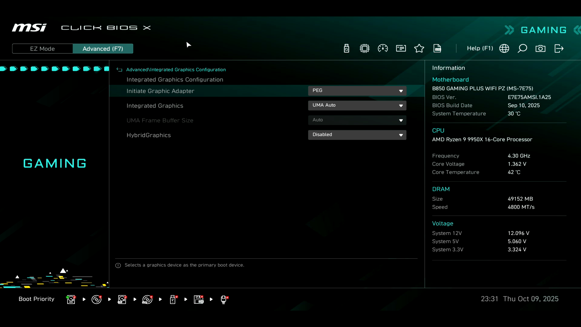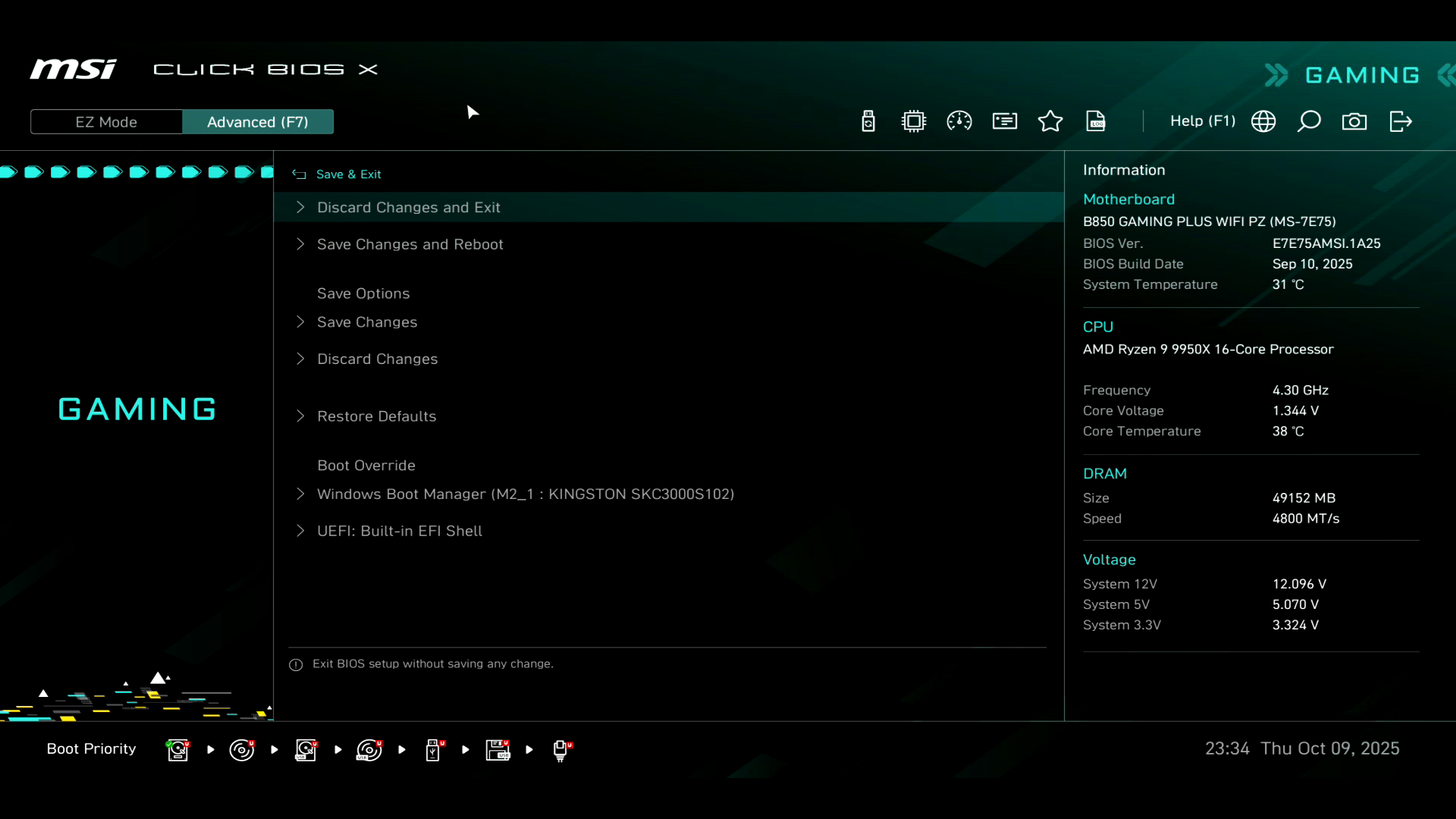 MSI B850 Gaming Plus WiFi Project Zero управляется MSI Click BIOS X. Настройка происходит в режимах EZ Mode и Advanced Mode.