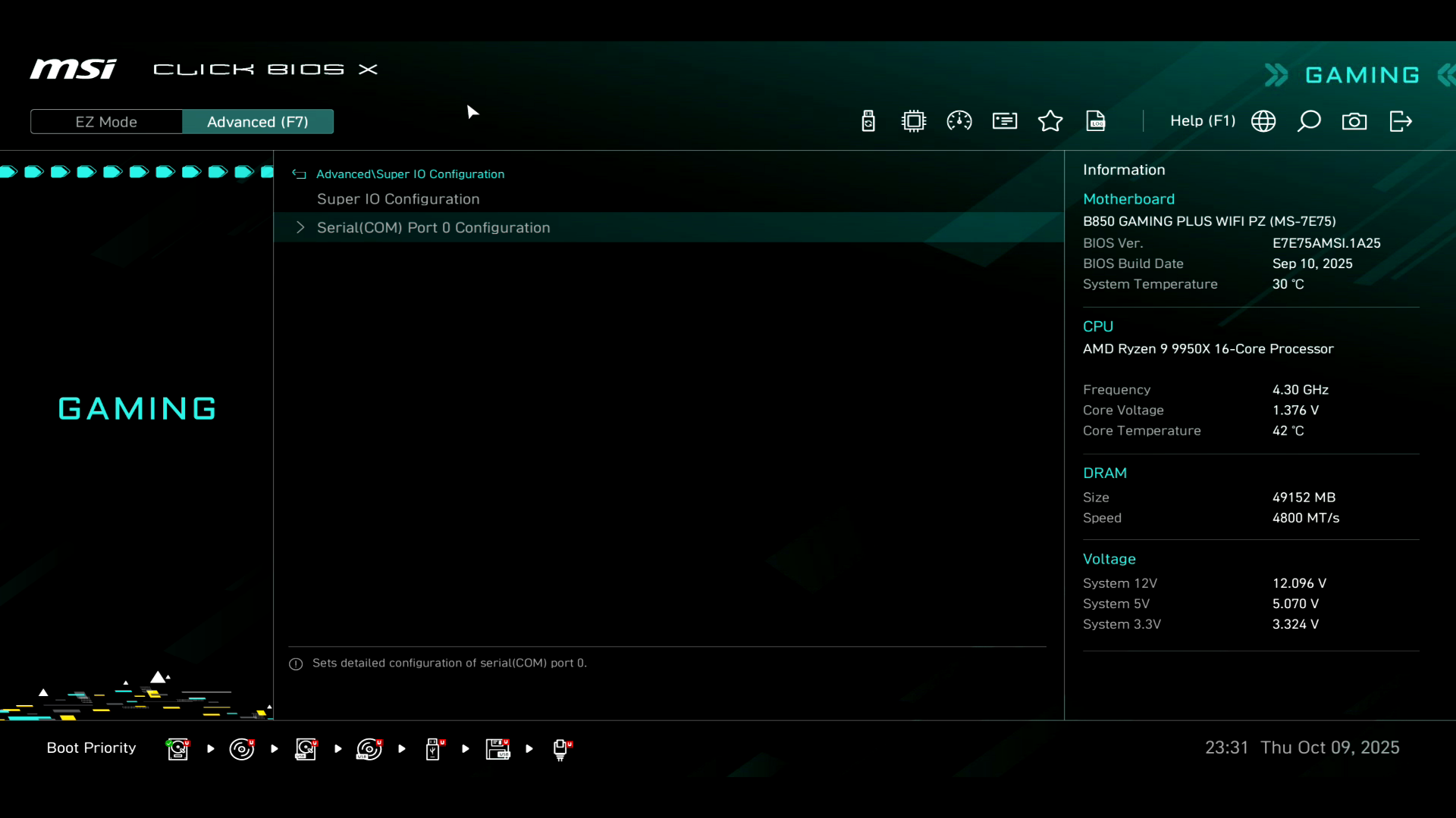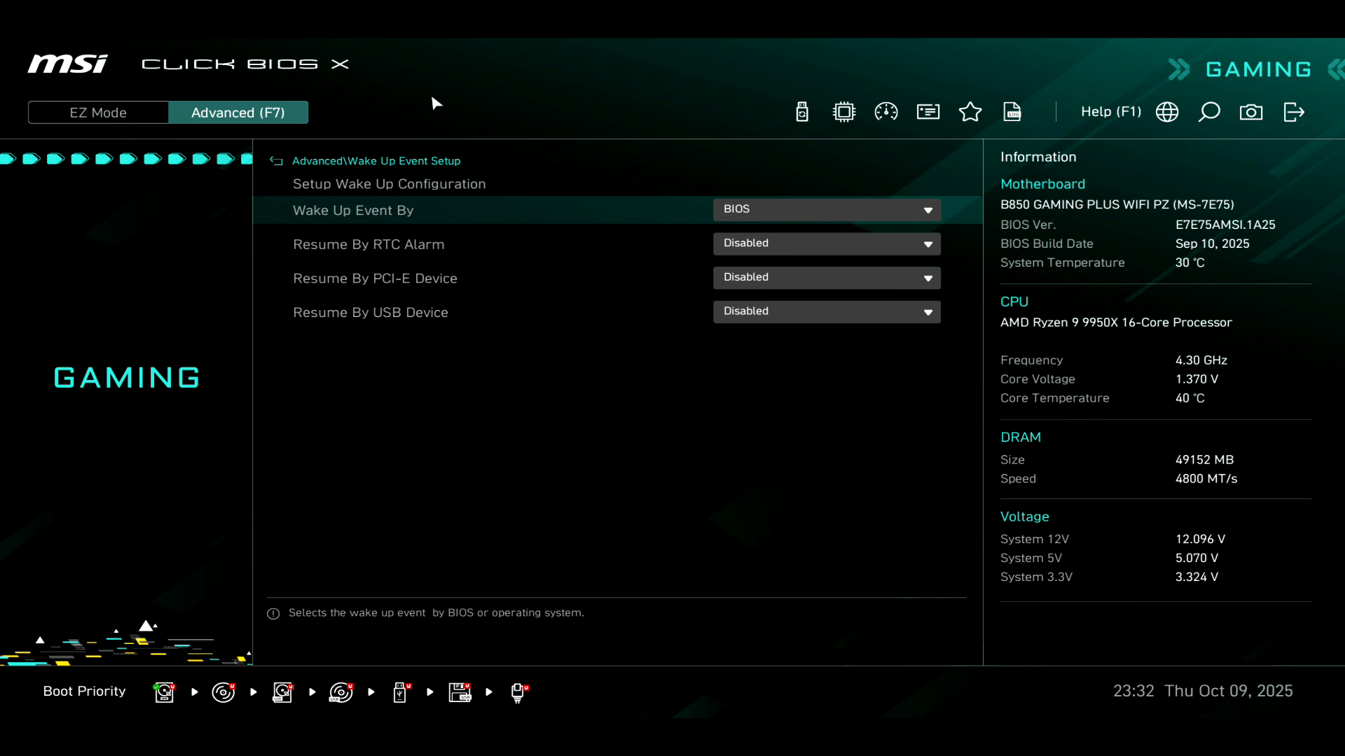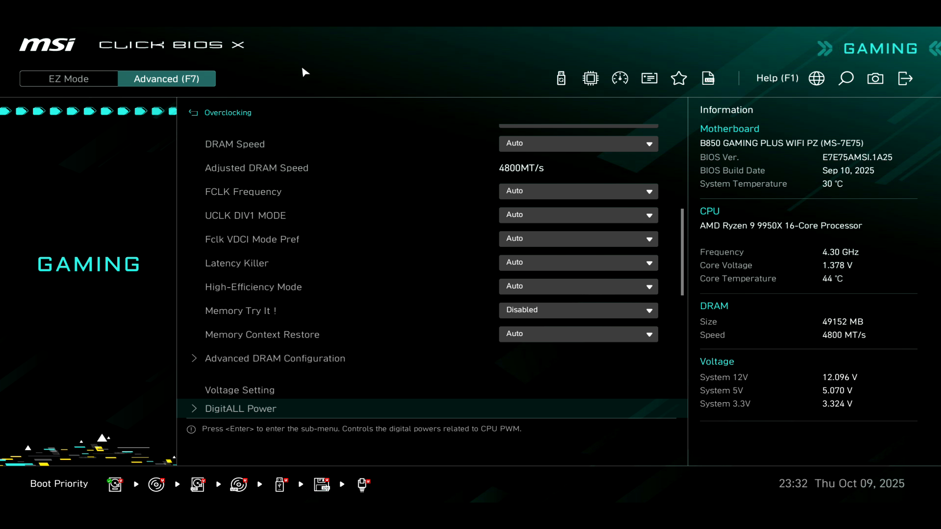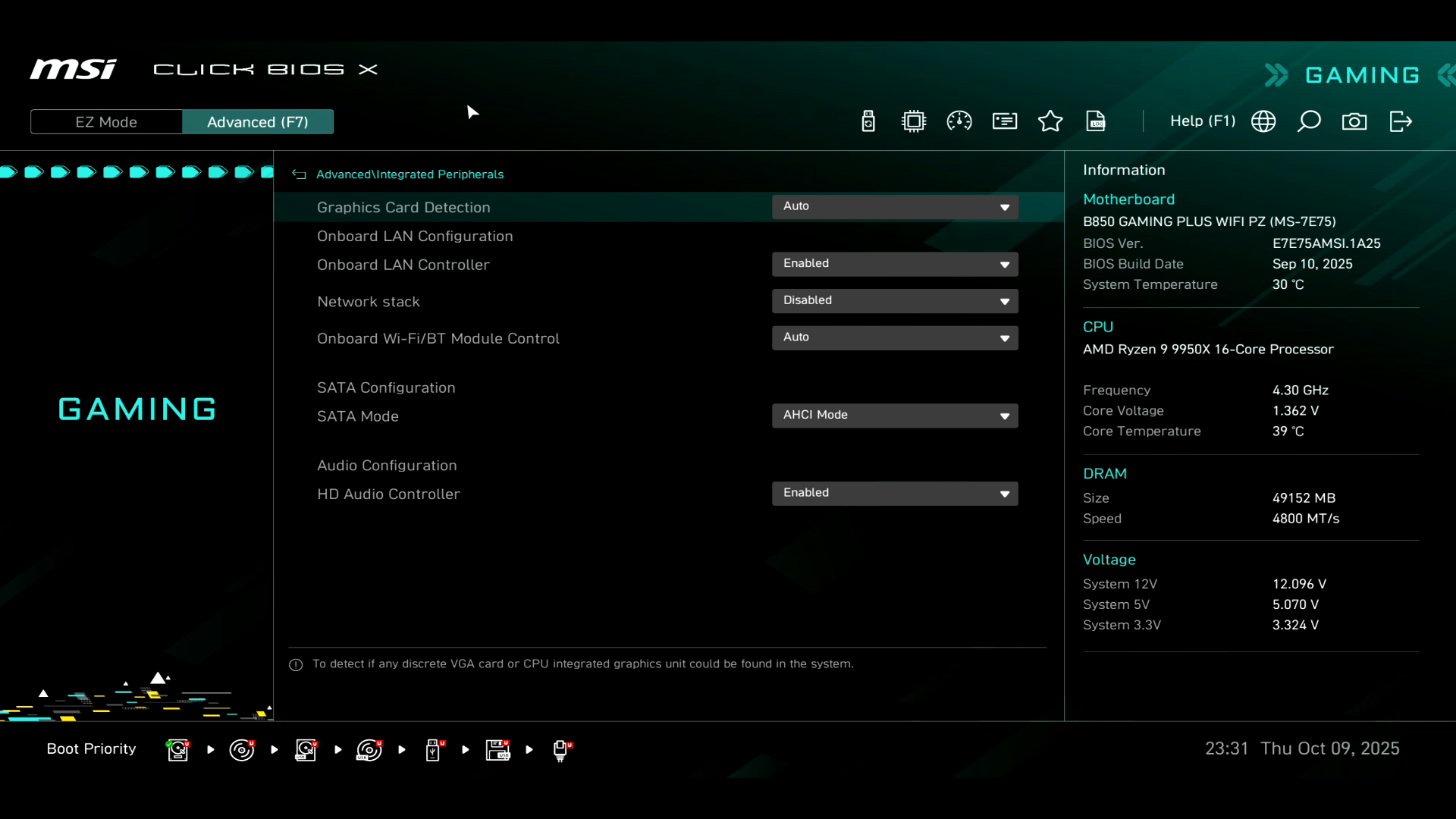 MSI B850 Gaming Plus WiFi Project Zero управляется MSI Click BIOS X. Настройка происходит в режимах EZ Mode и Advanced Mode.