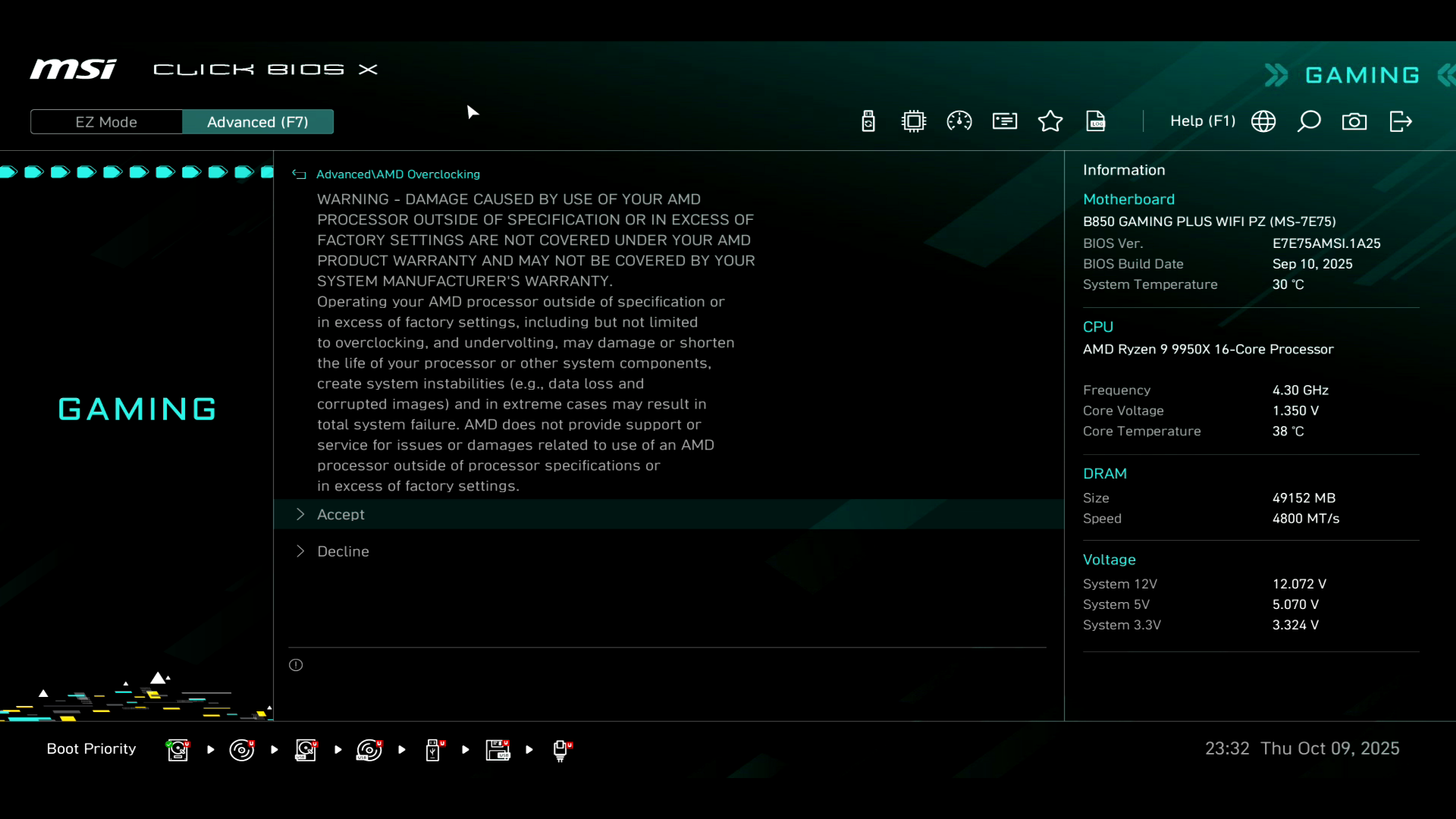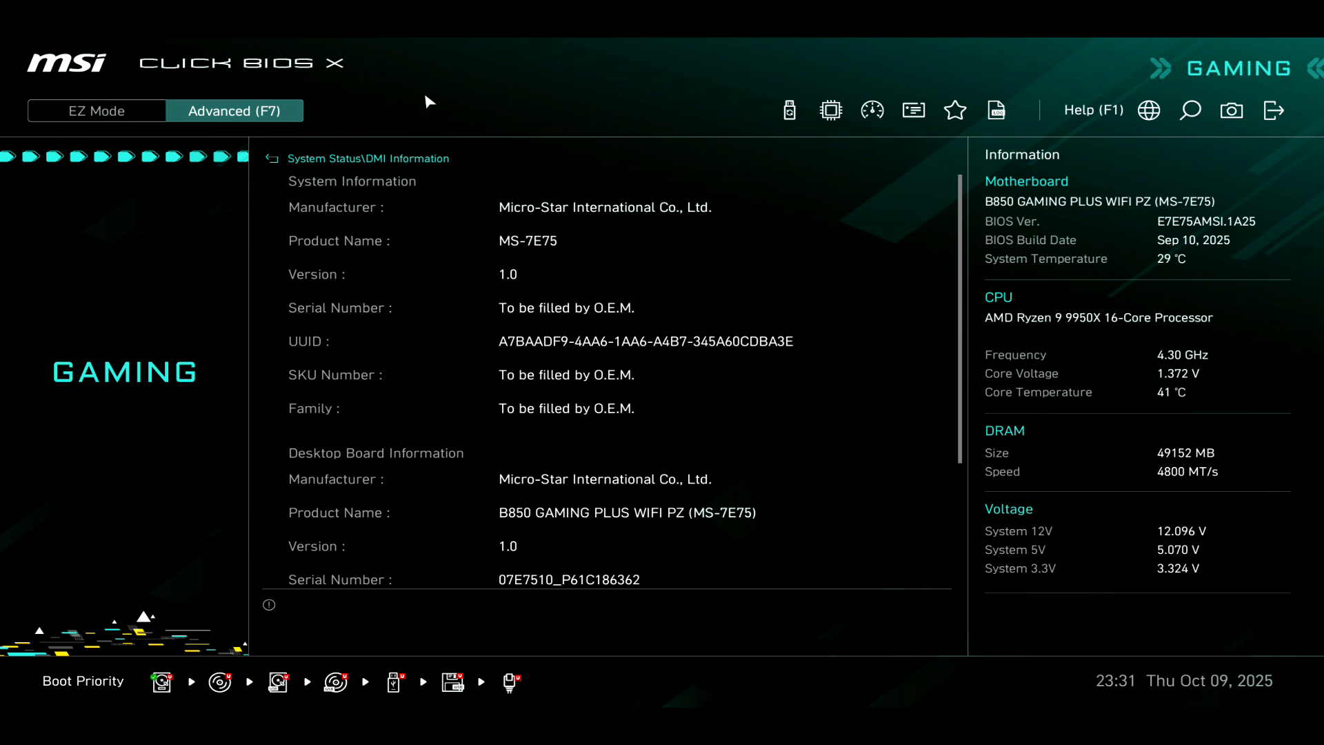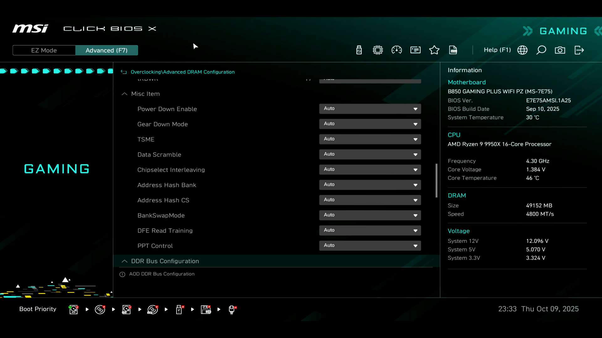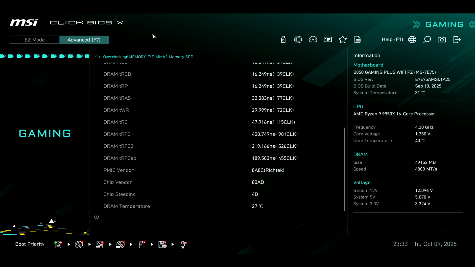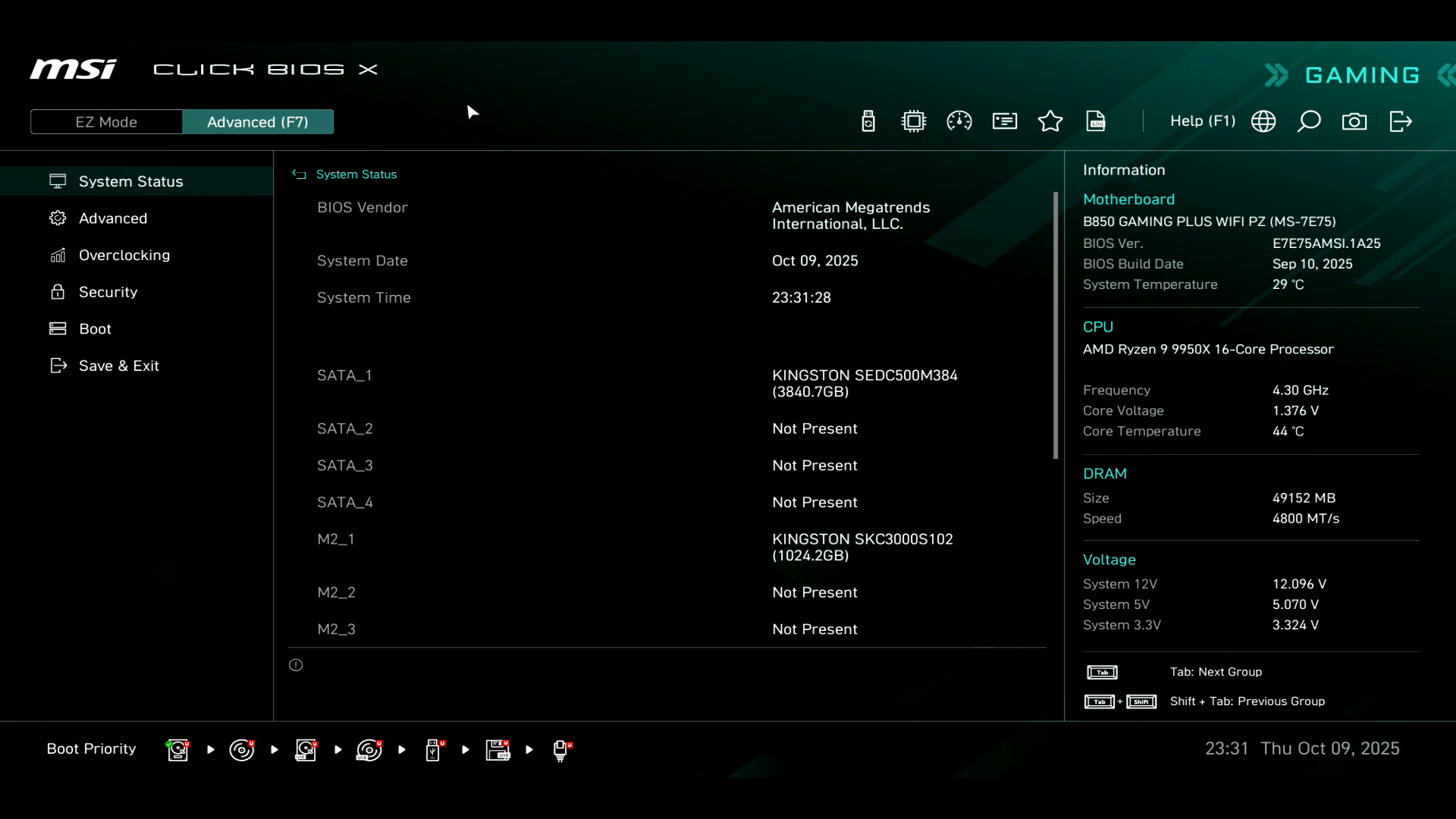 MSI B850 Gaming Plus WiFi Project Zero управляется MSI Click BIOS X. Настройка происходит в режимах EZ Mode и Advanced Mode.