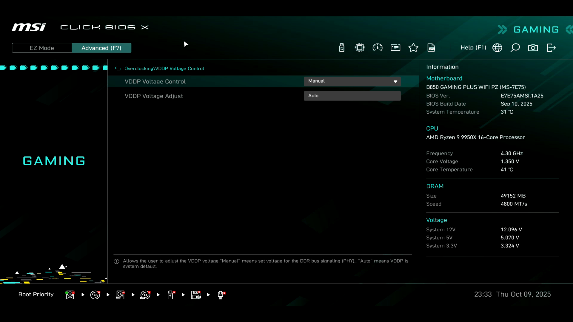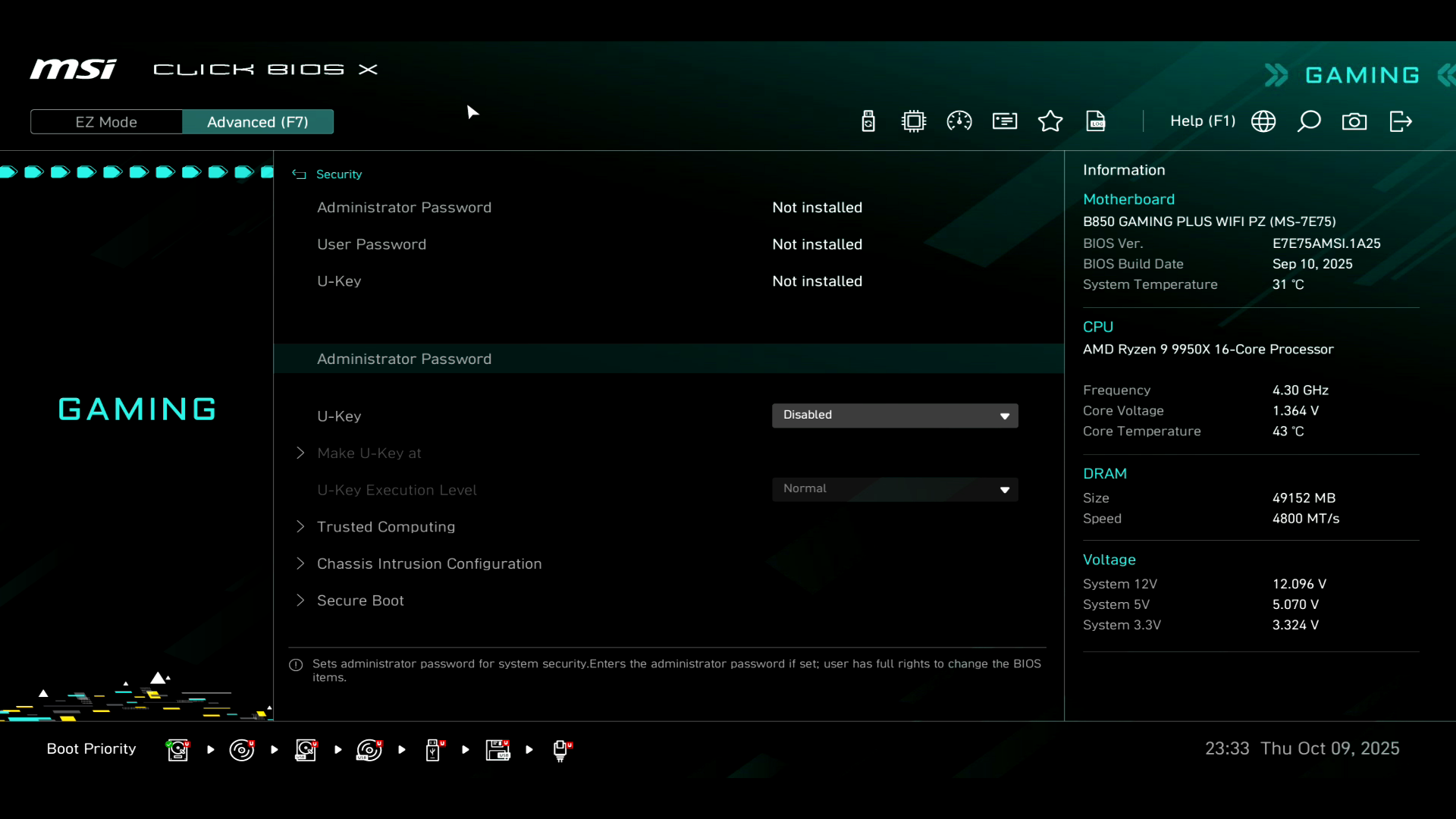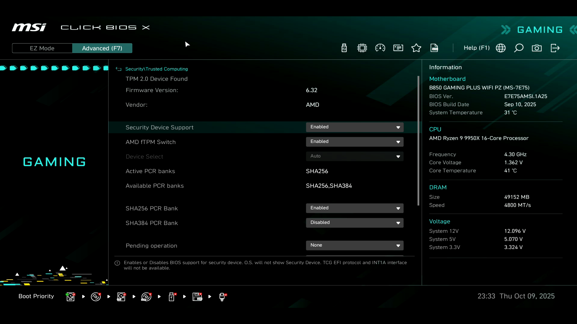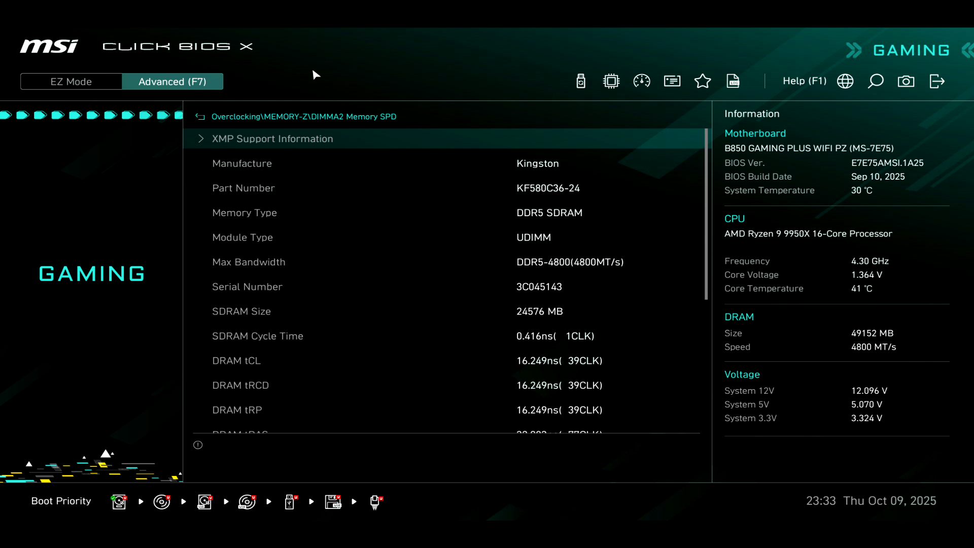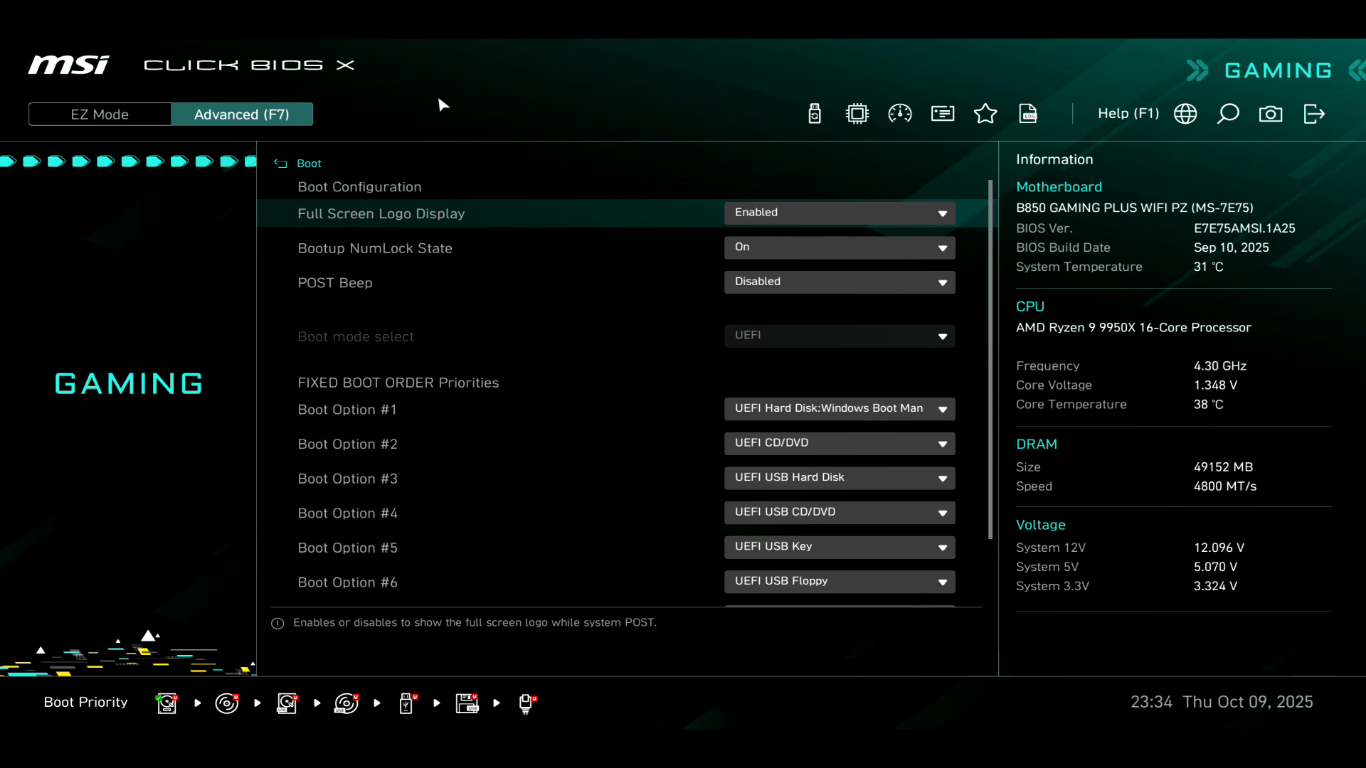 MSI B850 Gaming Plus WiFi Project Zero управляется MSI Click BIOS X. Настройка происходит в режимах EZ Mode и Advanced Mode.