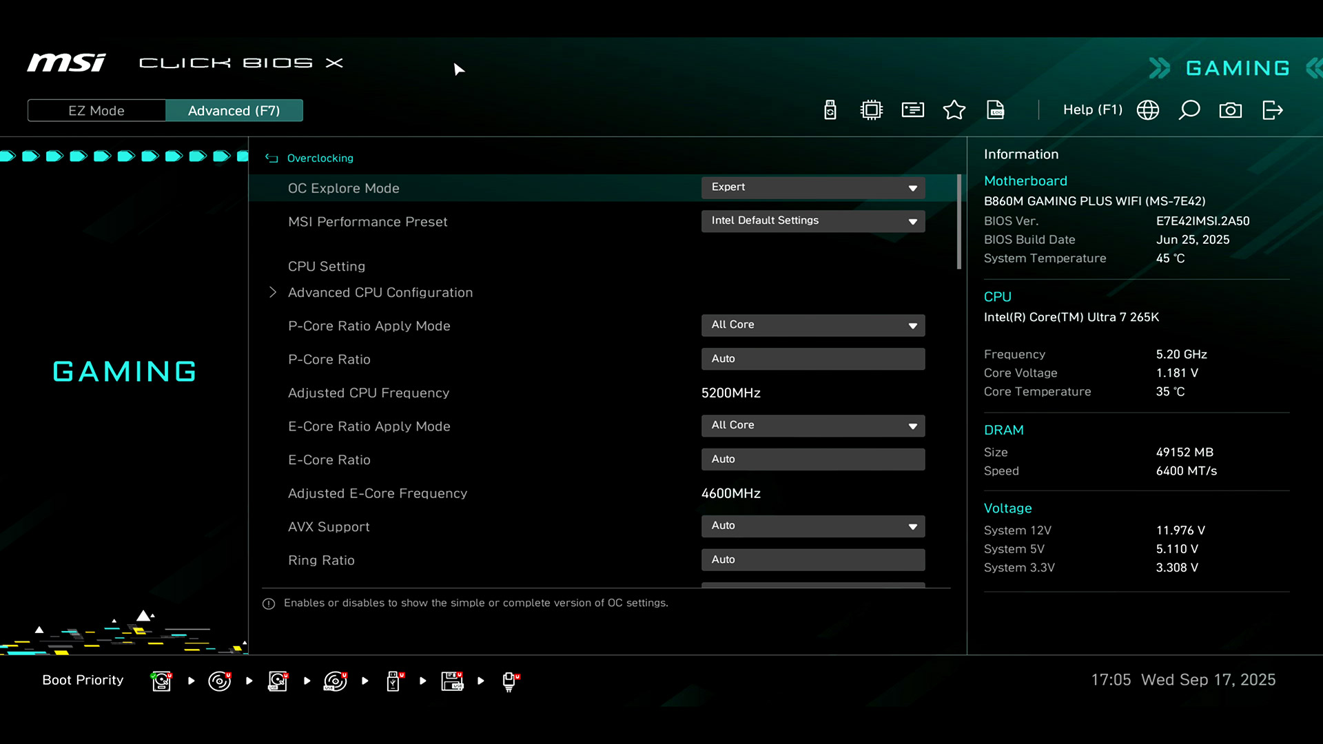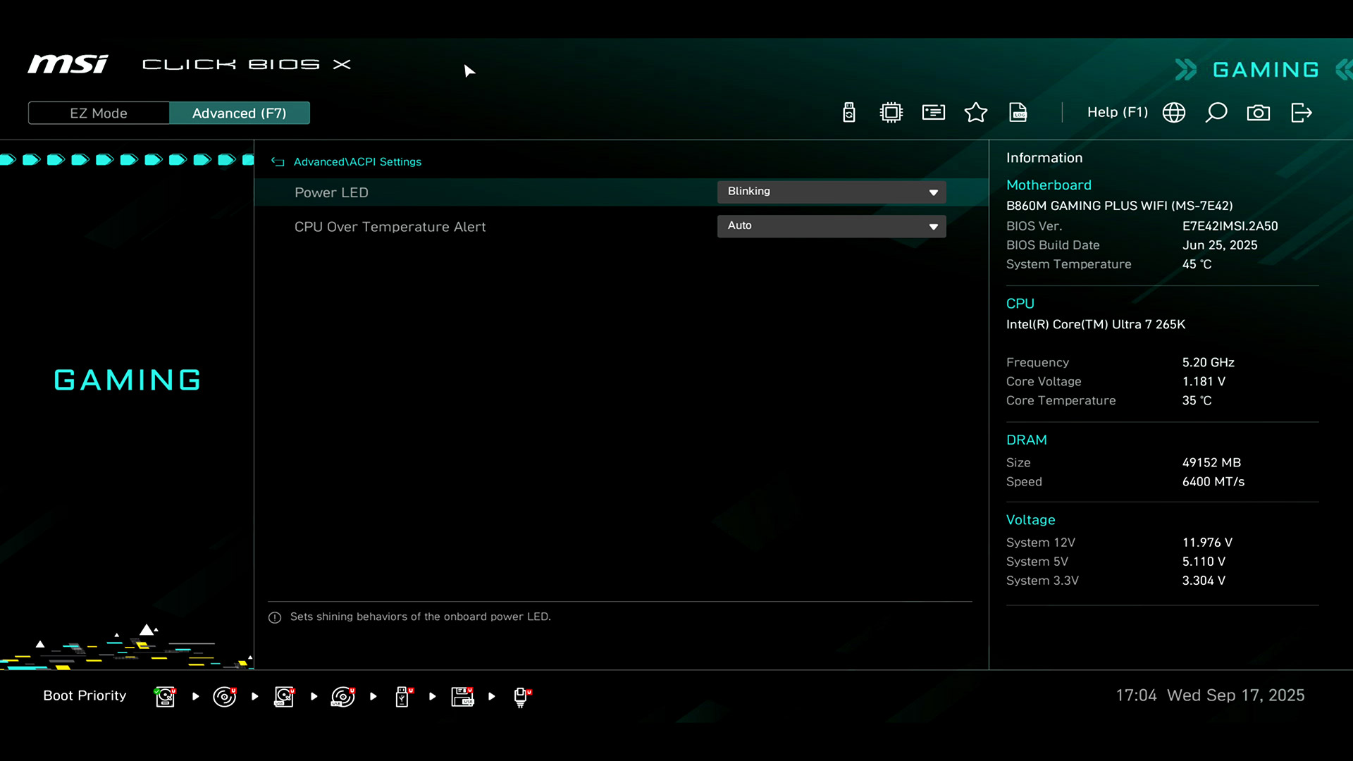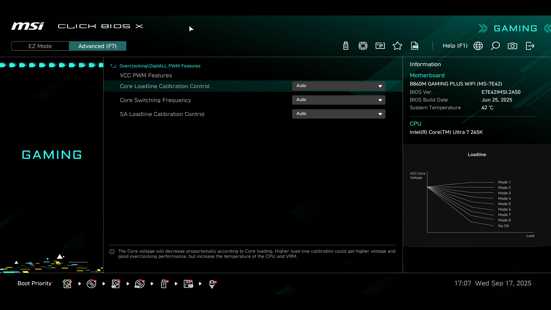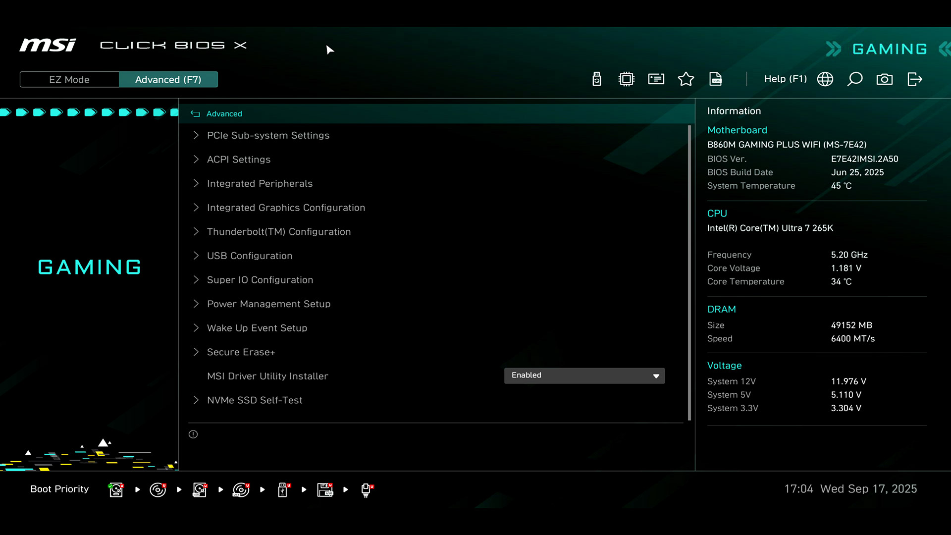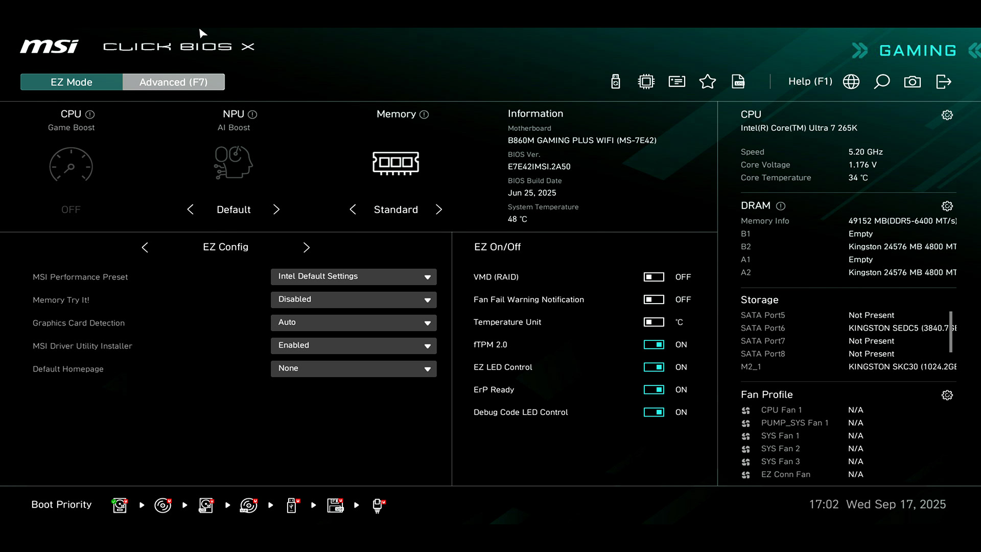 MSI B860M Gaming Plus WiFi управляется через интерфейс MSI Click BIOS X, который оперируется в режимах EZ Mode и Advanced Mode.