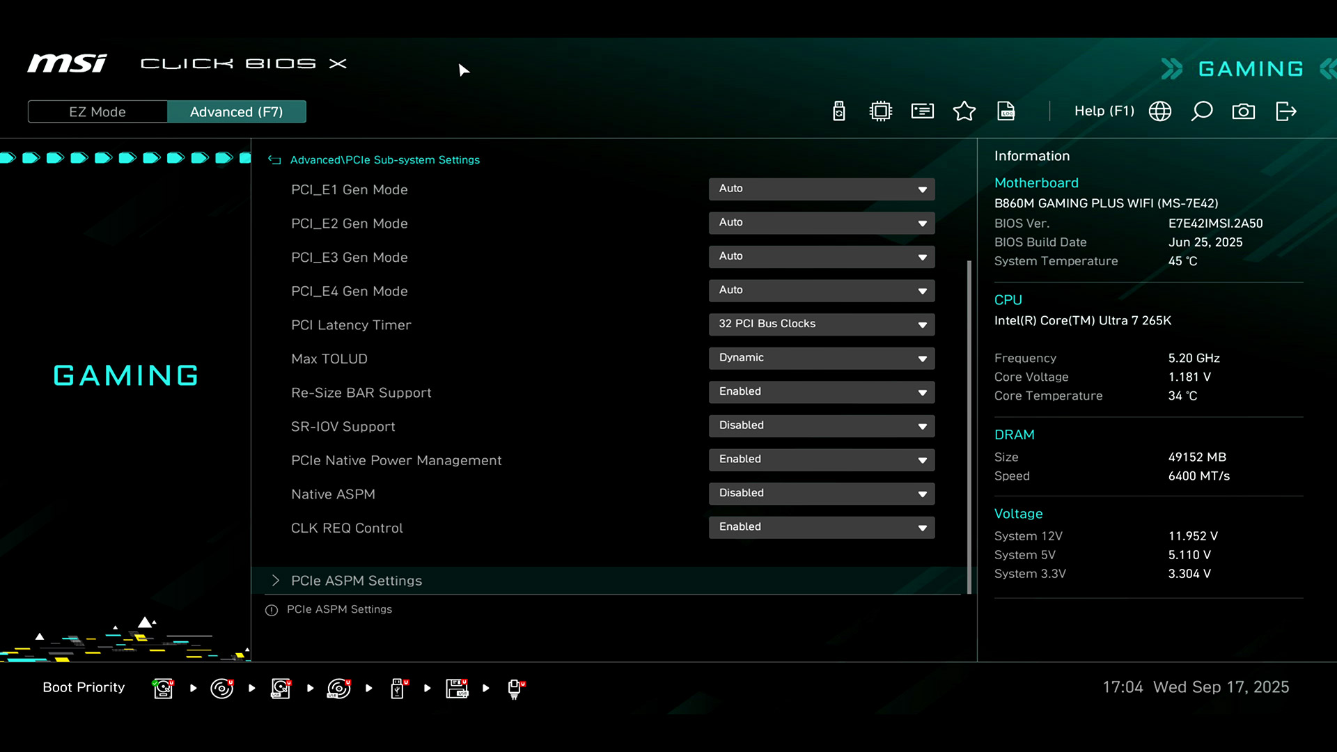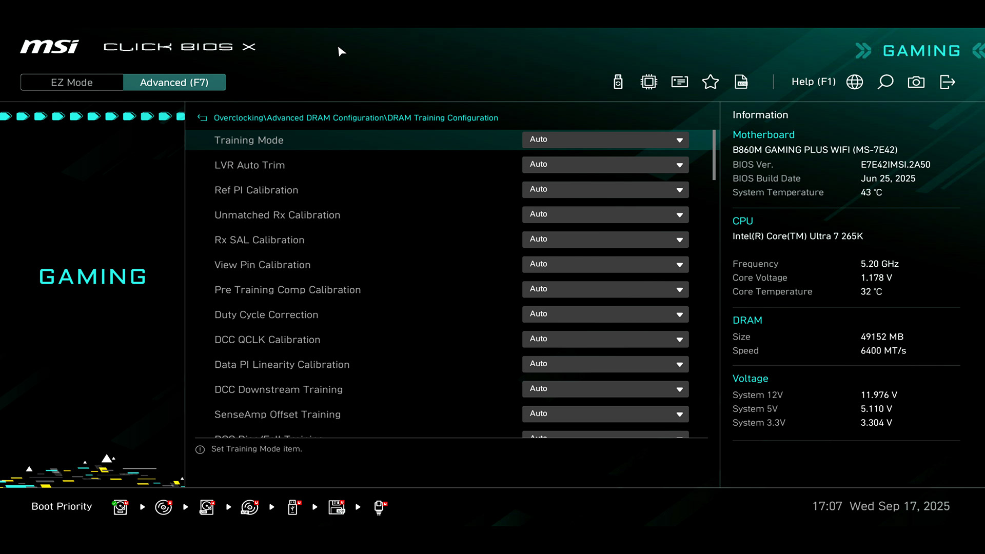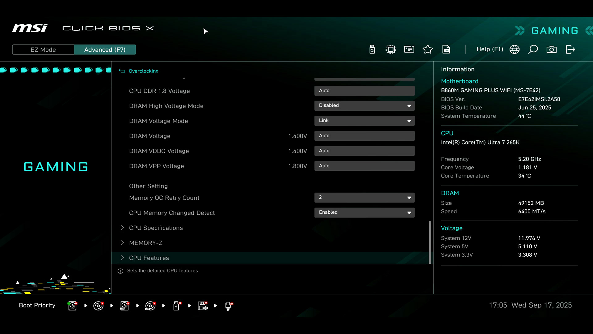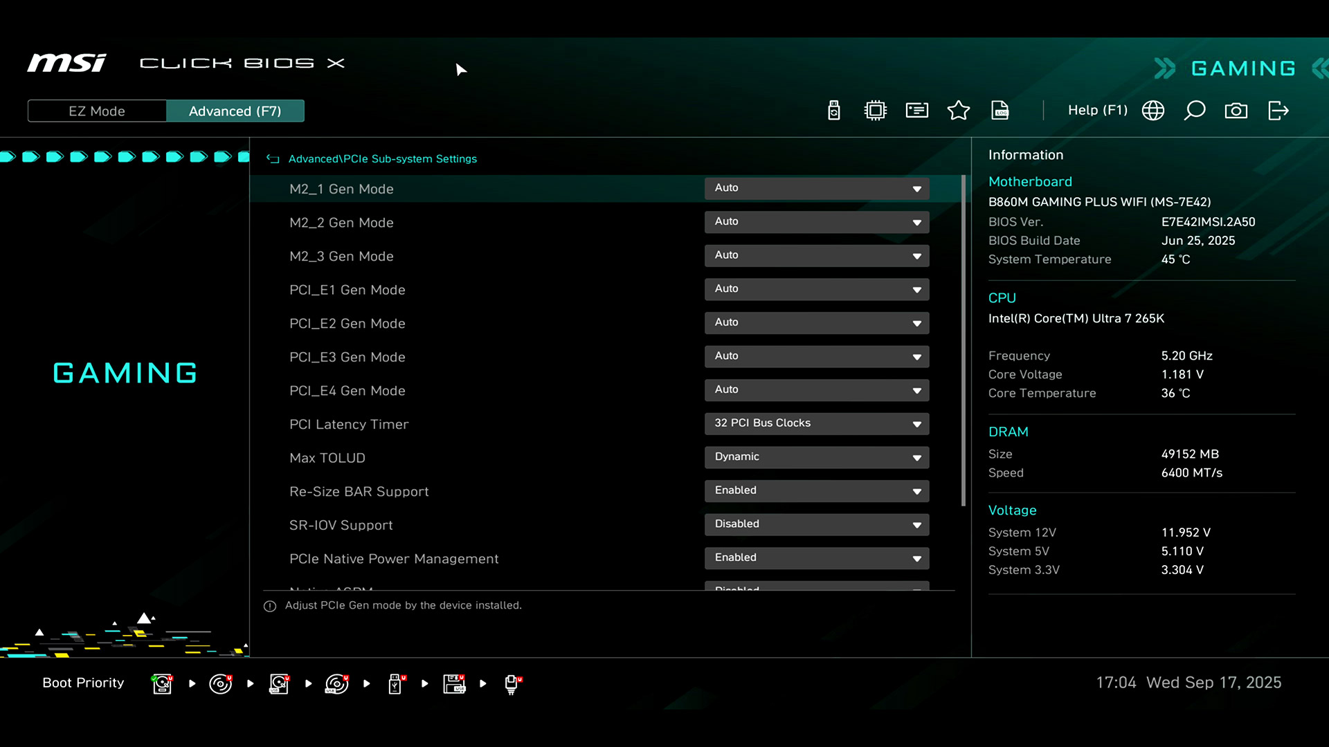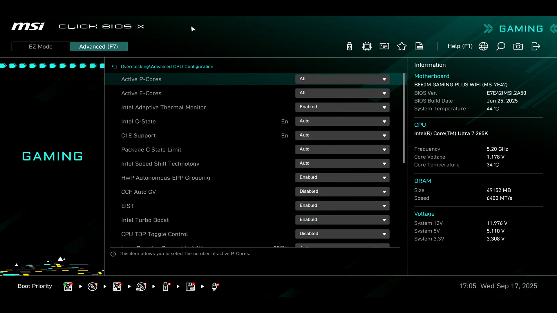 MSI B860M Gaming Plus WiFi управляется через интерфейс MSI Click BIOS X, который оперируется в режимах EZ Mode и Advanced Mode.