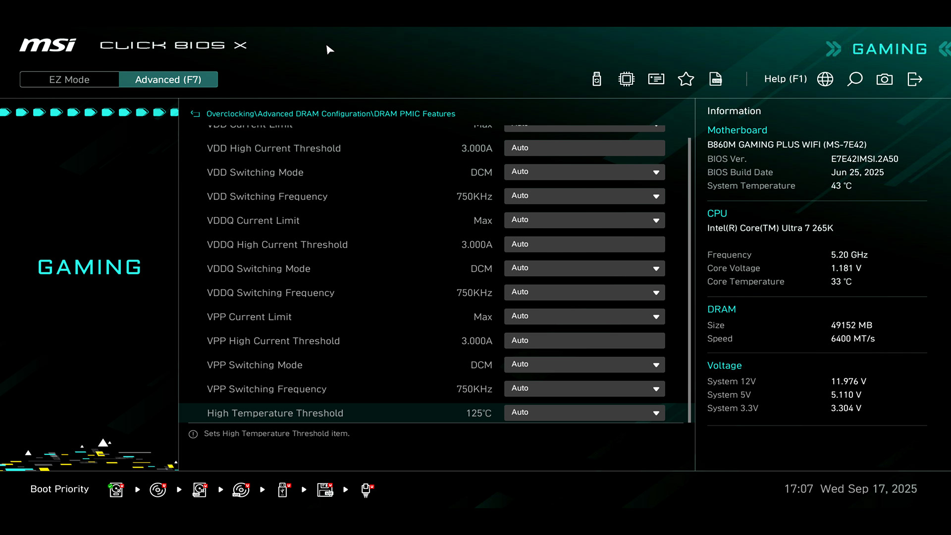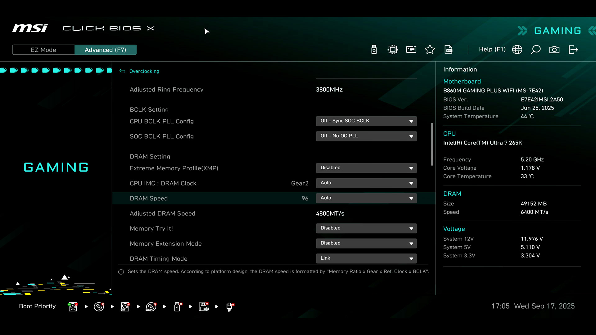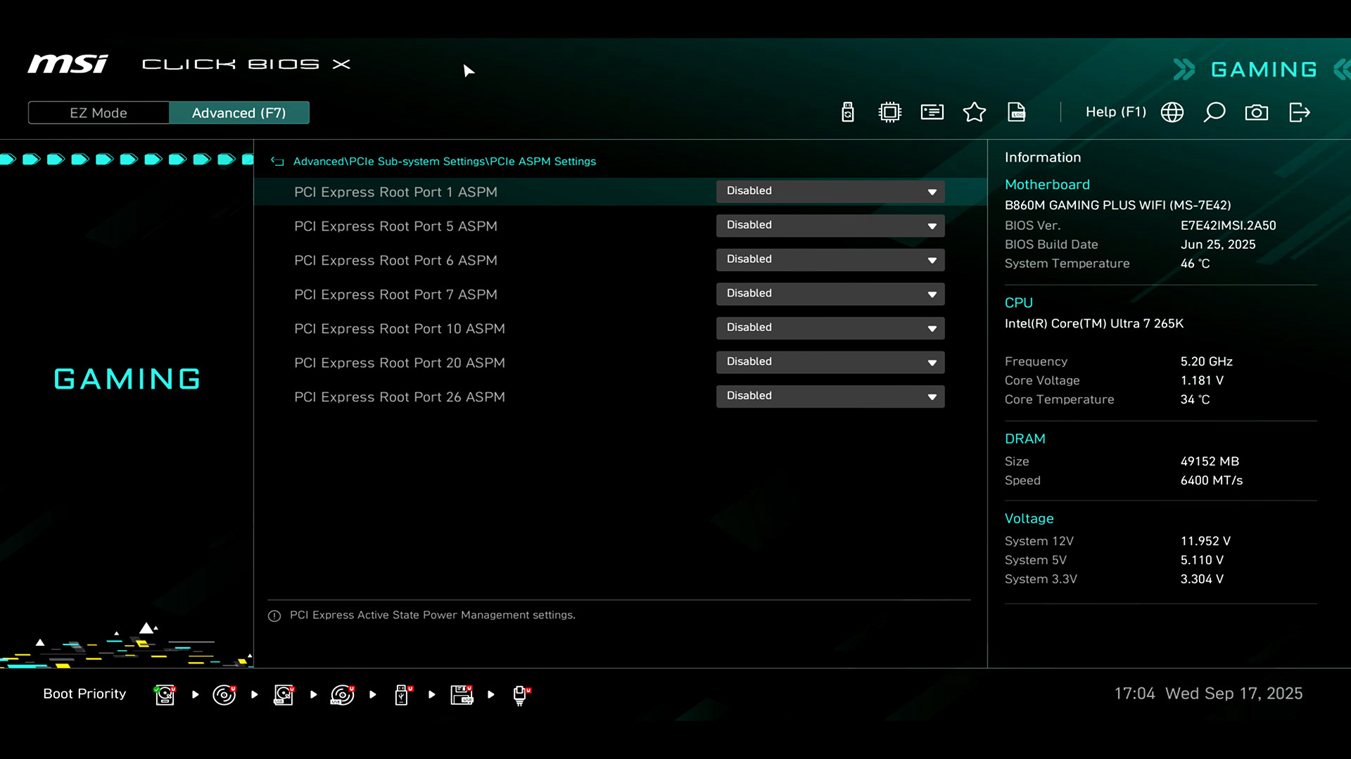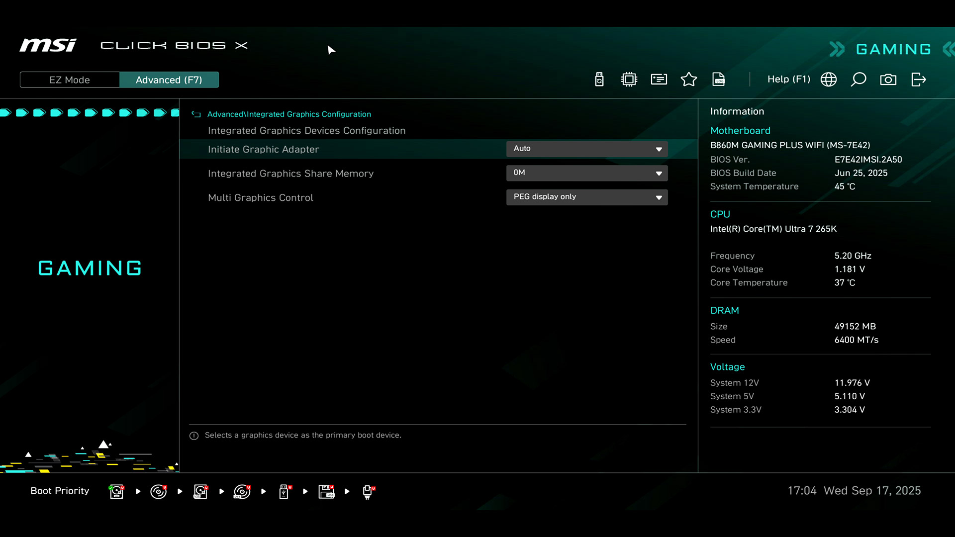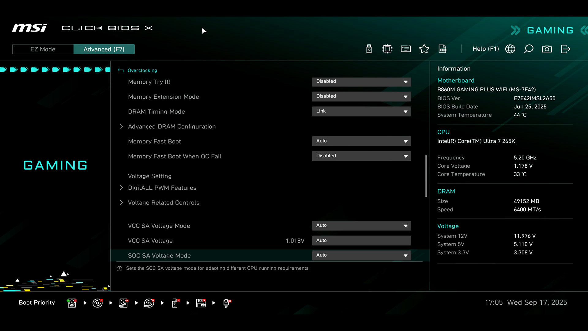 MSI B860M Gaming Plus WiFi управляется через интерфейс MSI Click BIOS X, который оперируется в режимах EZ Mode и Advanced Mode.