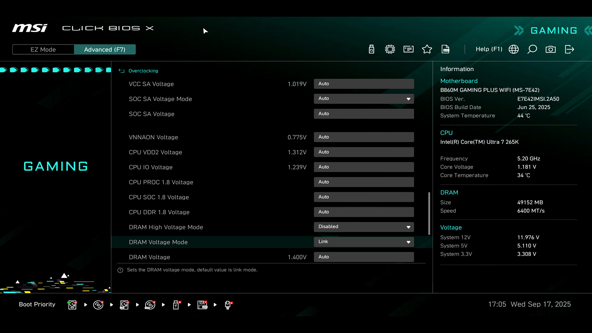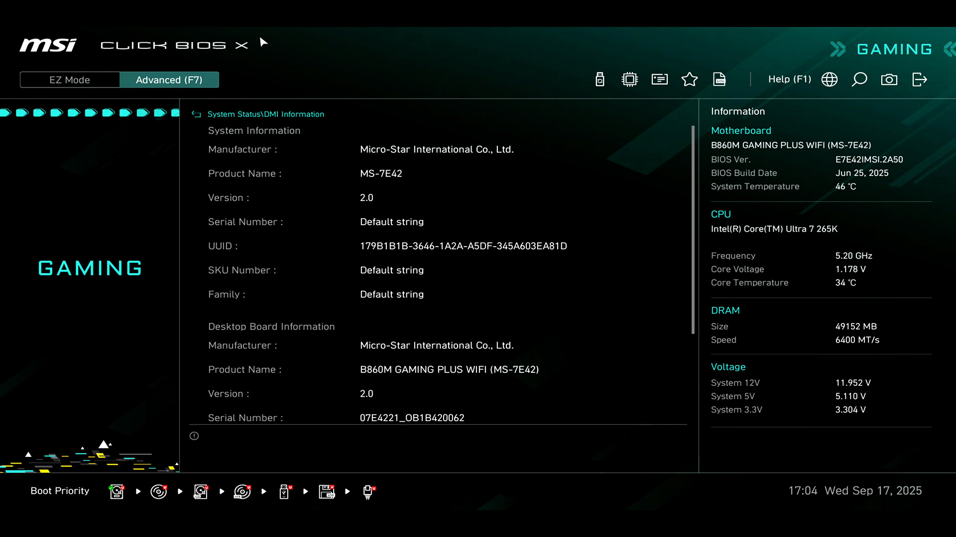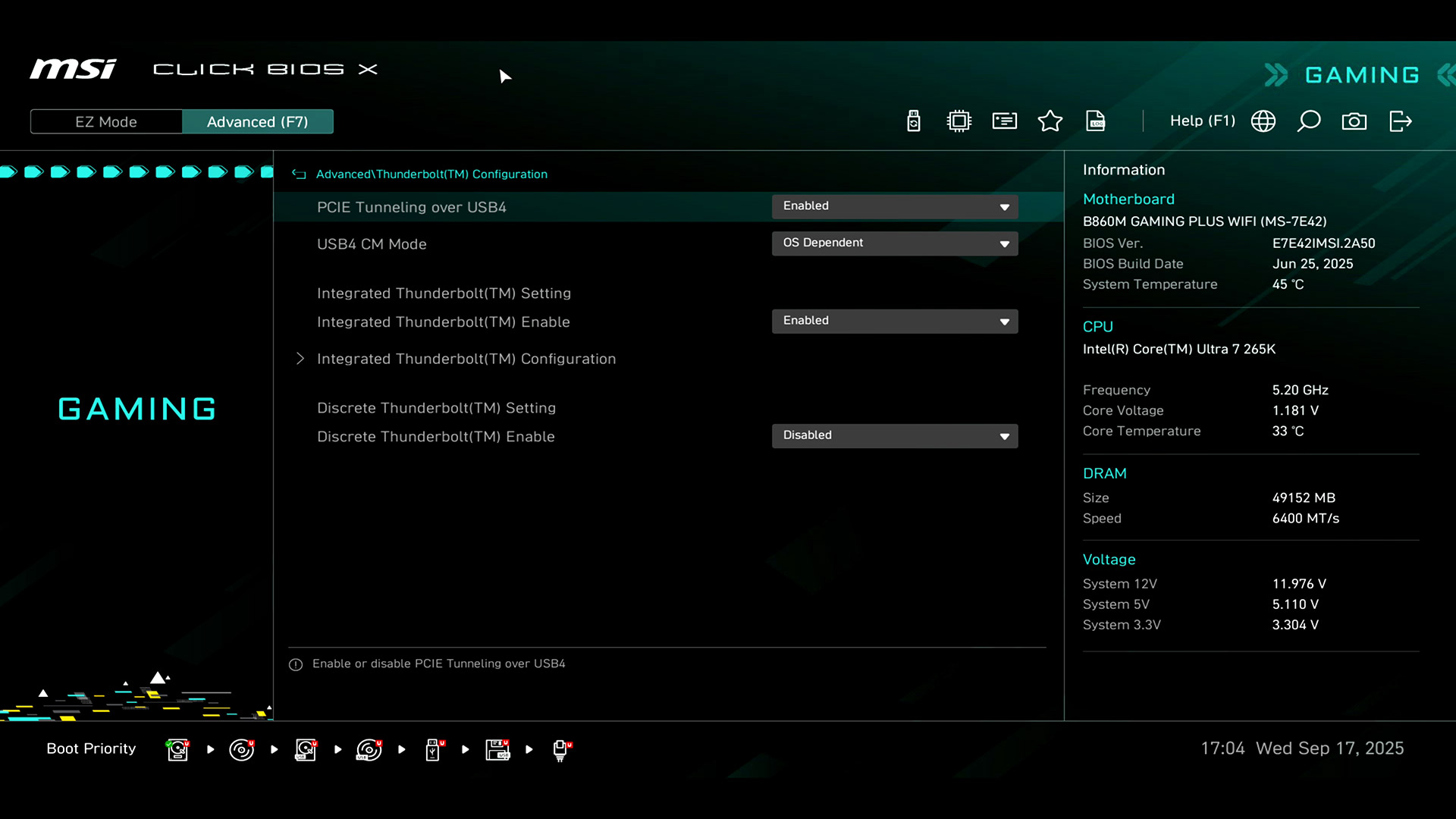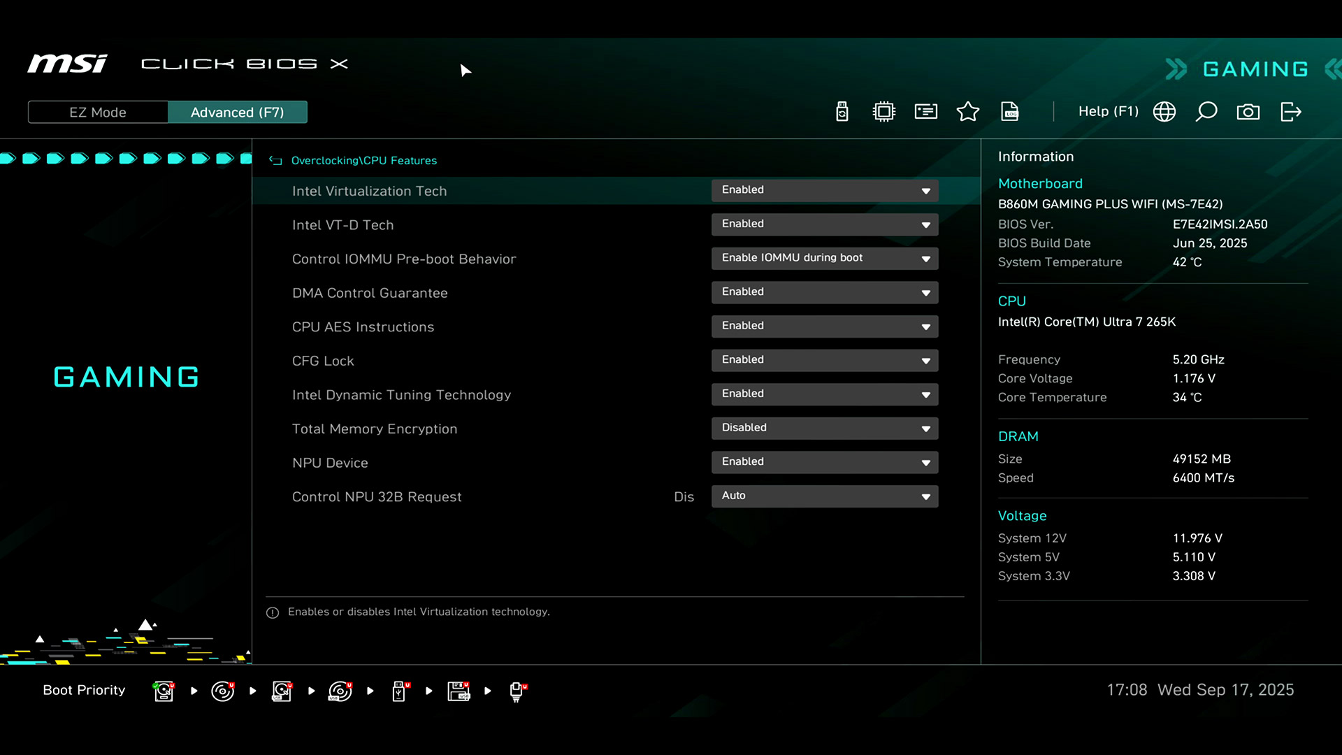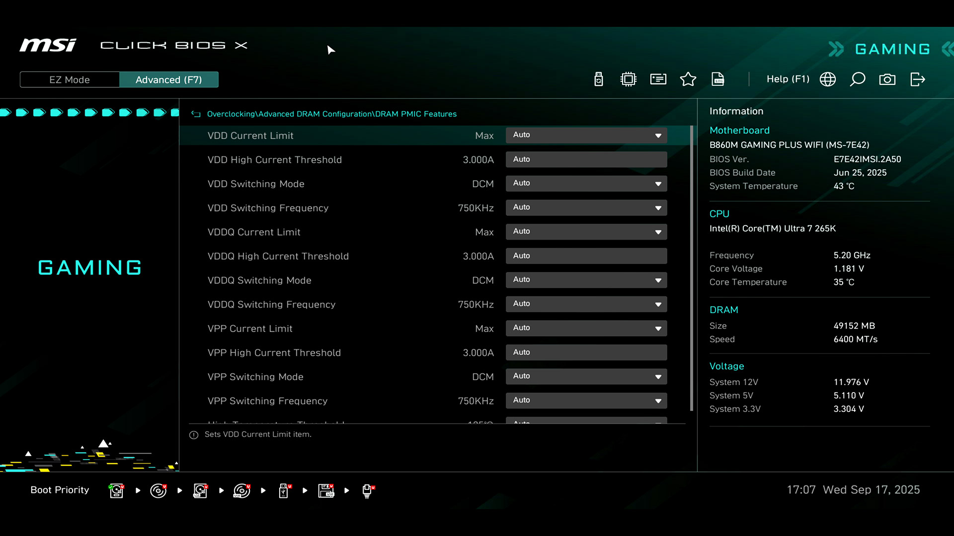 MSI B860M Gaming Plus WiFi управляется через интерфейс MSI Click BIOS X, который оперируется в режимах EZ Mode и Advanced Mode.