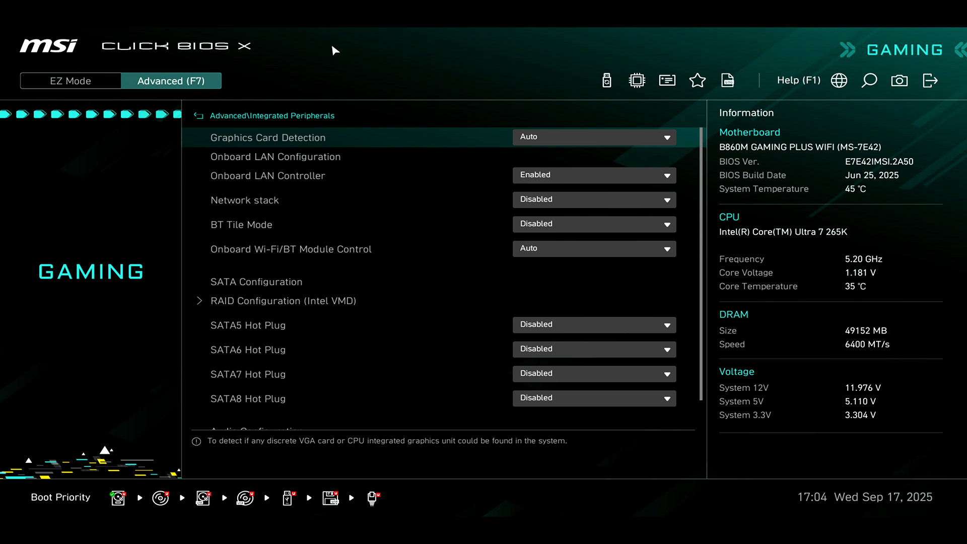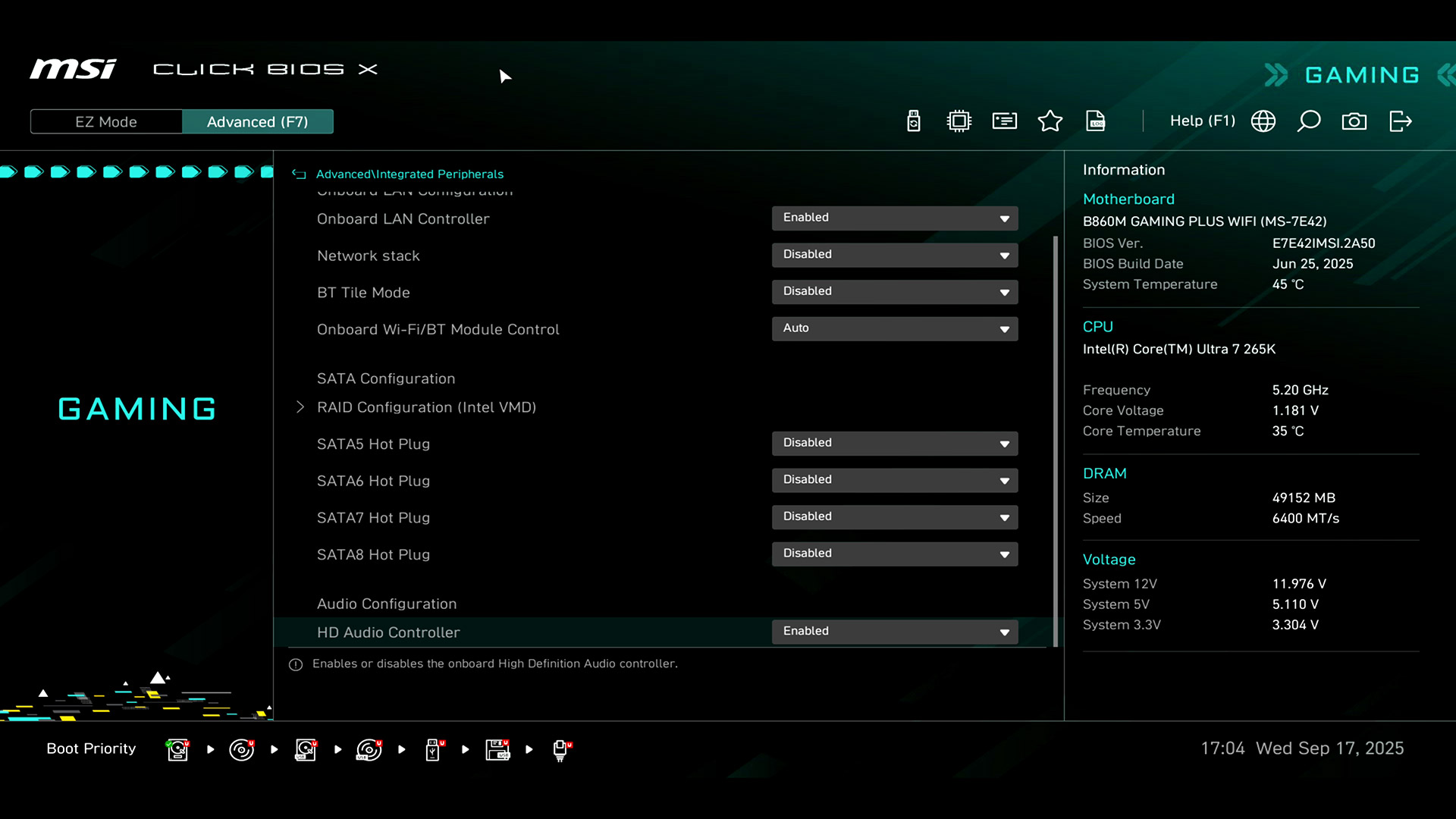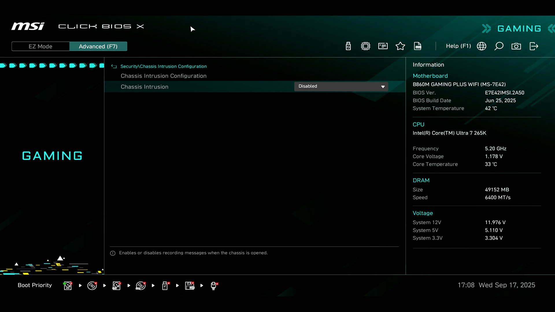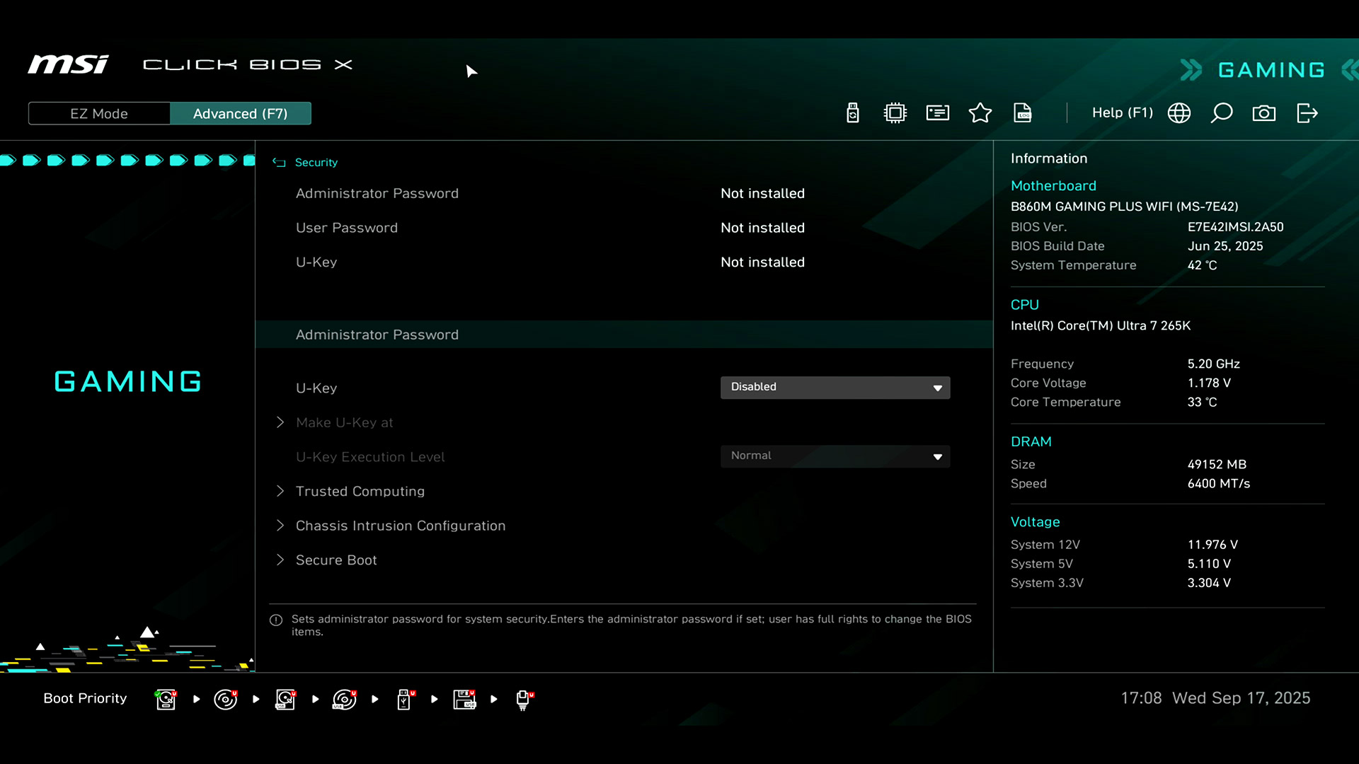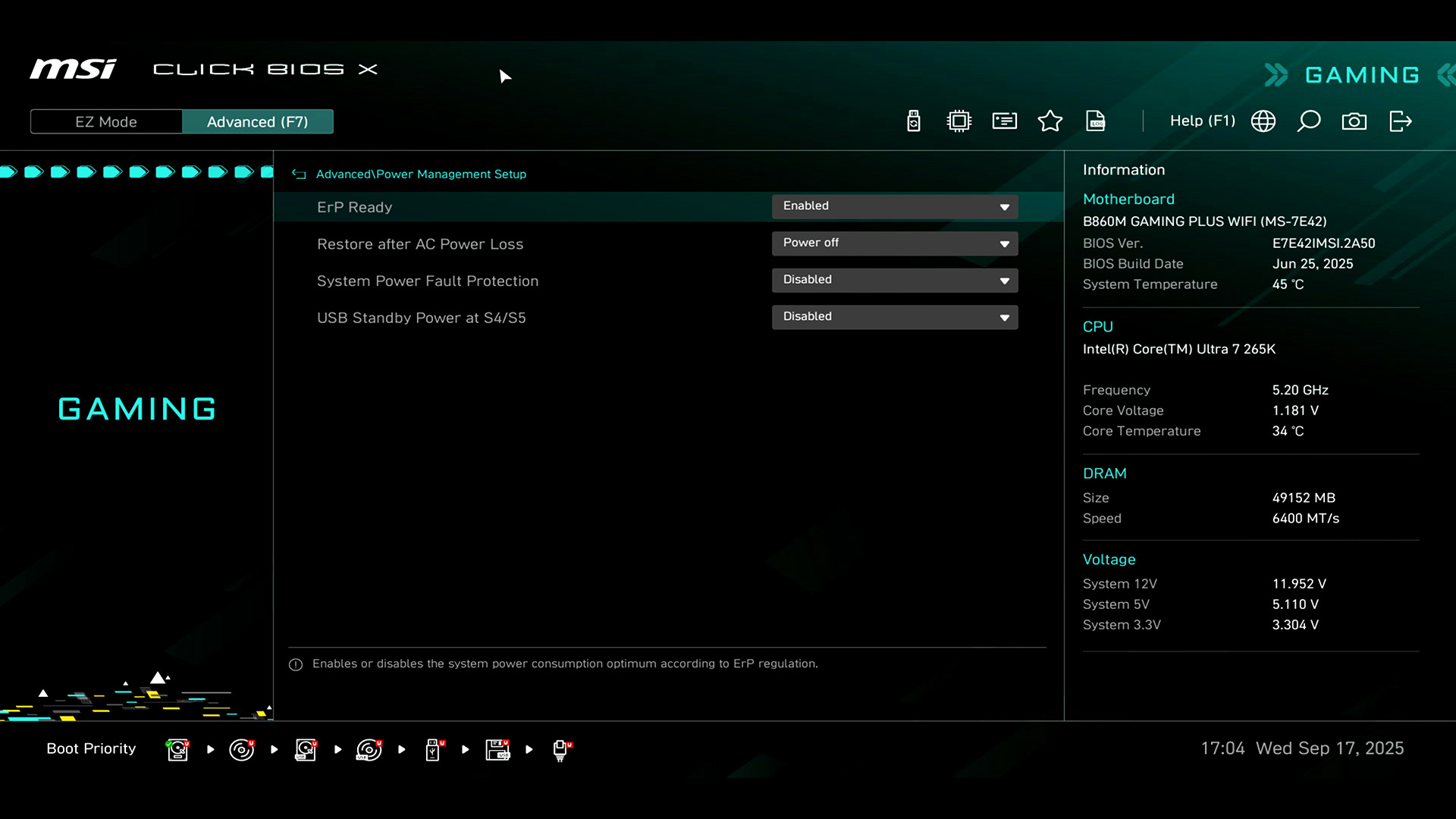 MSI B860M Gaming Plus WiFi управляется через интерфейс MSI Click BIOS X, который оперируется в режимах EZ Mode и Advanced Mode.