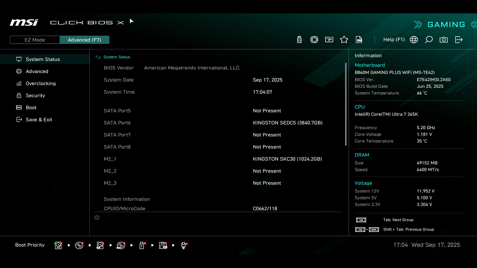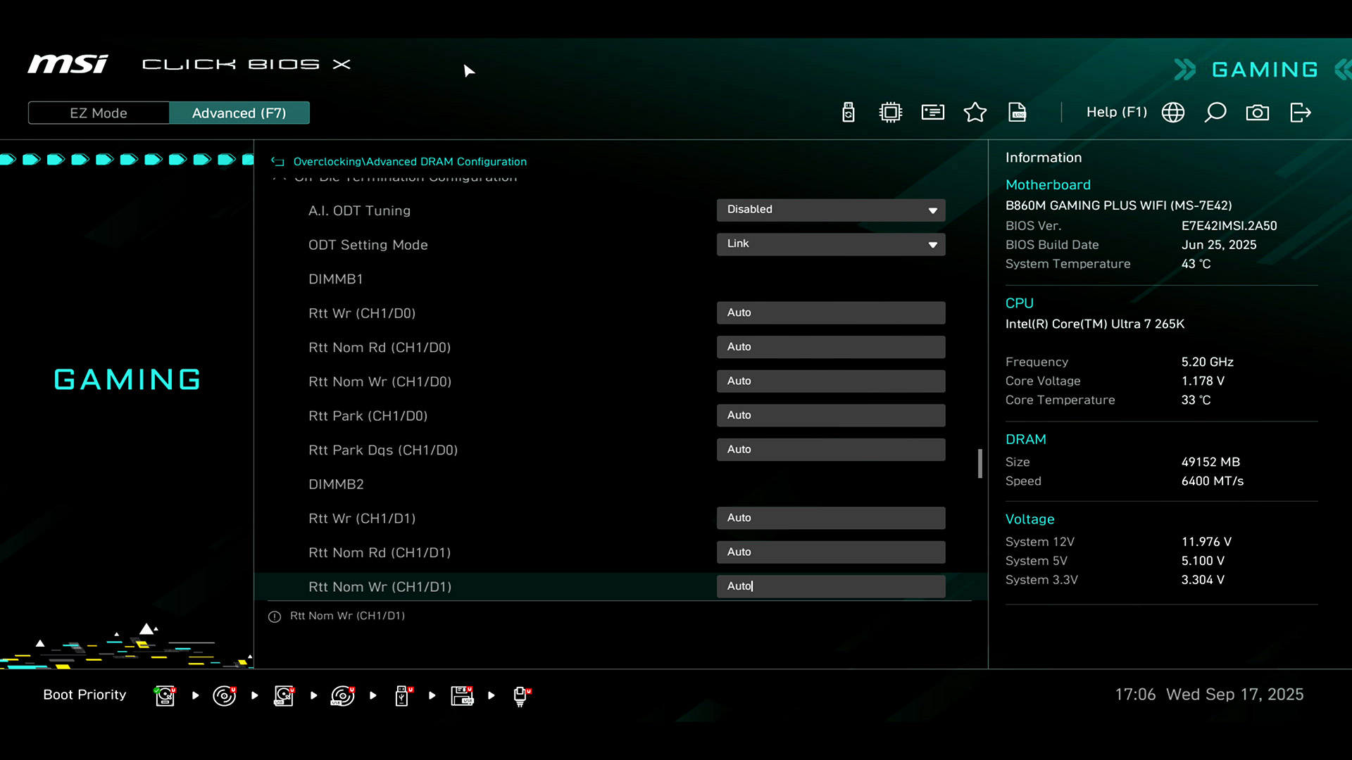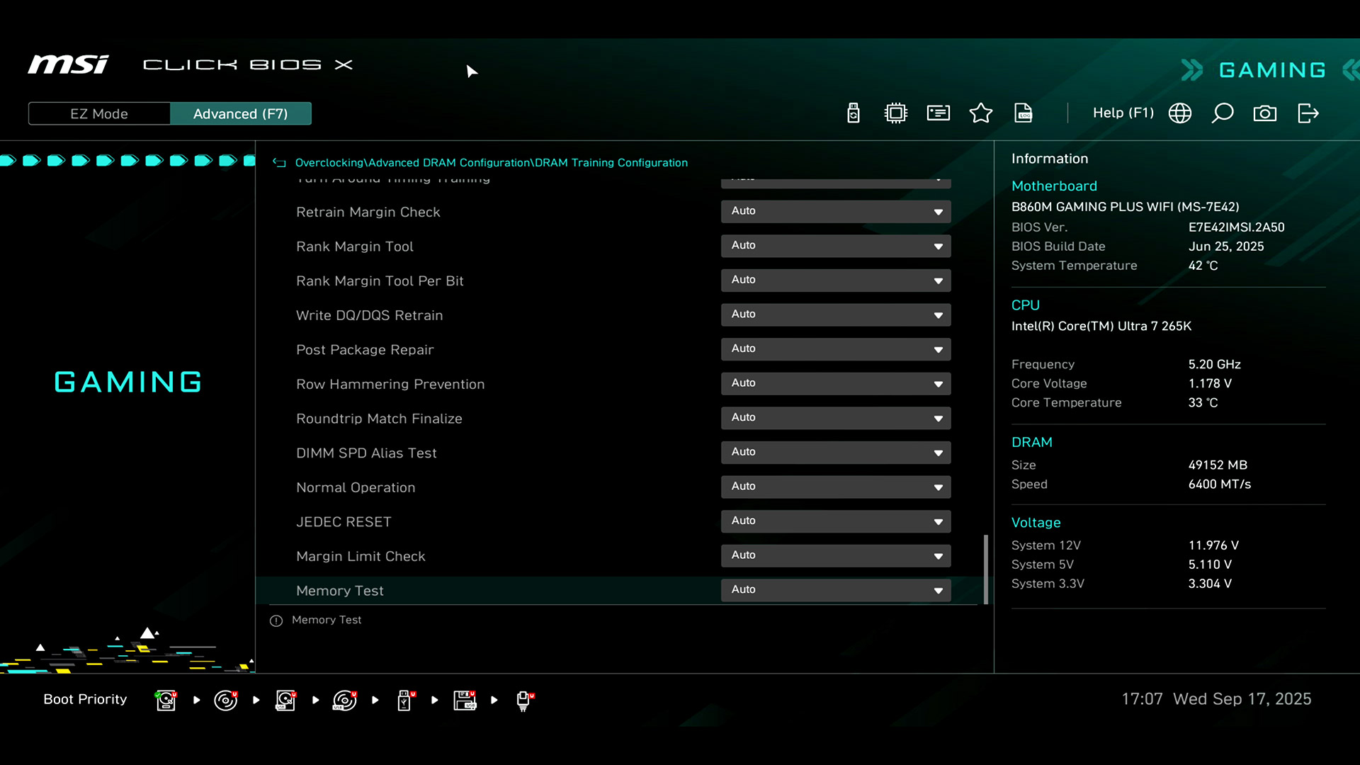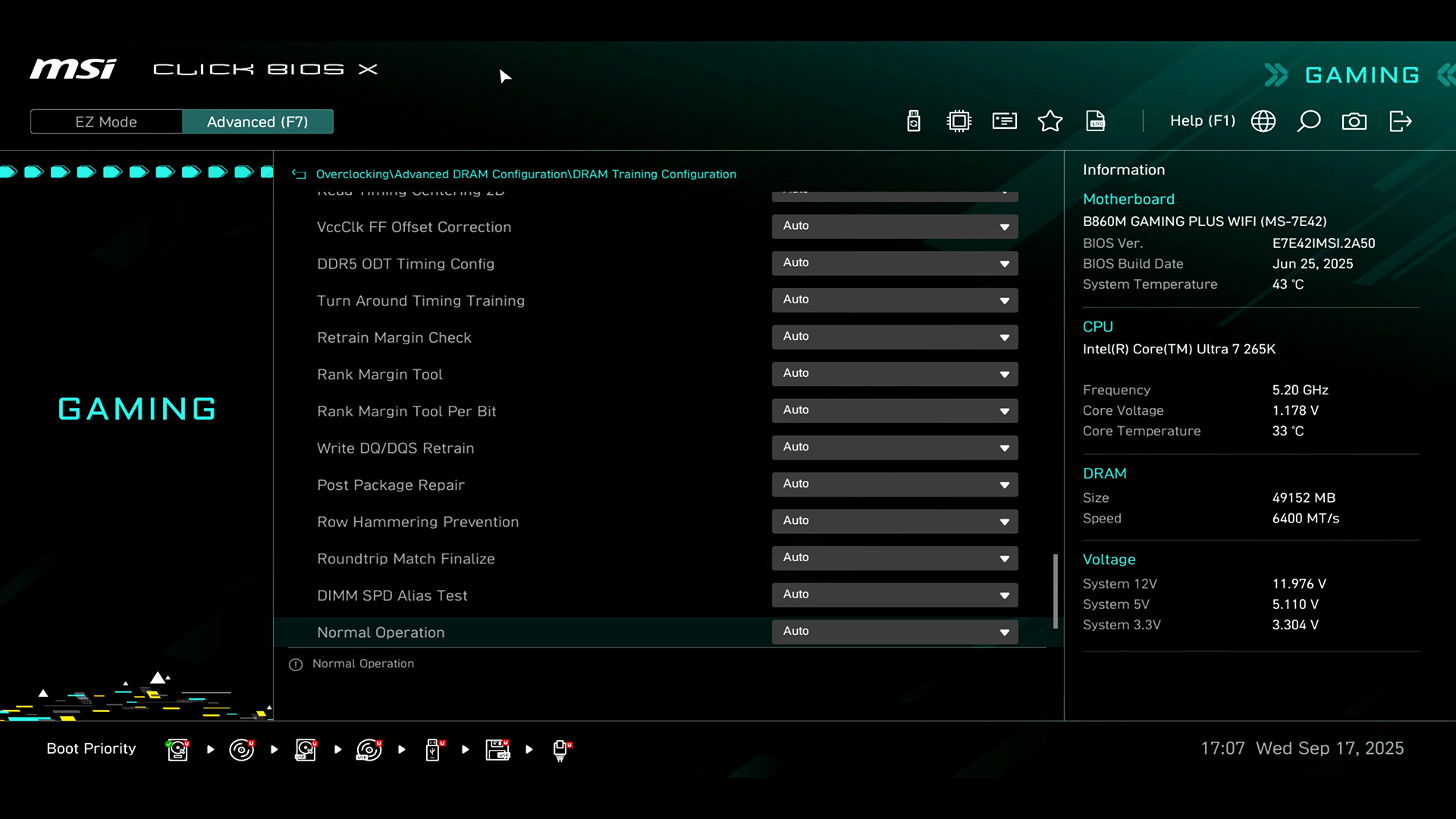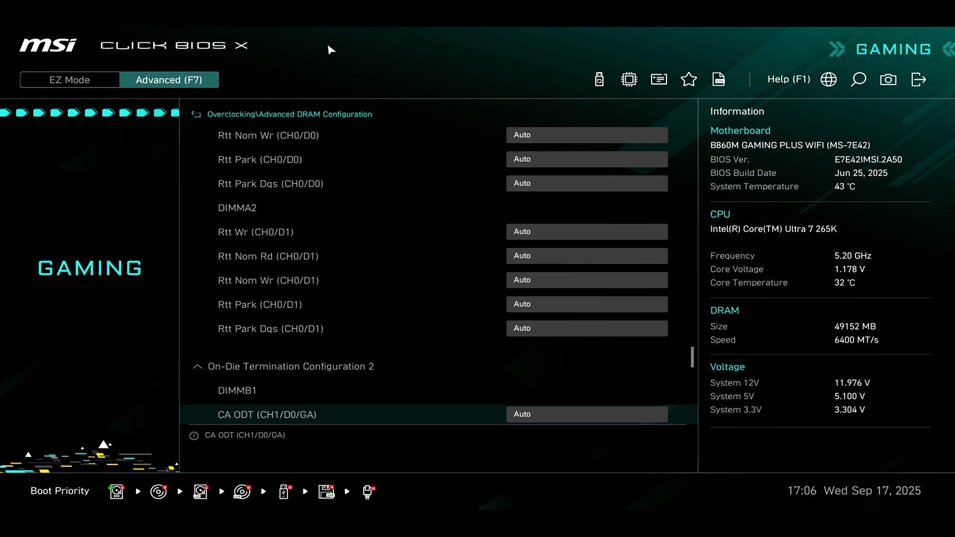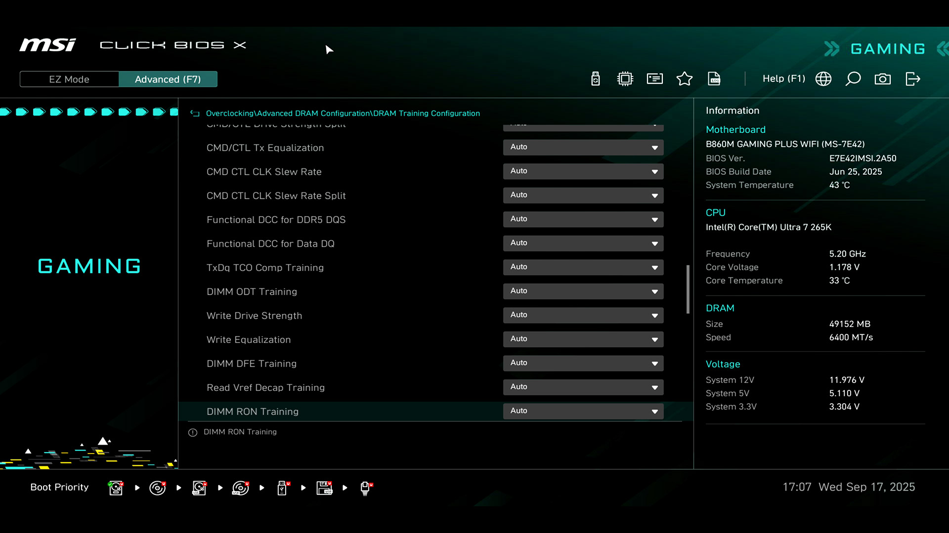 MSI B860M Gaming Plus WiFi управляется через интерфейс MSI Click BIOS X, который оперируется в режимах EZ Mode и Advanced Mode.
