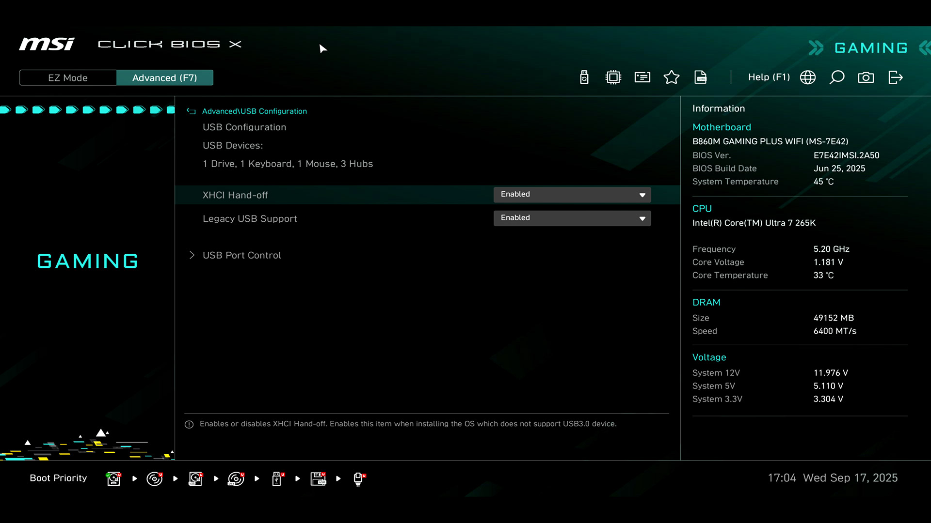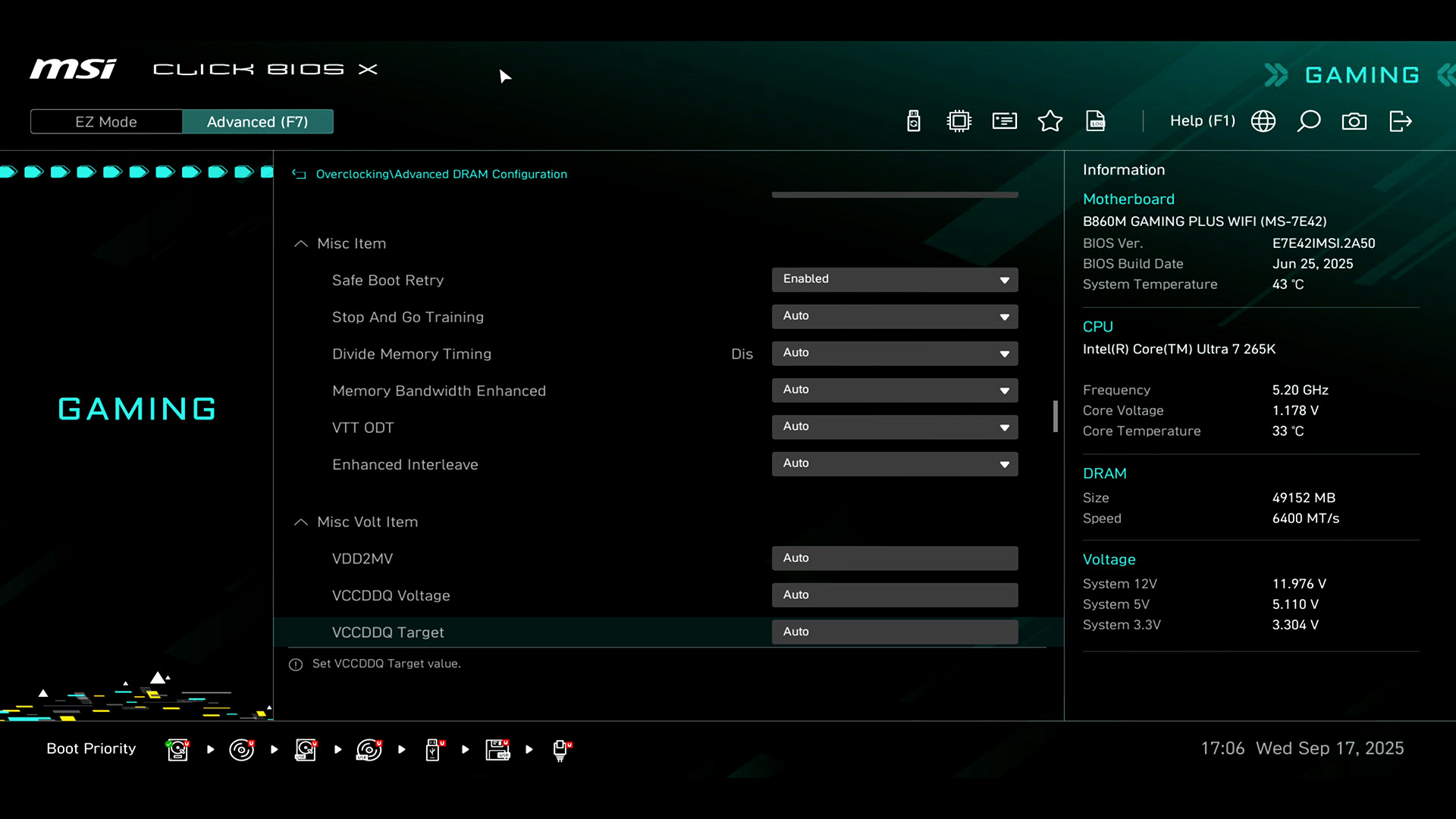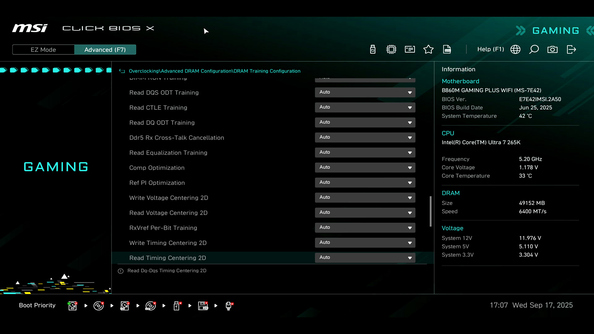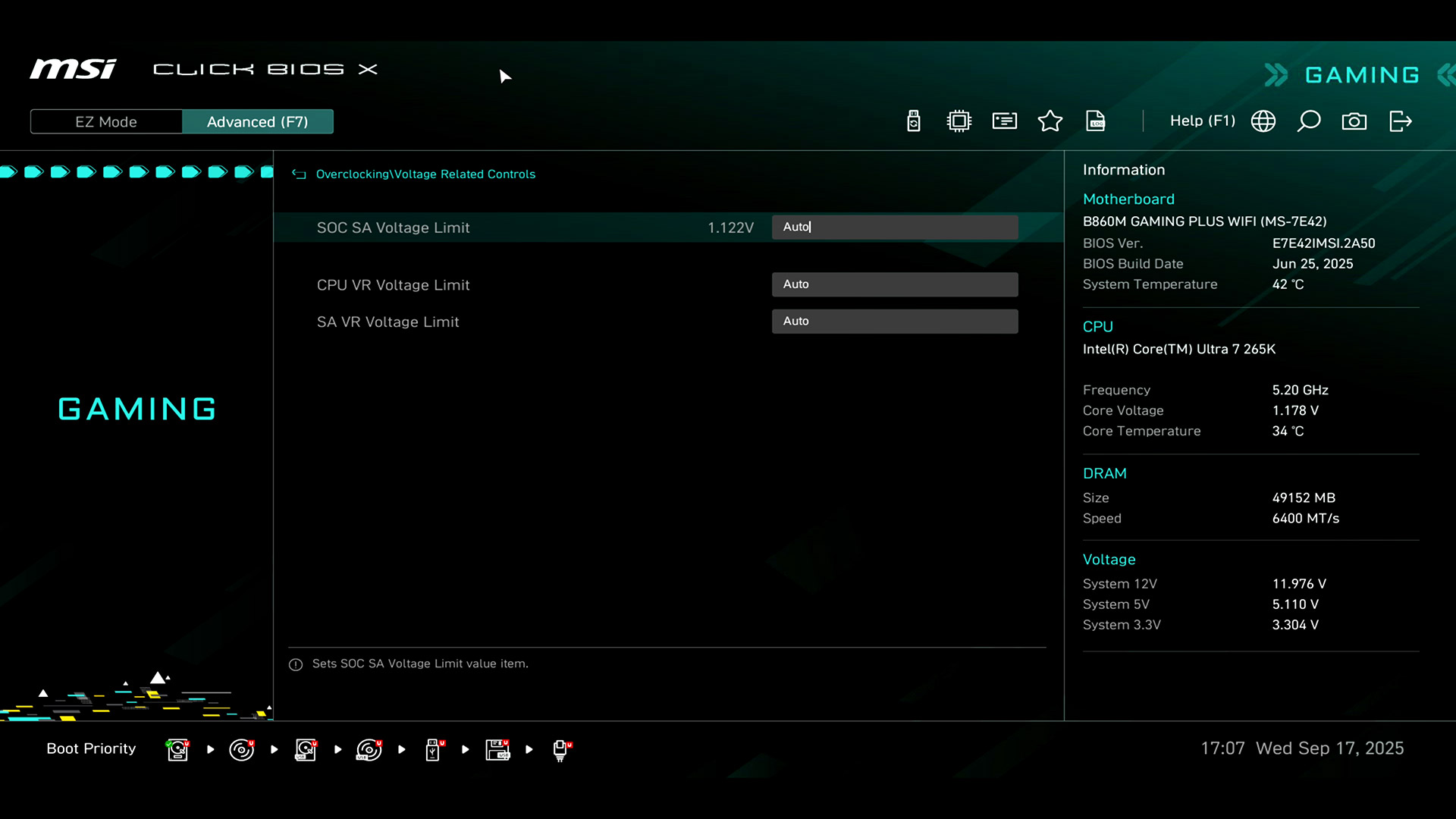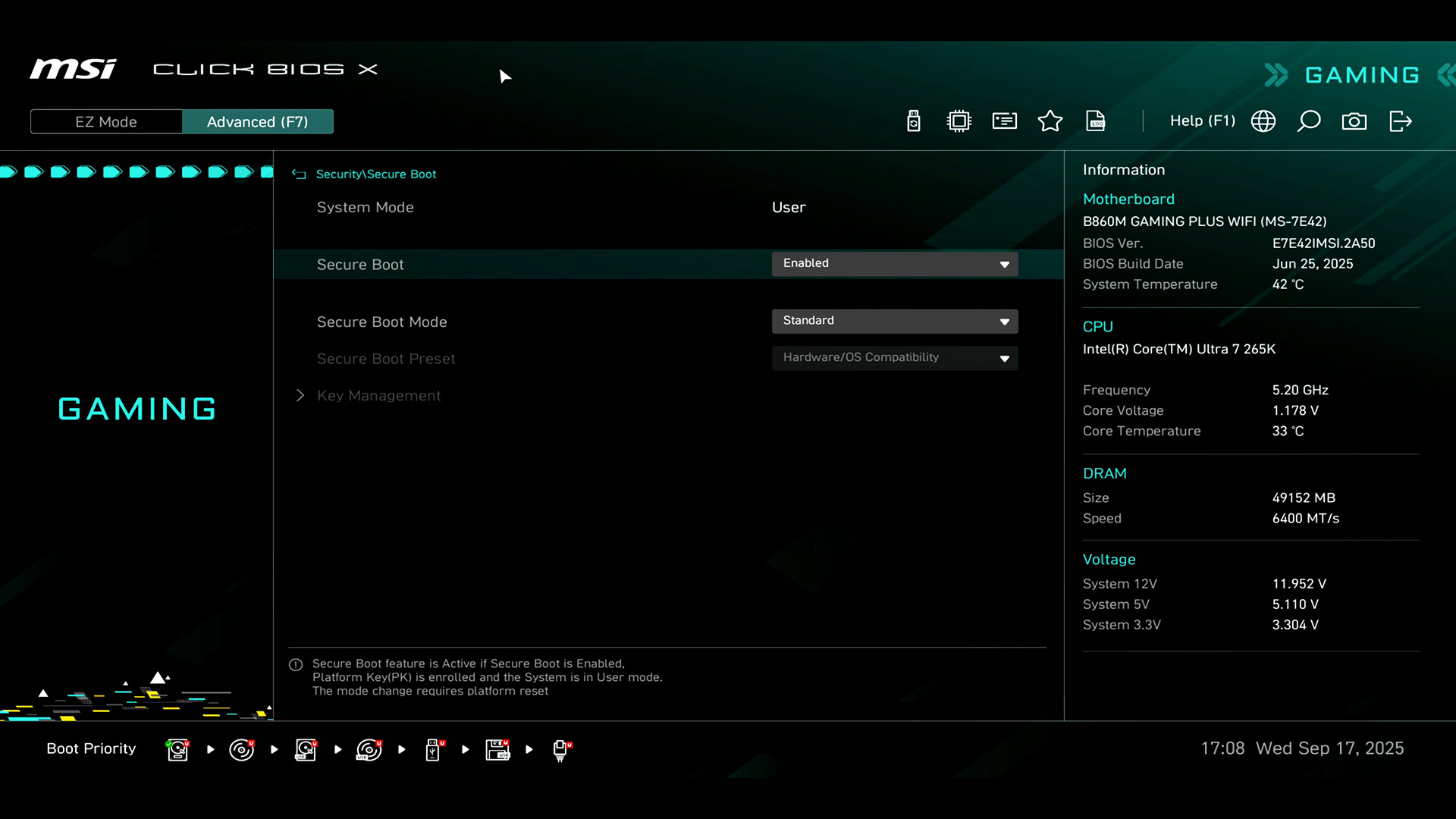MSI B860M Gaming Plus WiFi управляется через интерфейс MSI Click BIOS X, который оперируется в режимах EZ Mode и Advanced Mode.
